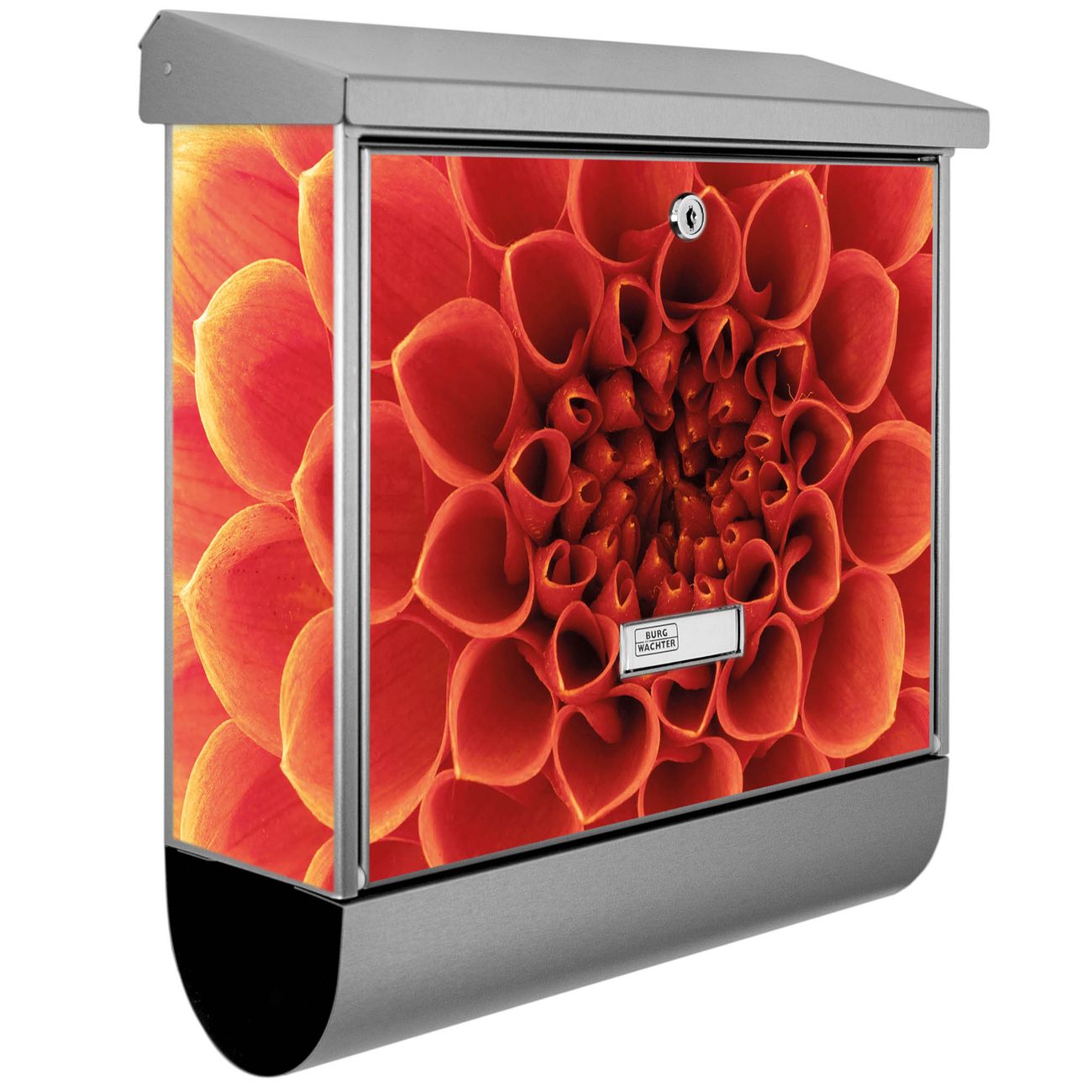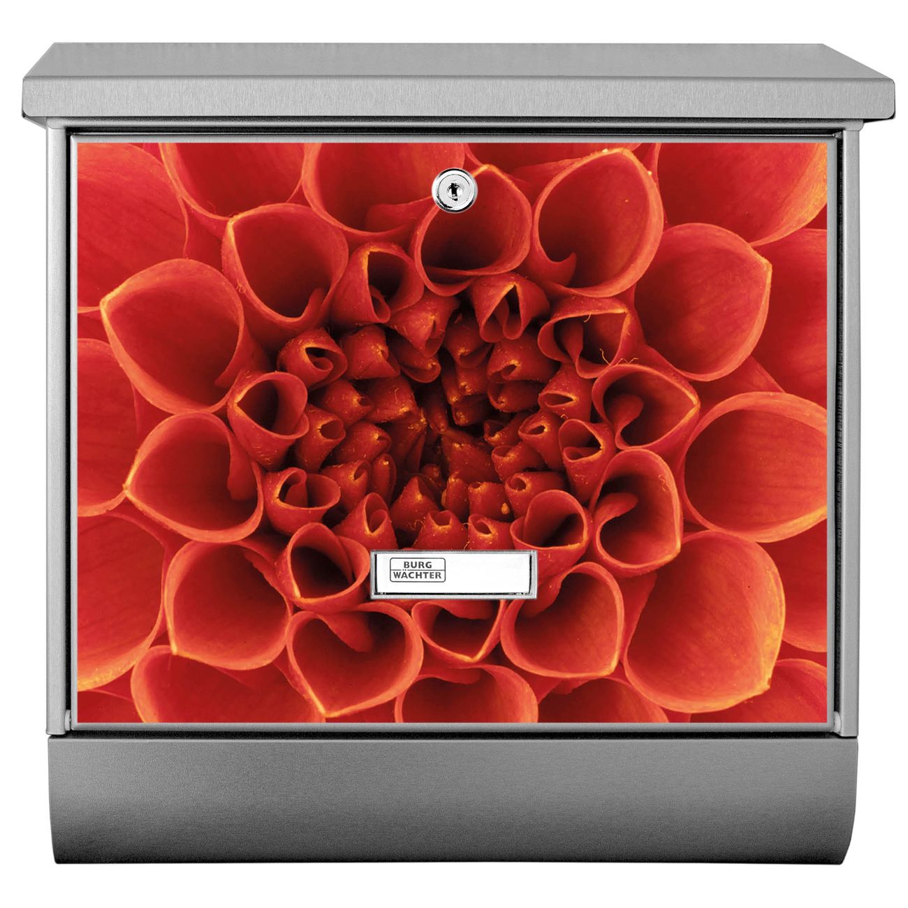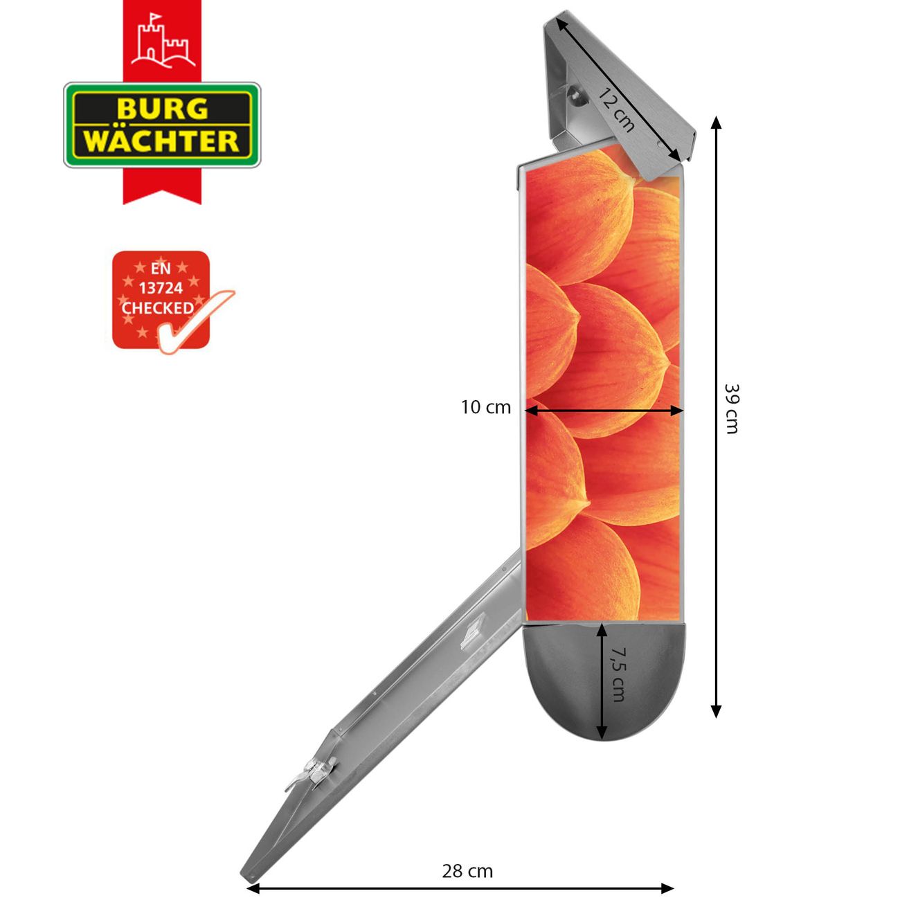Der BURG-WÄCHTER Edelstahl Briefkasten mit Motiv Orange Chrysantheme und Zeitungsrolle bietet Ihnen mit seinem Fassungsvermögen genügend Platz auch für große A4 Sendungen und Zeitschriften. Das integrierte Regendach schützt Ihre Post vor dem Eindringen von Regen.