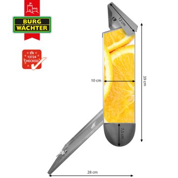 Der BURG-WÄCHTER Edelstahl Briefkasten mit Motiv Orangenscheiben und Zeitungsrolle bietet Ihnen mit seinem Fassungsvermögen genügend Platz auch für große A4 Sendungen und Zeitschriften. Das integrierte Regendach schützt Ihre Post vor dem Eindringen von Regen.