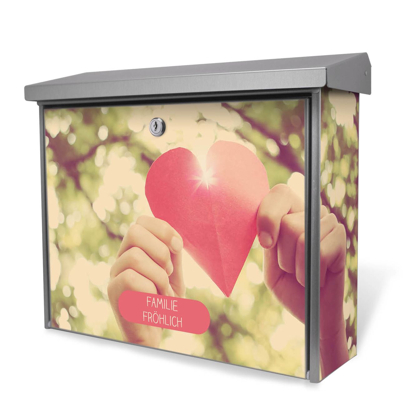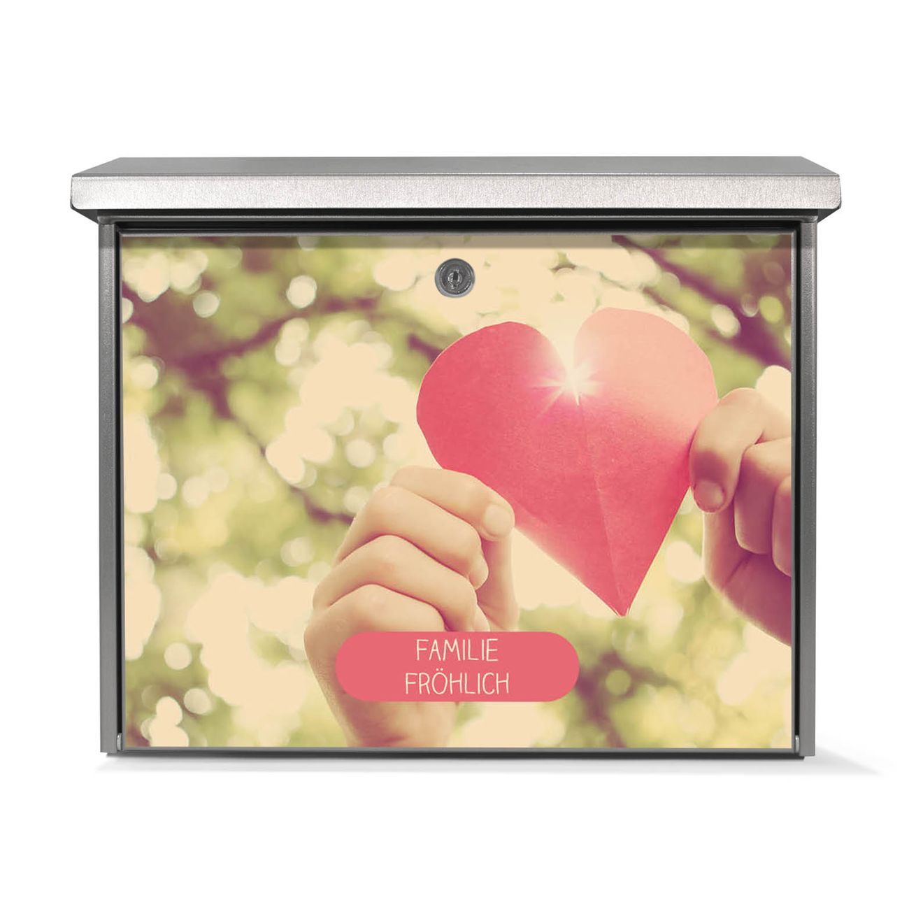 Der Postkasten mit Papierherz Motiv hat ein sehr ansprechendes und zeitloses Design. Unsere Motivpalette hält jede Menge Varianten bereit, ob klassisch, modern, verspielt oder witzig - für jeden haben wir das passende Motiv parat. Der Briefkasten ist das Aushängeschild Ihres Hauses.