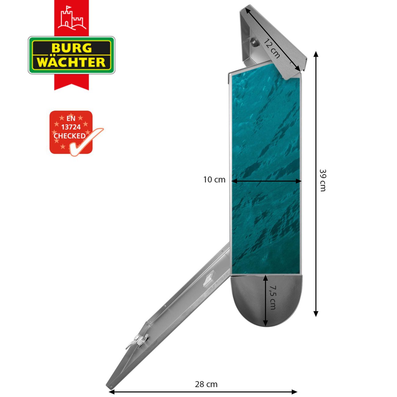Der BURG-WÄCHTER Edelstahl Briefkasten mit Motiv Perfekte Welle und Zeitungsrolle bietet Ihnen mit seinem Fassungsvermögen genügend Platz auch für große A4 Sendungen und Zeitschriften. Das integrierte Regendach schützt Ihre Post vor dem Eindringen von Regen.