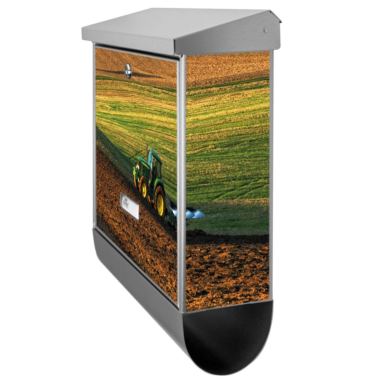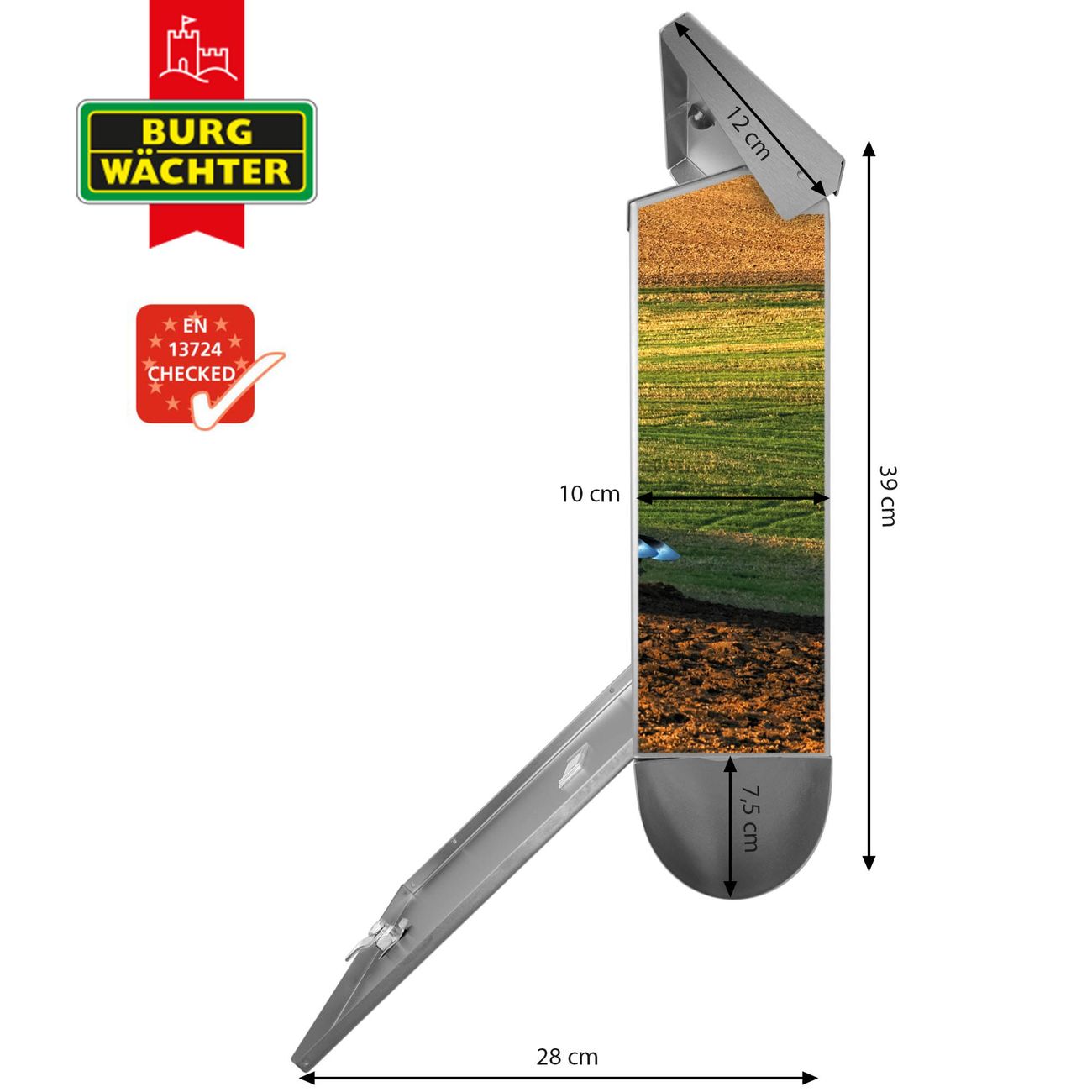Der BURG-WÄCHTER Edelstahl Briefkasten mit Motiv Pflügen und Zeitungsrolle bietet Ihnen mit seinem Fassungsvermögen genügend Platz auch für große A4 Sendungen und Zeitschriften. Das integrierte Regendach schützt Ihre Post vor dem Eindringen von Regen.