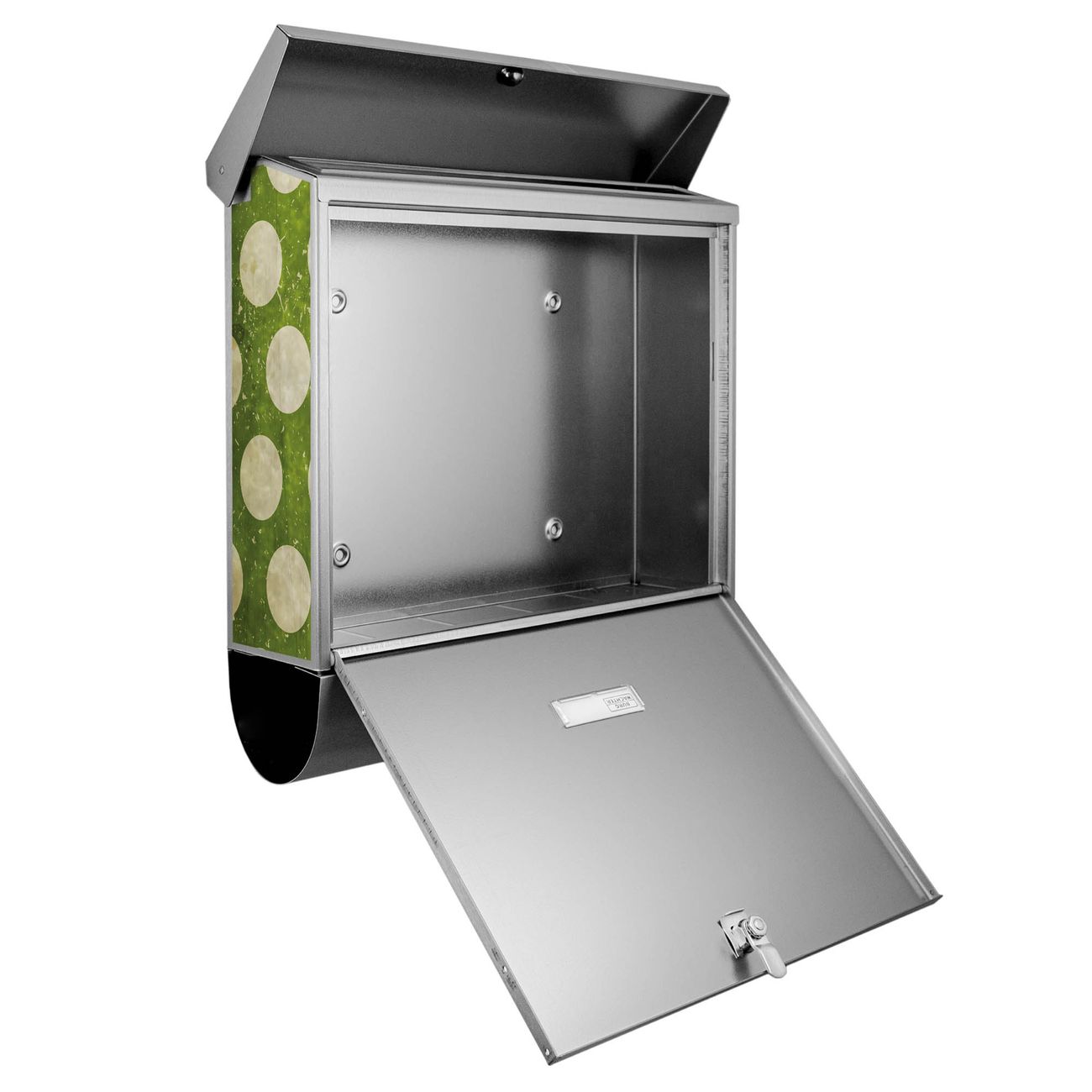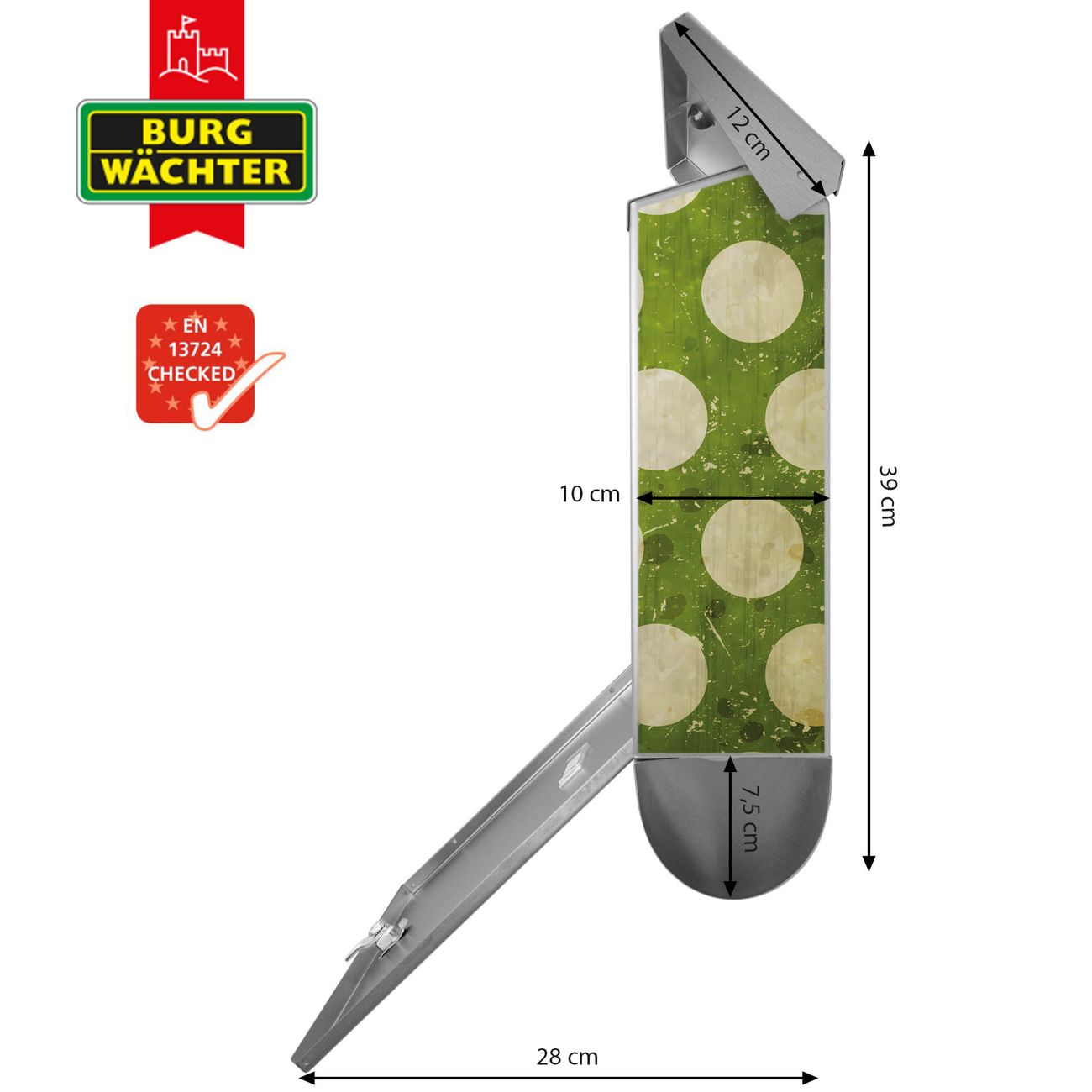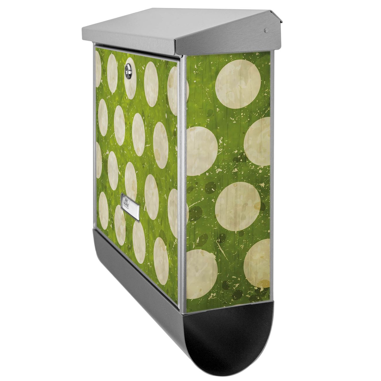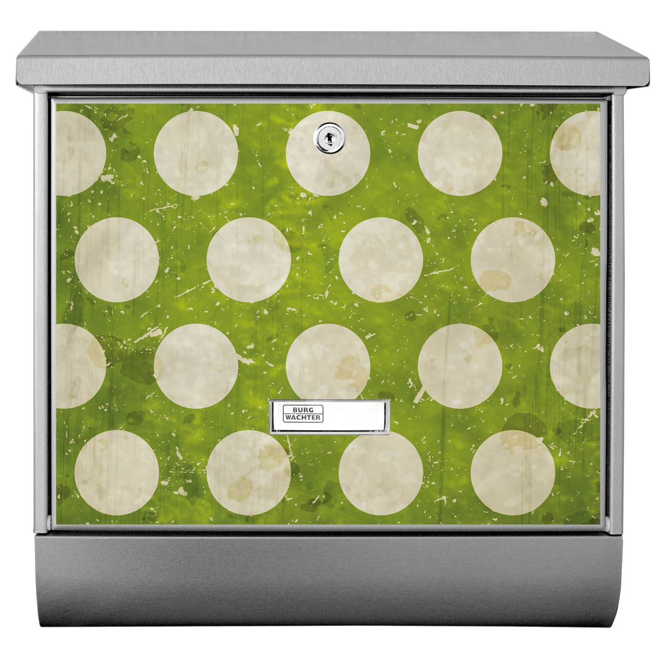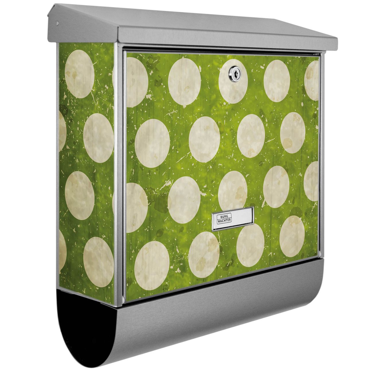 Der BURG-WÄCHTER Edelstahl Briefkasten mit Motiv Punkte Grün Vintage und Zeitungsrolle bietet Ihnen mit seinem Fassungsvermögen genügend Platz auch für große A4 Sendungen und Zeitschriften. Das integrierte Regendach schützt Ihre Post vor dem Eindringen von Regen.