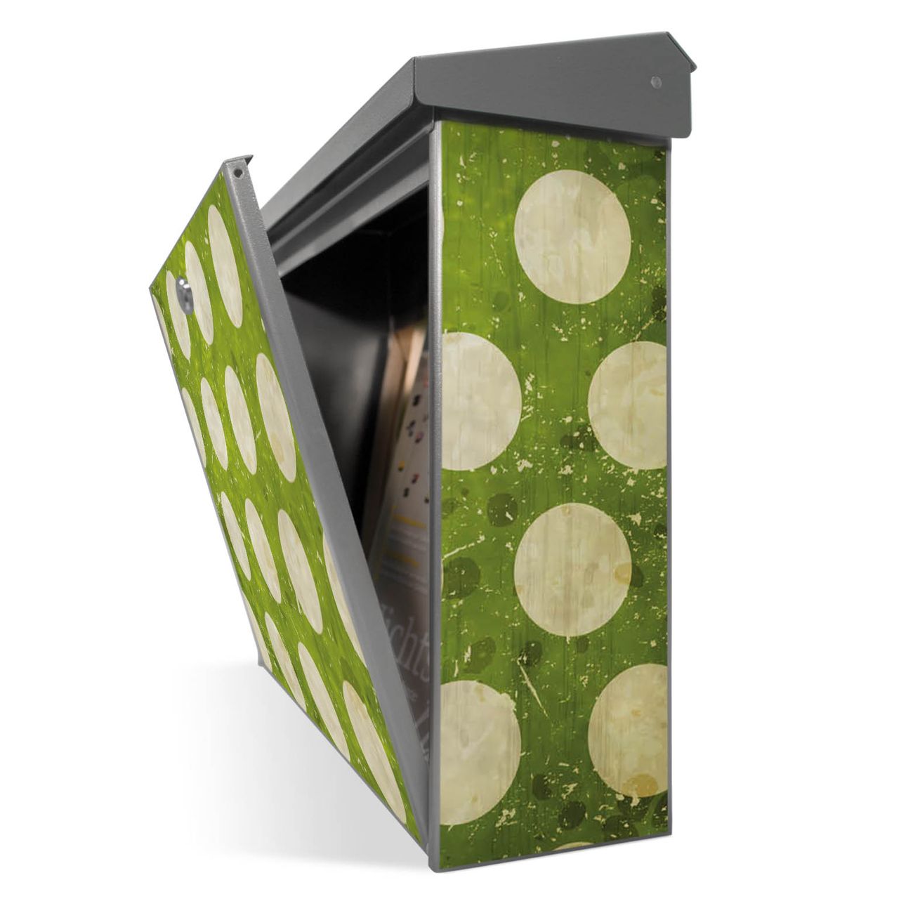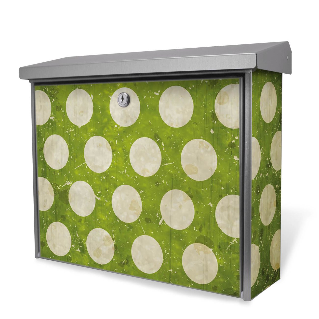 Der Postkasten mit Punkte Grün Vintage Motiv hat ein sehr ansprechendes und zeitloses Design. Unsere Motivpalette hält jede Menge Varianten bereit, ob klassisch, modern, verspielt oder witzig - für jeden haben wir das passende Motiv parat. Der Briefkasten ist das Aushängeschild Ihres Hauses.