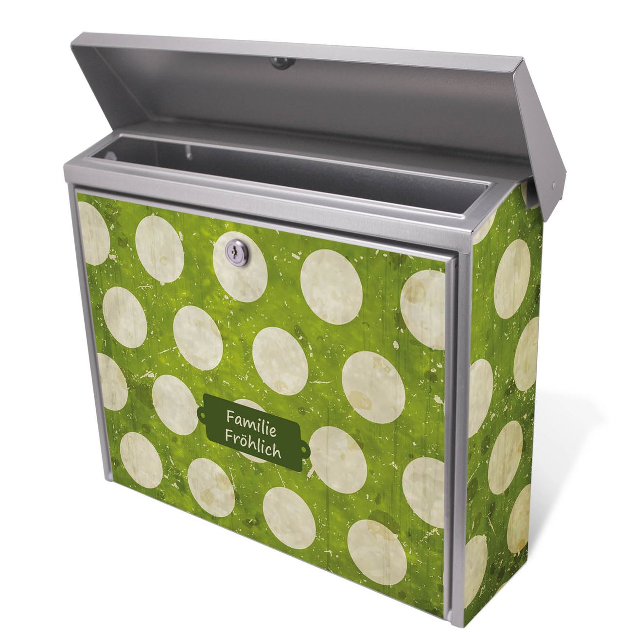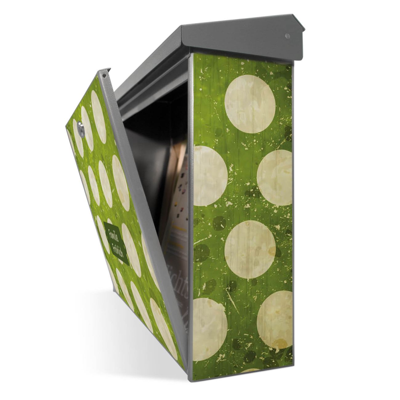 Der Postkasten mit Punkte Grün Vintage Motiv hat ein sehr ansprechendes und zeitloses Design. Unsere Motivpalette hält jede Menge Varianten bereit, ob klassisch, modern, verspielt oder witzig - für jeden haben wir das passende Motiv parat. Der Briefkasten ist das Aushängeschild Ihres Hauses.