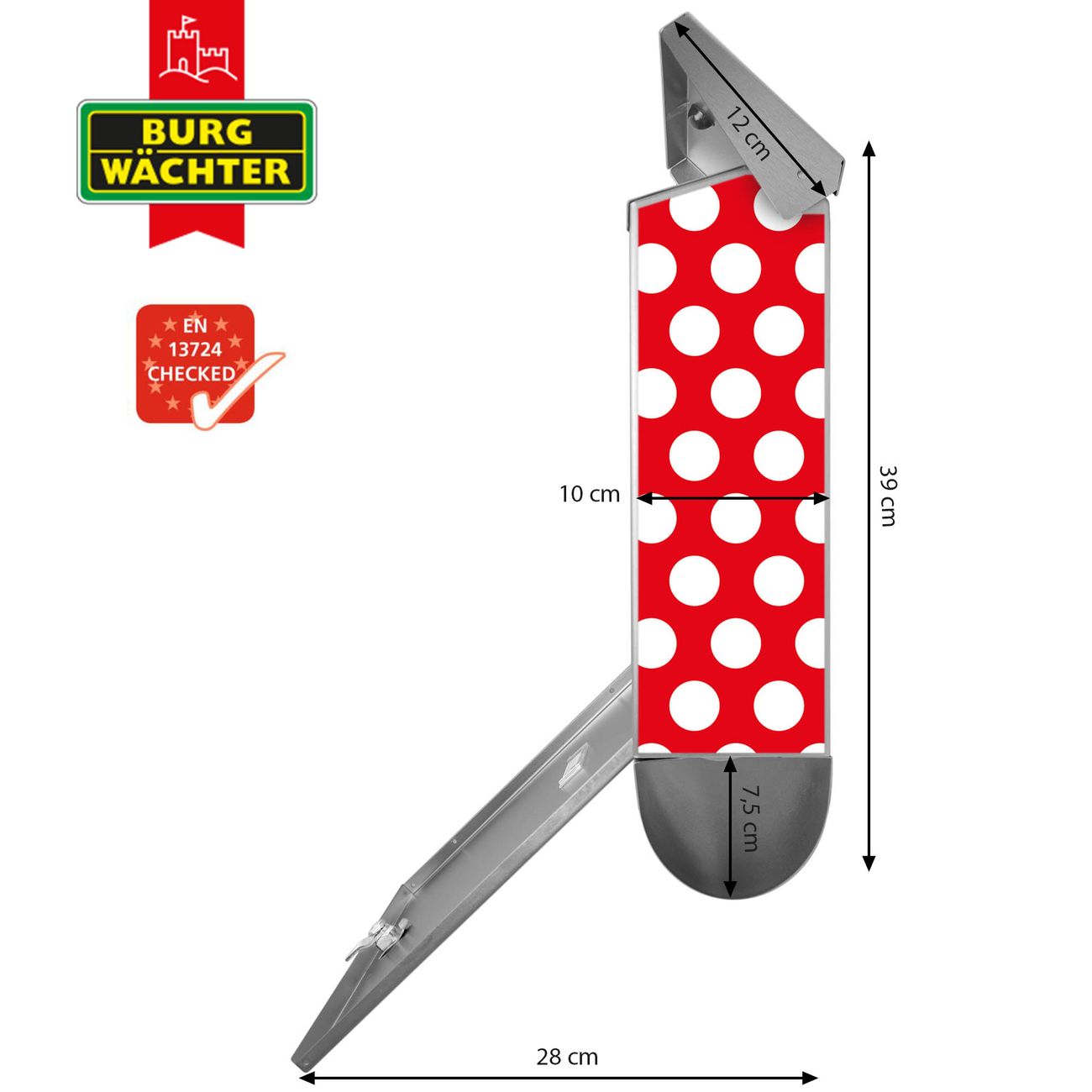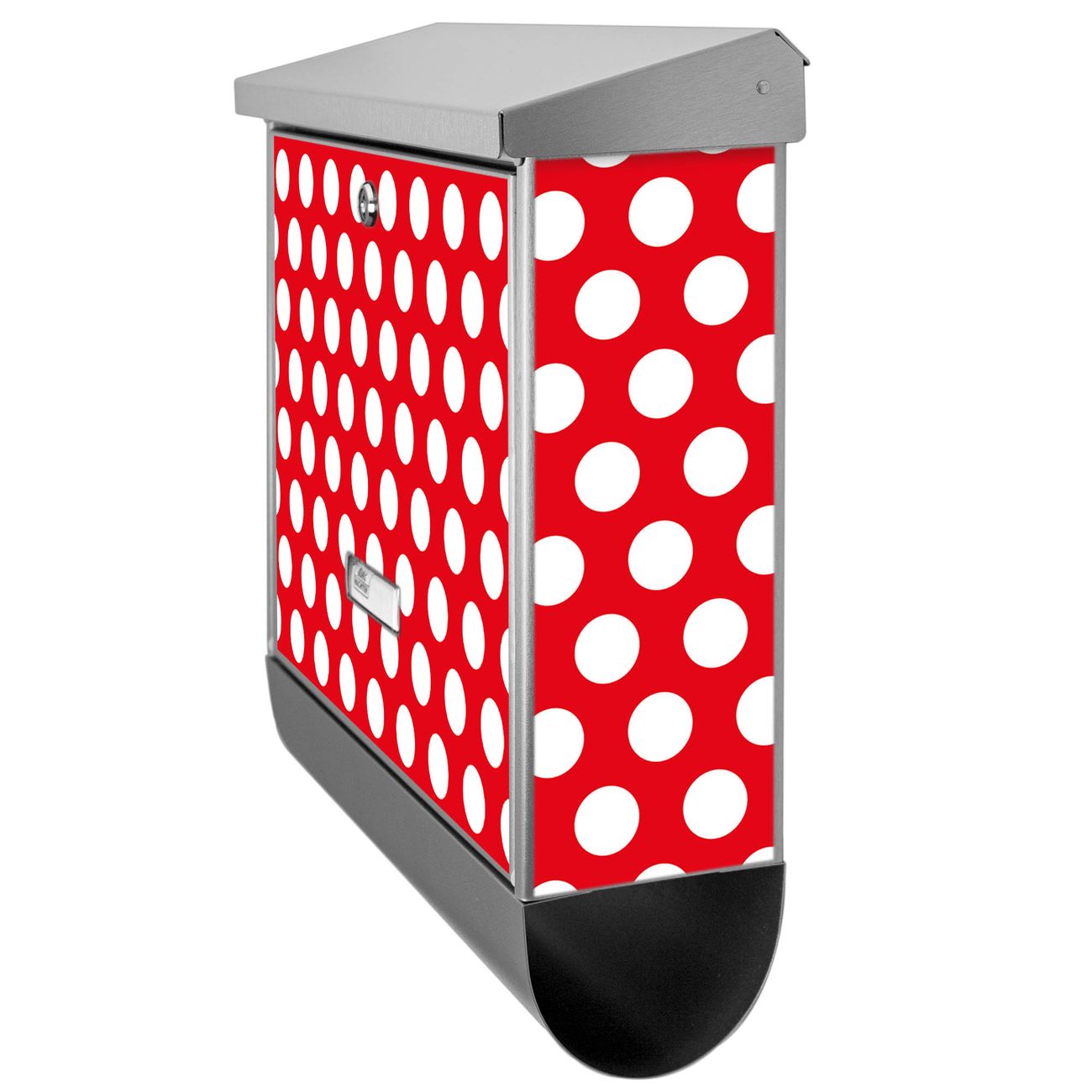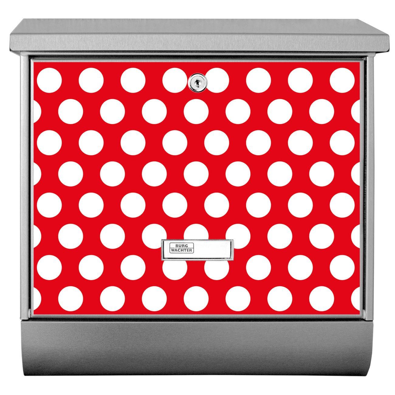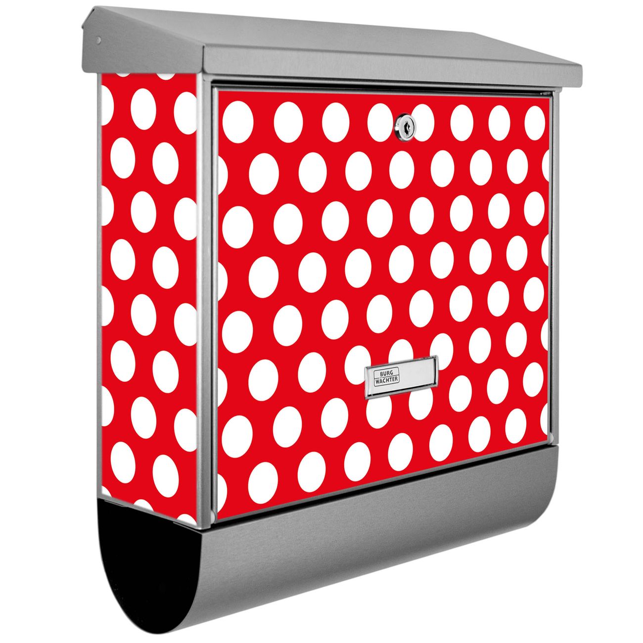 Der BURG-WÄCHTER Edelstahl Briefkasten mit Motiv Punkte Rot und Zeitungsrolle bietet Ihnen mit seinem Fassungsvermögen genügend Platz auch für große A4 Sendungen und Zeitschriften. Das integrierte Regendach schützt Ihre Post vor dem Eindringen von Regen.
