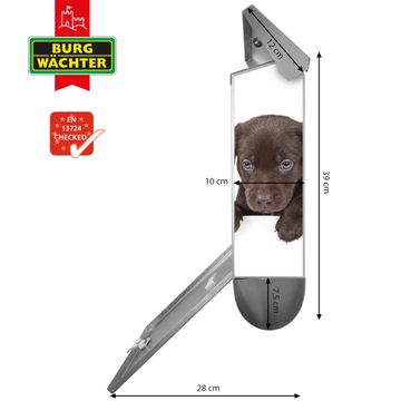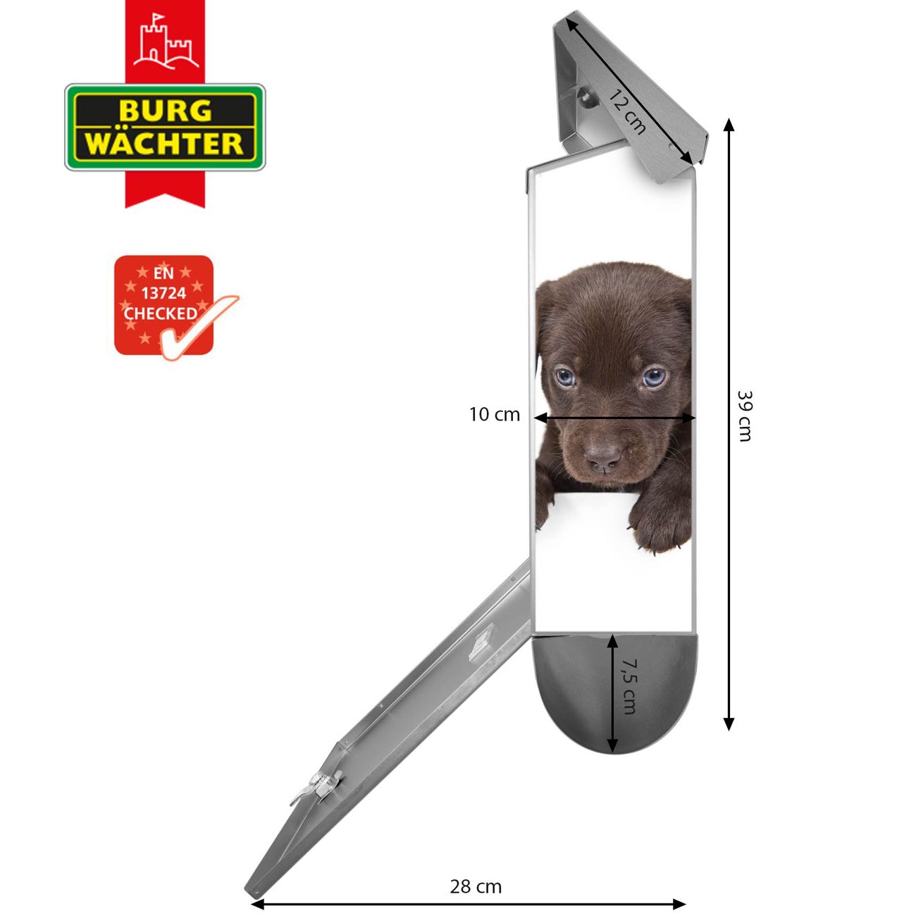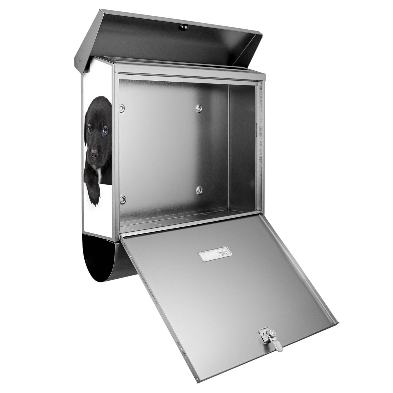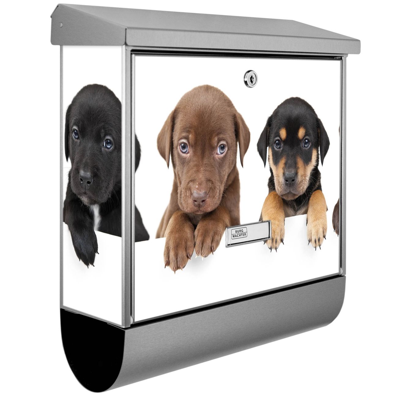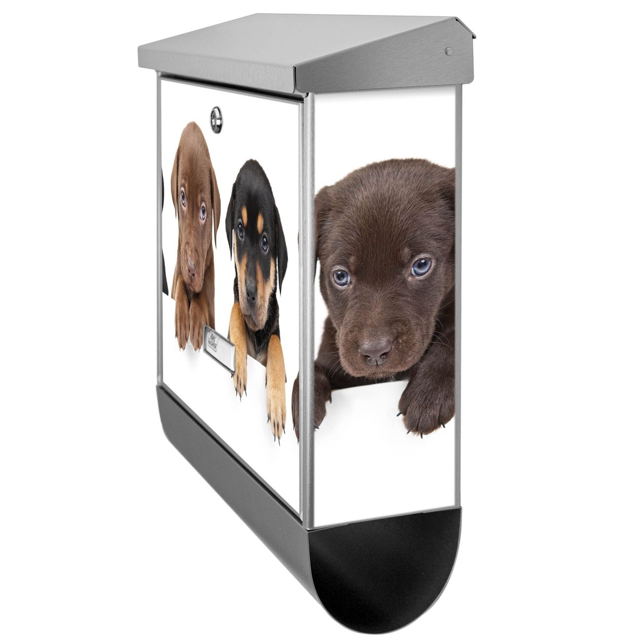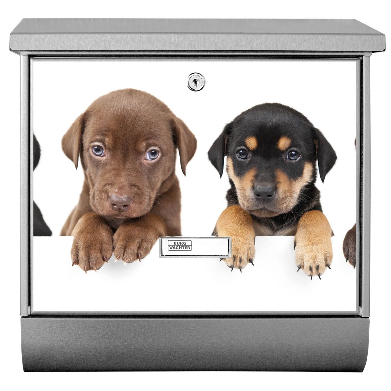 Der BURG-WÄCHTER Edelstahl Briefkasten mit Motiv Puppies und Zeitungsrolle bietet Ihnen mit seinem Fassungsvermögen genügend Platz auch für große A4 Sendungen und Zeitschriften. Das integrierte Regendach schützt Ihre Post vor dem Eindringen von Regen.