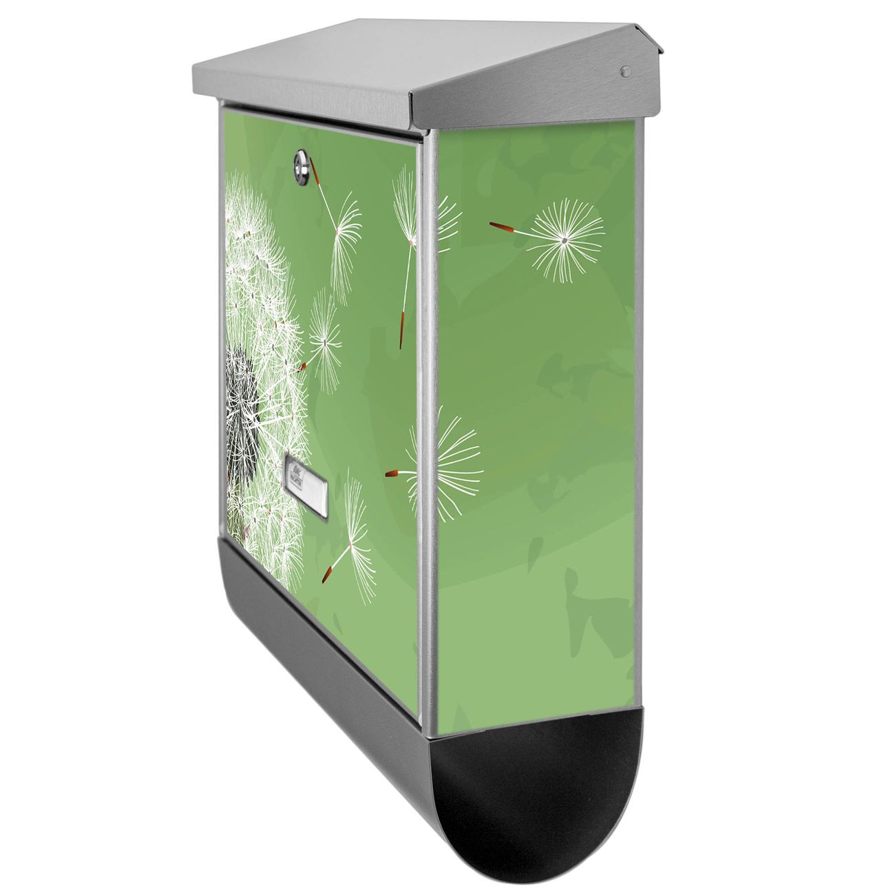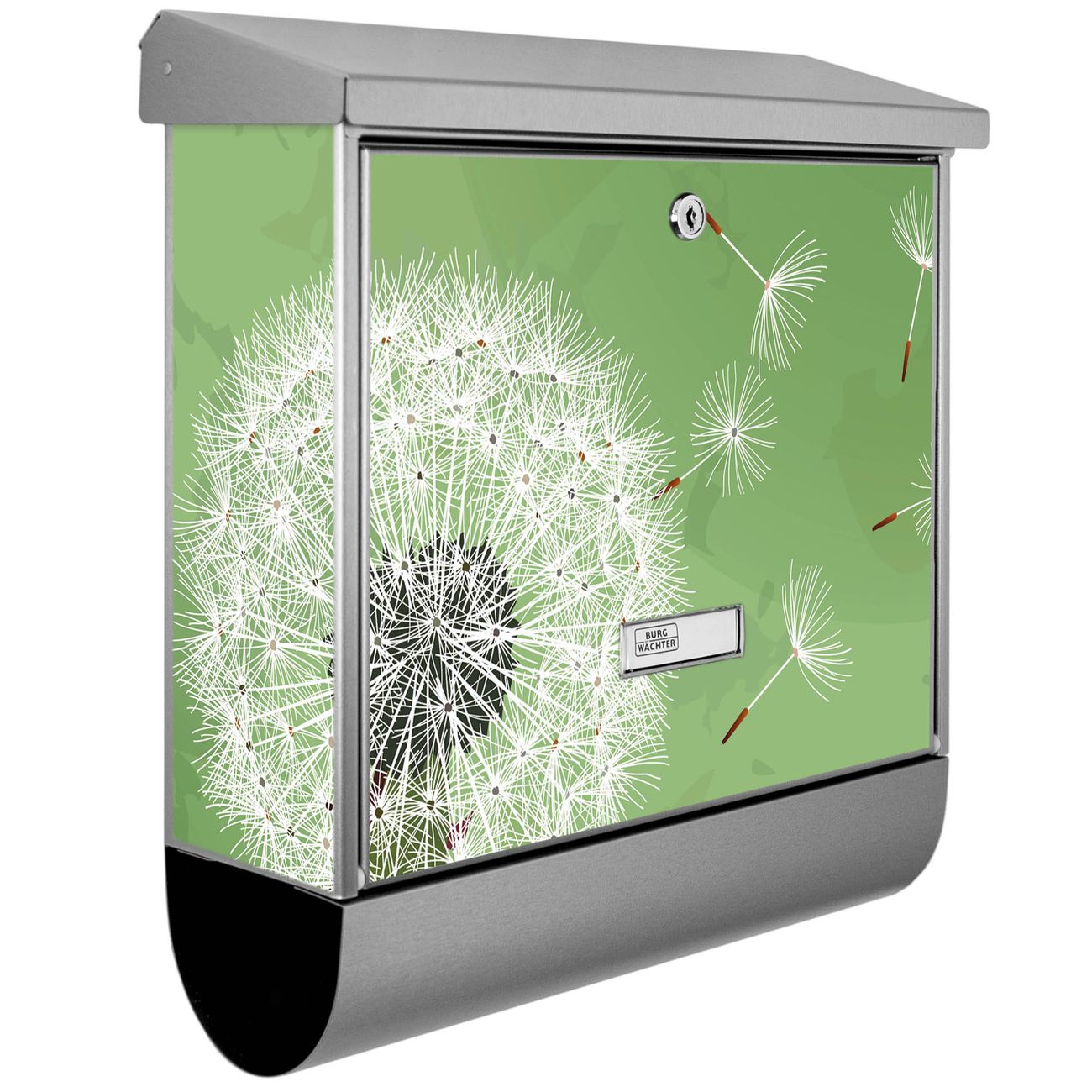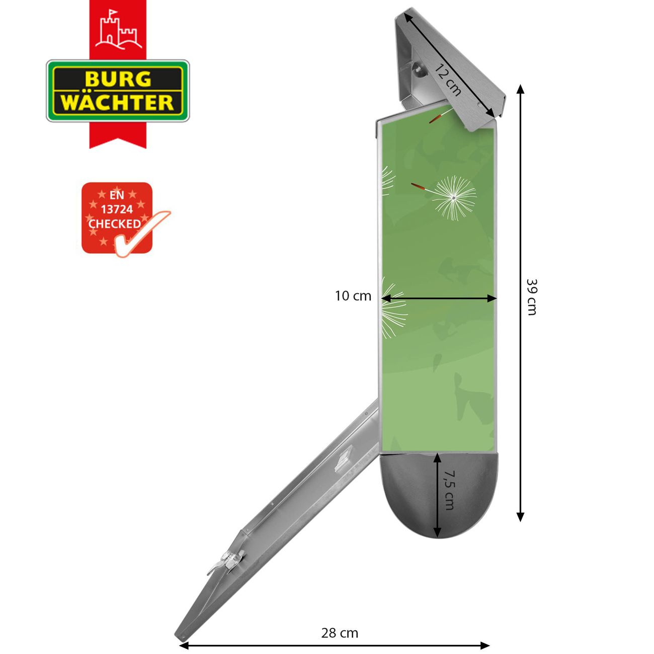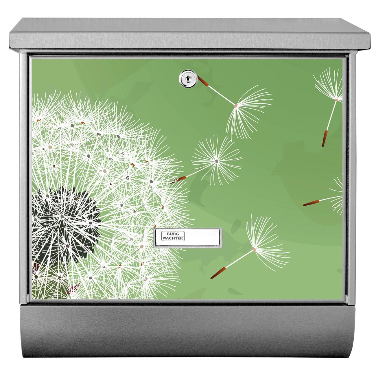 Der BURG-WÄCHTER Edelstahl Briefkasten mit Motiv Pusteblume 3 und Zeitungsrolle bietet Ihnen mit seinem Fassungsvermögen genügend Platz auch für große A4 Sendungen und Zeitschriften. Das integrierte Regendach schützt Ihre Post vor dem Eindringen von Regen.