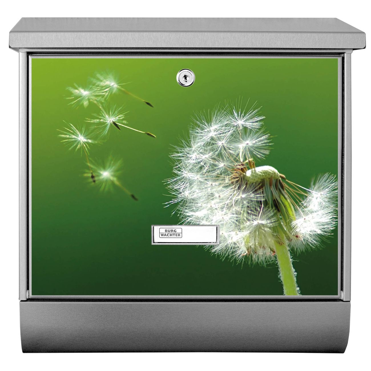 Der BURG-WÄCHTER Edelstahl Briefkasten mit Motiv Pusteblume und Zeitungsrolle bietet Ihnen mit seinem Fassungsvermögen genügend Platz auch für große A4 Sendungen und Zeitschriften. Das integrierte Regendach schützt Ihre Post vor dem Eindringen von Regen.