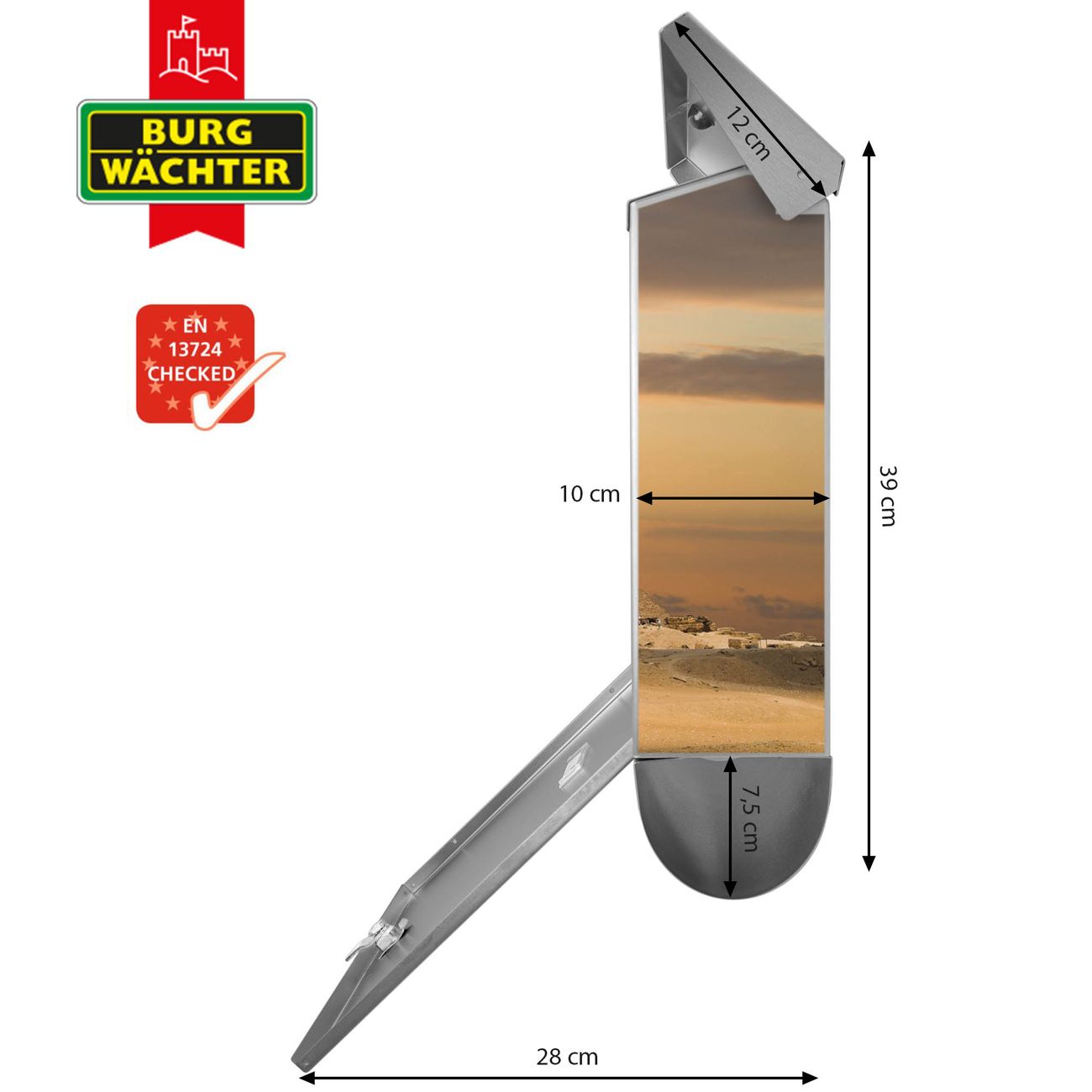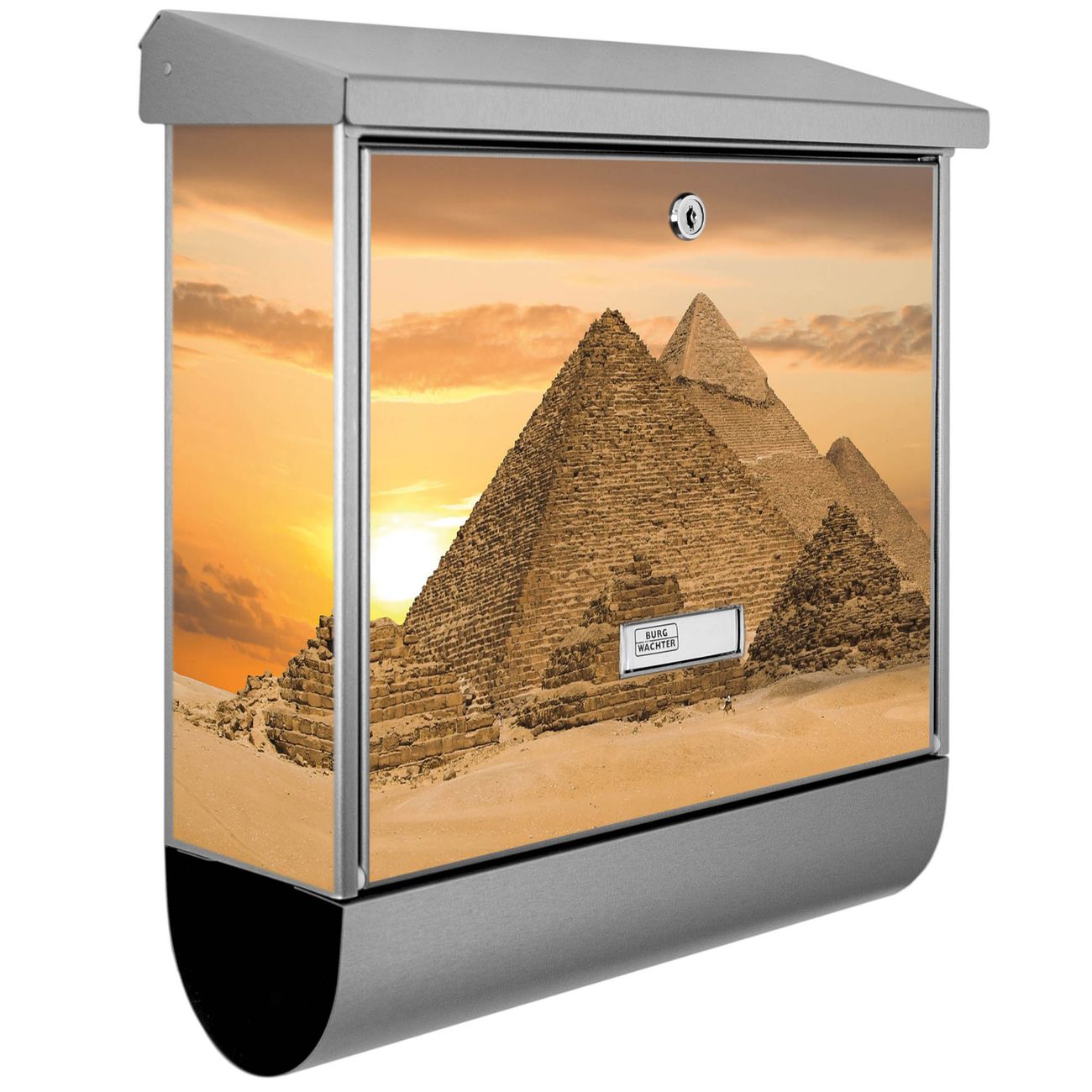 Der BURG-WÄCHTER Edelstahl Briefkasten mit Motiv Pyramiden und Zeitungsrolle bietet Ihnen mit seinem Fassungsvermögen genügend Platz auch für große A4 Sendungen und Zeitschriften. Das integrierte Regendach schützt Ihre Post vor dem Eindringen von Regen.