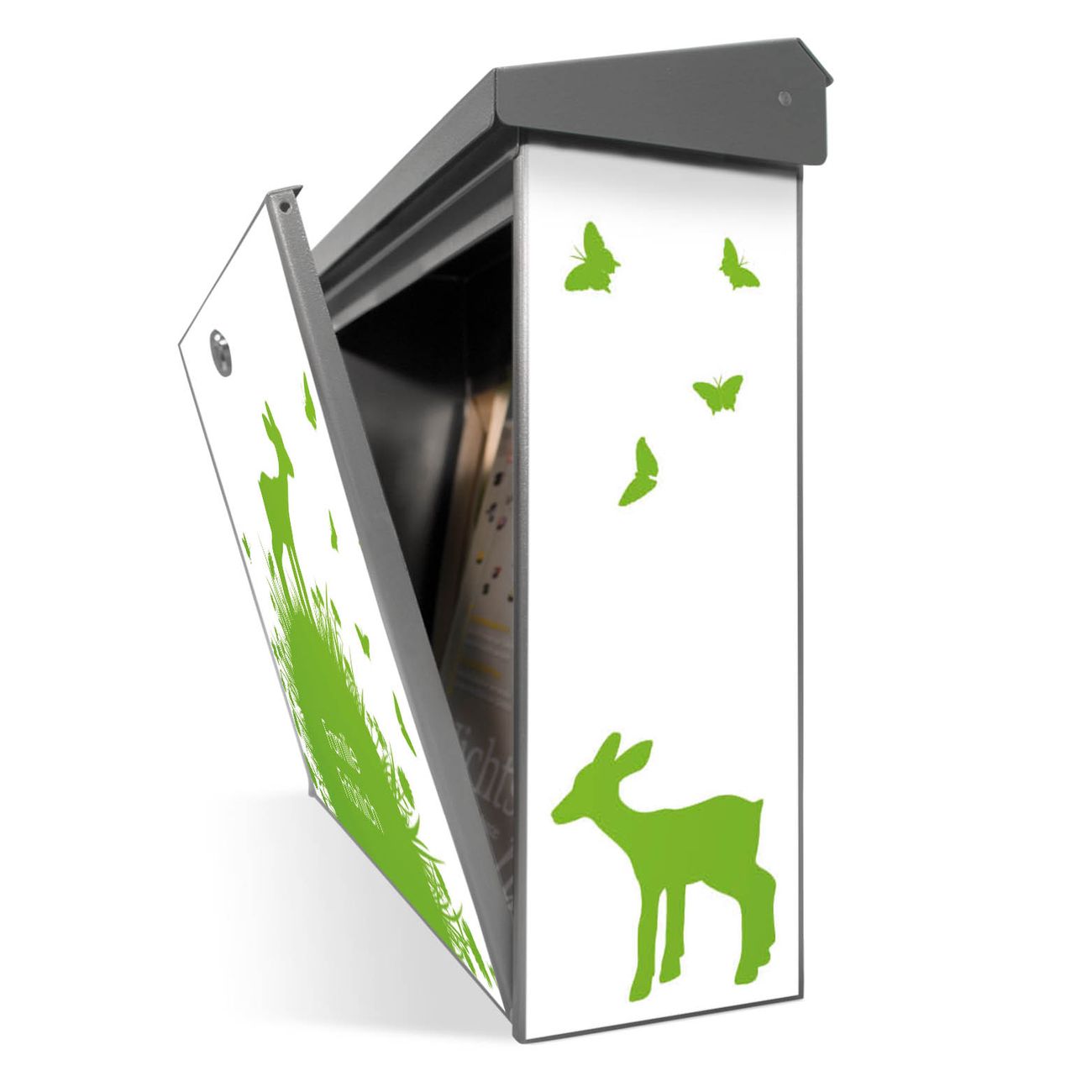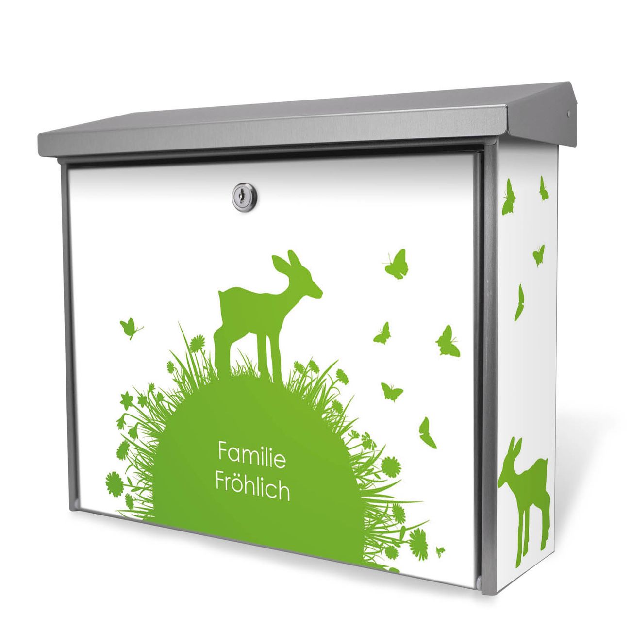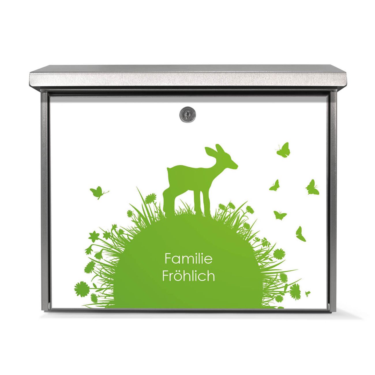 Der Postkasten mit Rehkitz Motiv hat ein sehr ansprechendes und zeitloses Design. Unsere Motivpalette hält jede Menge Varianten bereit, ob klassisch, modern, verspielt oder witzig - für jeden haben wir das passende Motiv parat. Der Briefkasten ist das Aushängeschild Ihres Hauses.