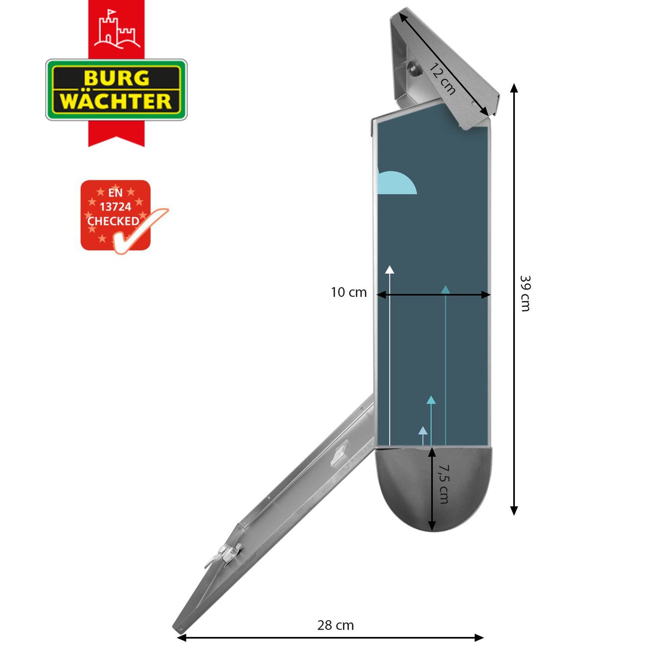 Der BURG-WÄCHTER Edelstahl Briefkasten mit Motiv Rock the World und Zeitungsrolle bietet Ihnen mit seinem Fassungsvermögen genügend Platz auch für große A4 Sendungen und Zeitschriften. Das integrierte Regendach schützt Ihre Post vor dem Eindringen von Regen.