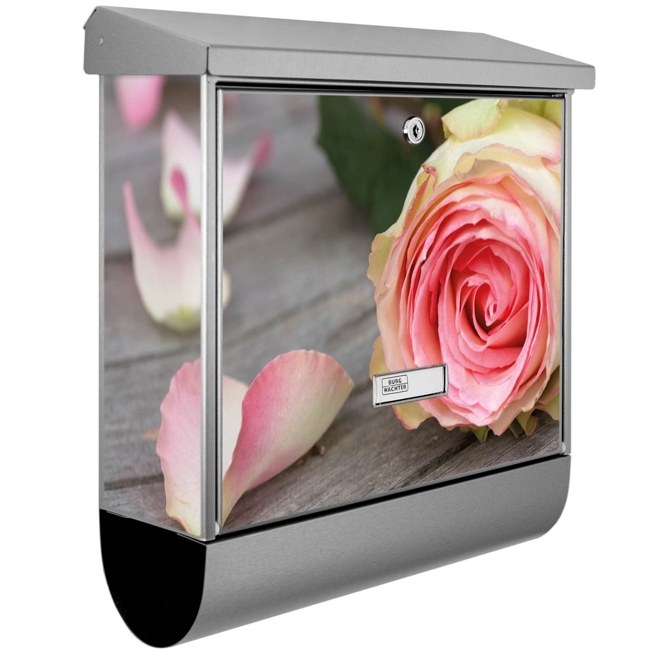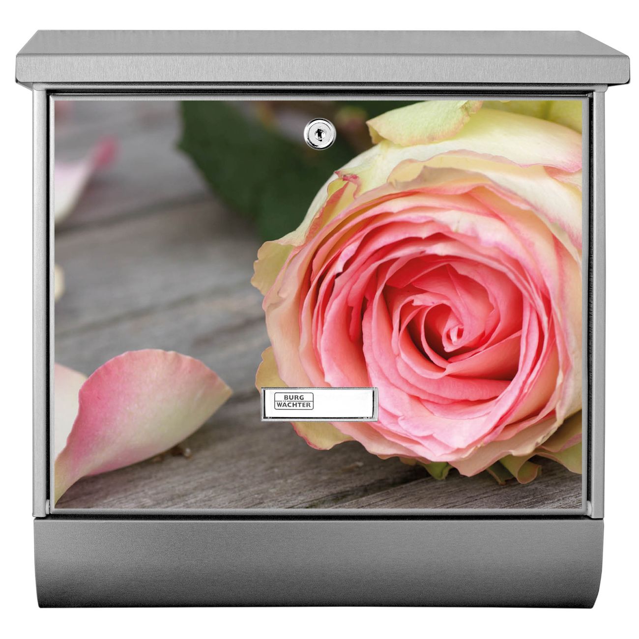 Der BURG-WÄCHTER Edelstahl Briefkasten mit Motiv Rosa Rose und Zeitungsrolle bietet Ihnen mit seinem Fassungsvermögen genügend Platz auch für große A4 Sendungen und Zeitschriften. Das integrierte Regendach schützt Ihre Post vor dem Eindringen von Regen.