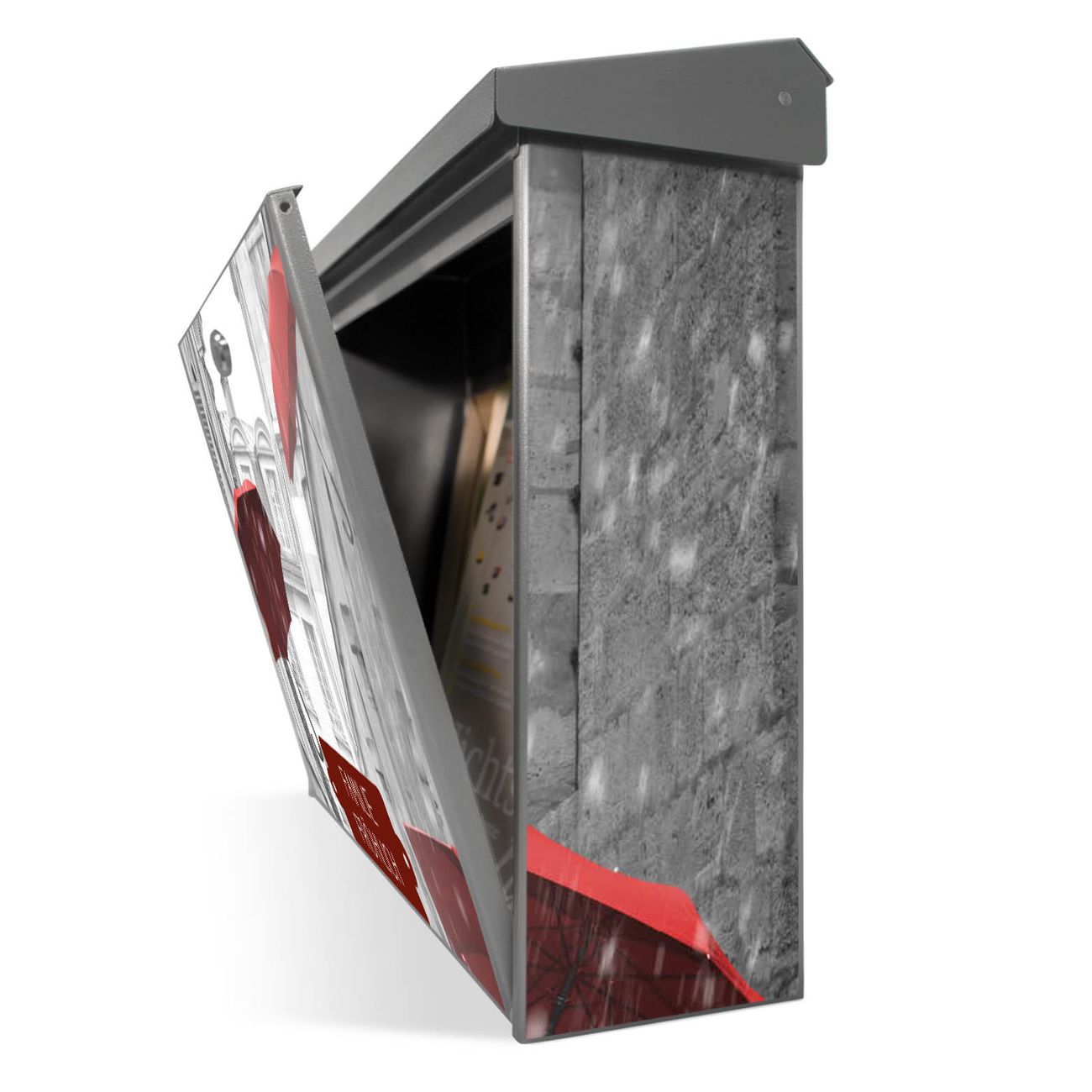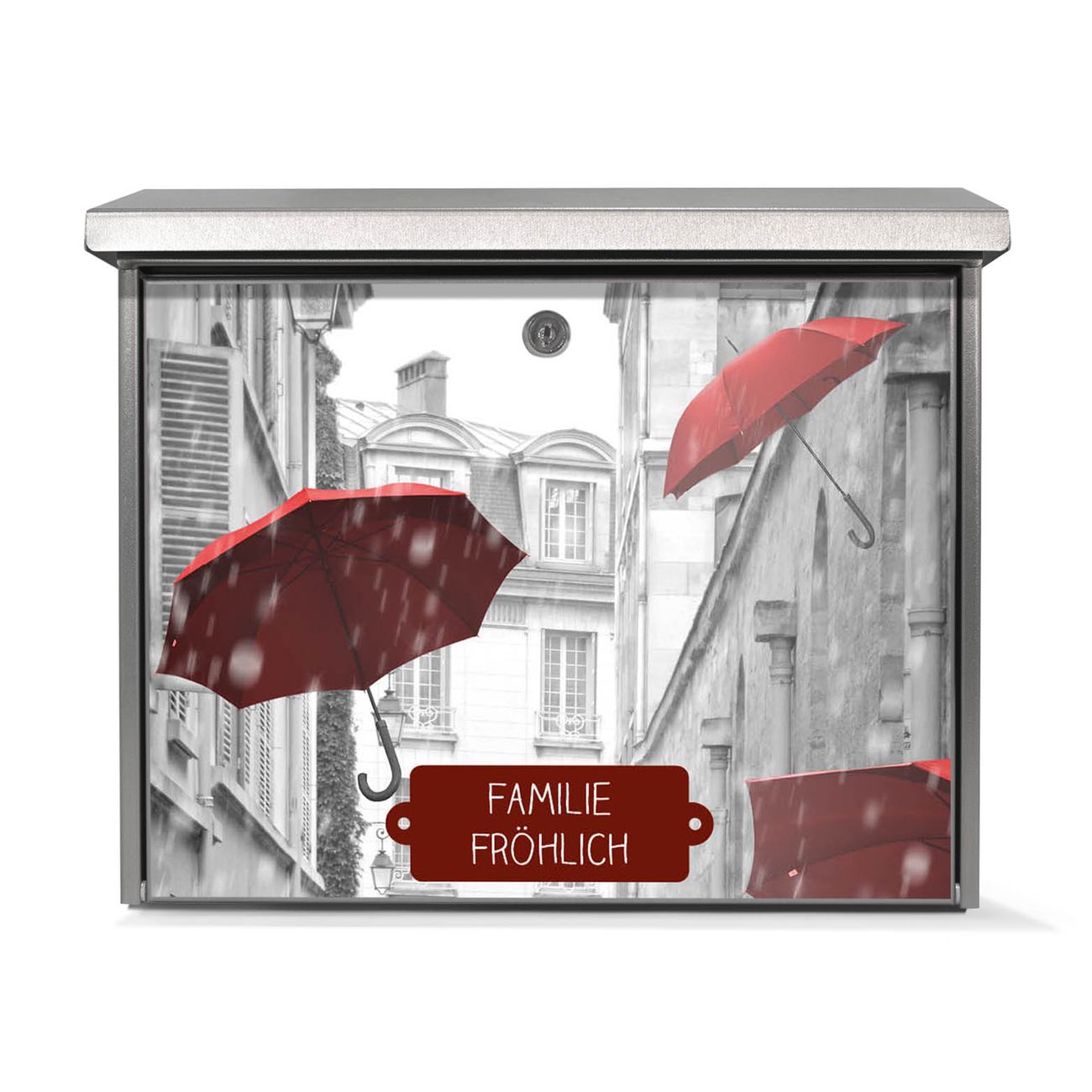 Der Postkasten mit Rote Schirme Motiv hat ein sehr ansprechendes und zeitloses Design. Unsere Motivpalette hält jede Menge Varianten bereit, ob klassisch, modern, verspielt oder witzig - für jeden haben wir das passende Motiv parat. Der Briefkasten ist das Aushängeschild Ihres Hauses.