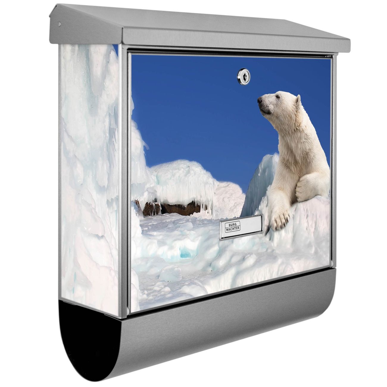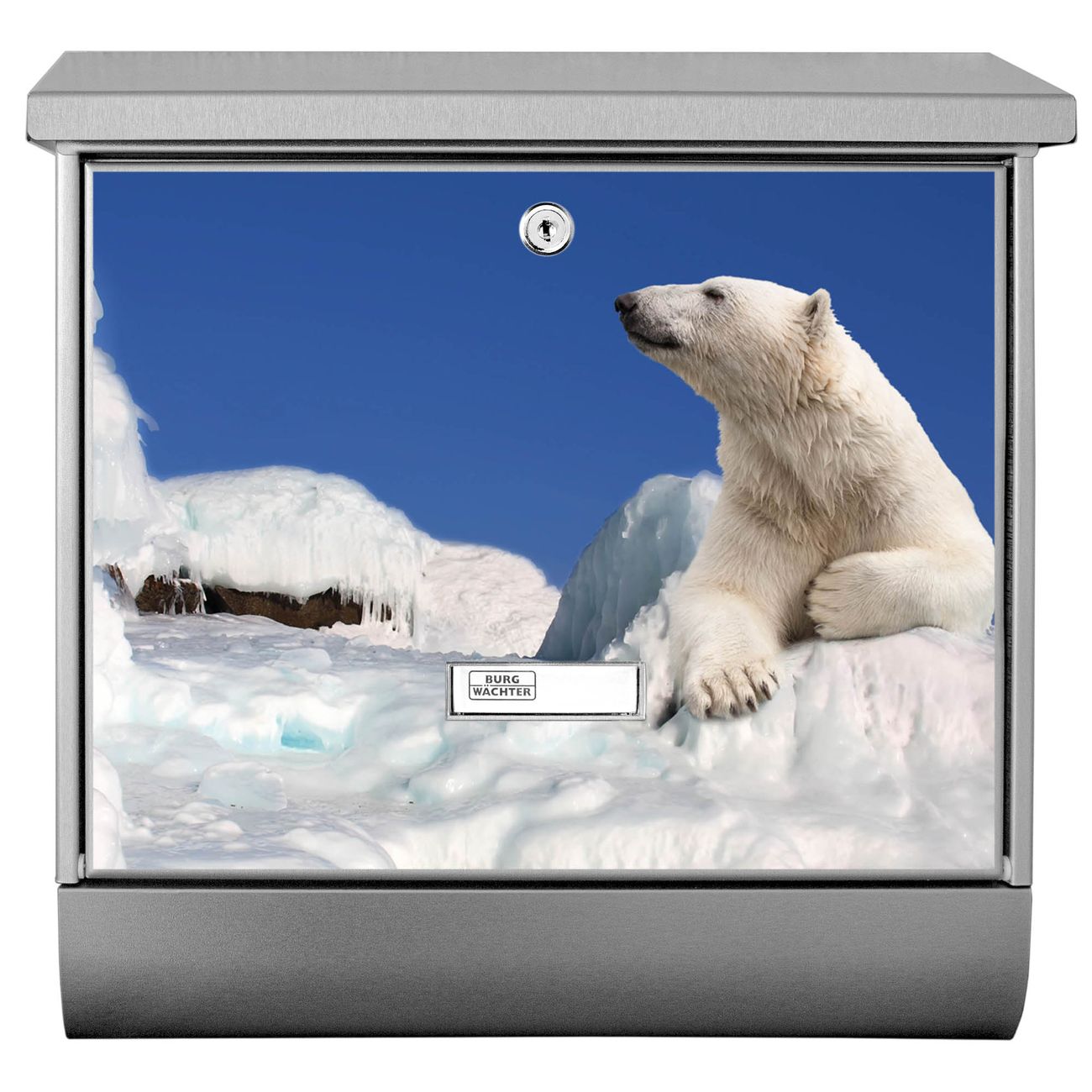 Der BURG-WÄCHTER Edelstahl Briefkasten mit Motiv Ruhender Eisbär und Zeitungsrolle bietet Ihnen mit seinem Fassungsvermögen genügend Platz auch für große A4 Sendungen und Zeitschriften. Das integrierte Regendach schützt Ihre Post vor dem Eindringen von Regen.