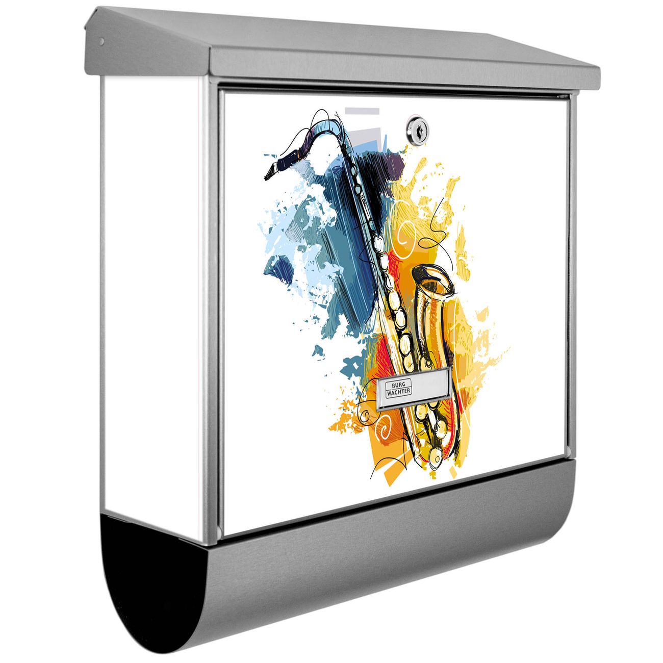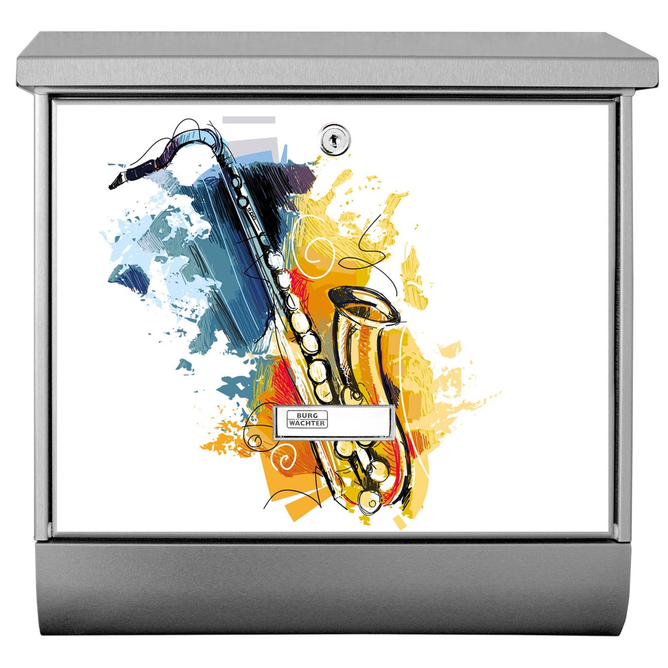 Der BURG-WÄCHTER Edelstahl Briefkasten mit Motiv Saxophon und Zeitungsrolle bietet Ihnen mit seinem Fassungsvermögen genügend Platz auch für große A4 Sendungen und Zeitschriften. Das integrierte Regendach schützt Ihre Post vor dem Eindringen von Regen.