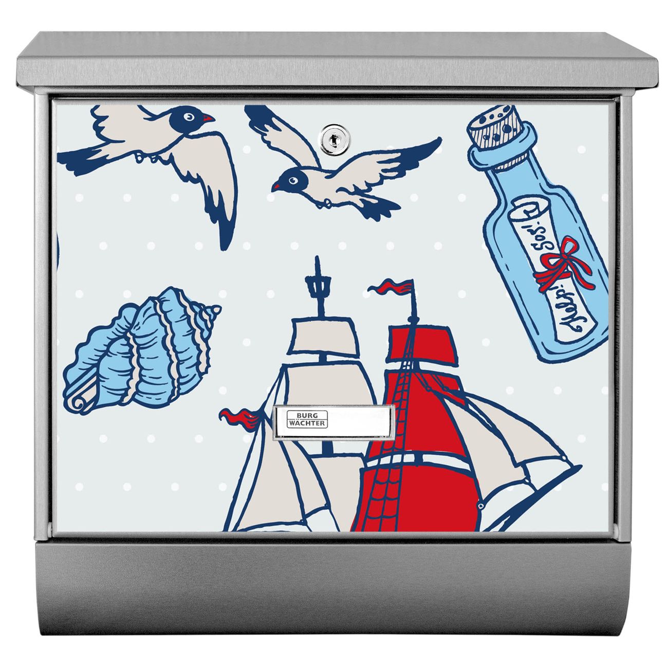 Der Schiff Ahoj Motivbriefkasten hat ein sehr ansprechendes und zeitloses Design. Unsere Motivpalette hält jede Menge Varianten bereit, ob klassisch, modern, verspielt oder witzig - für jeden haben wir das passende Motiv parat. Der Briefkasten mit Zeitungsfach ist Ihr Aushängeschild, heben Sie Sich ab ohne auf Funktionalität zu verzichten.