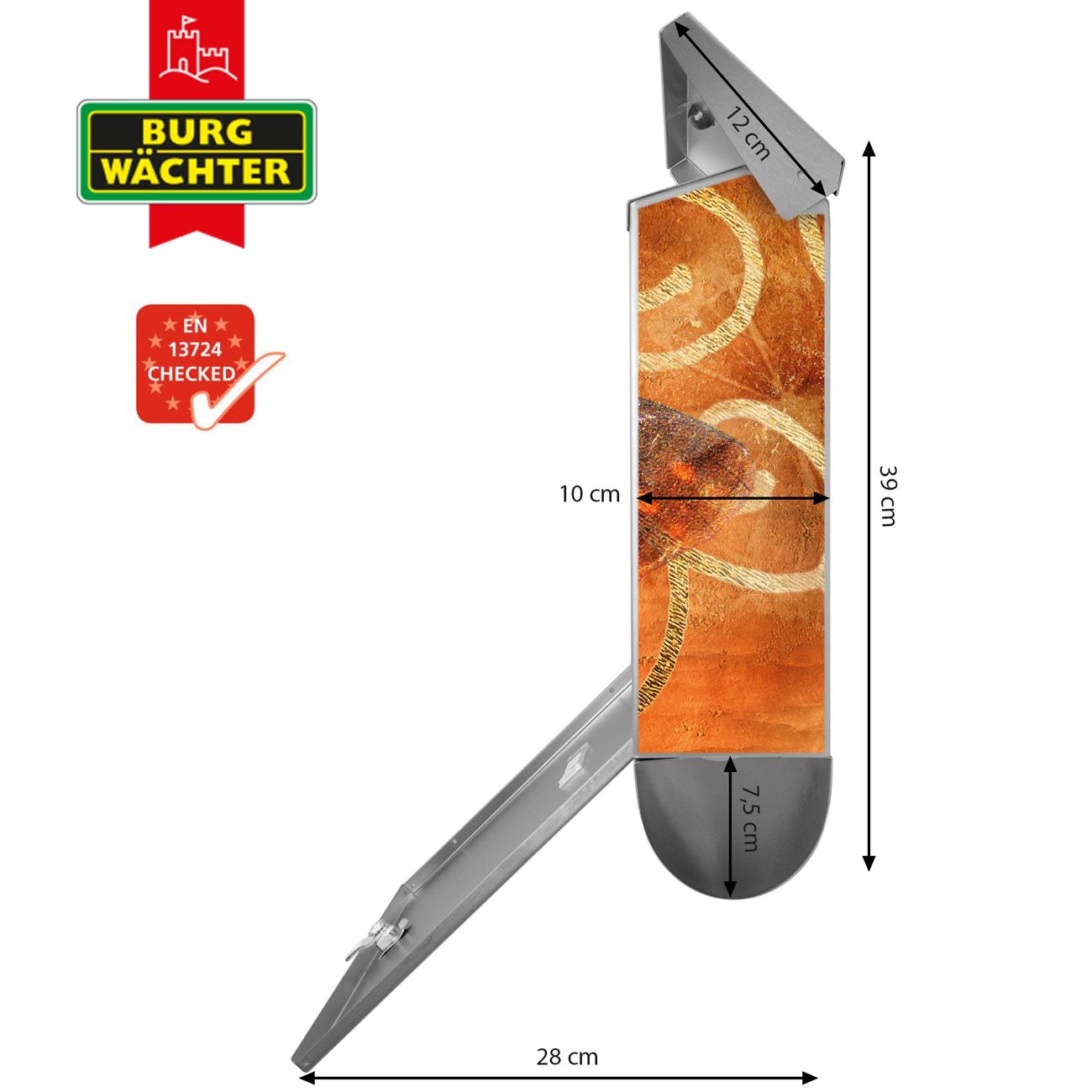 Der BURG-WÄCHTER Edelstahl Briefkasten mit Motiv Schmetterling und Zeitungsrolle bietet Ihnen mit seinem Fassungsvermögen genügend Platz auch für große A4 Sendungen und Zeitschriften. Das integrierte Regendach schützt Ihre Post vor dem Eindringen von Regen.