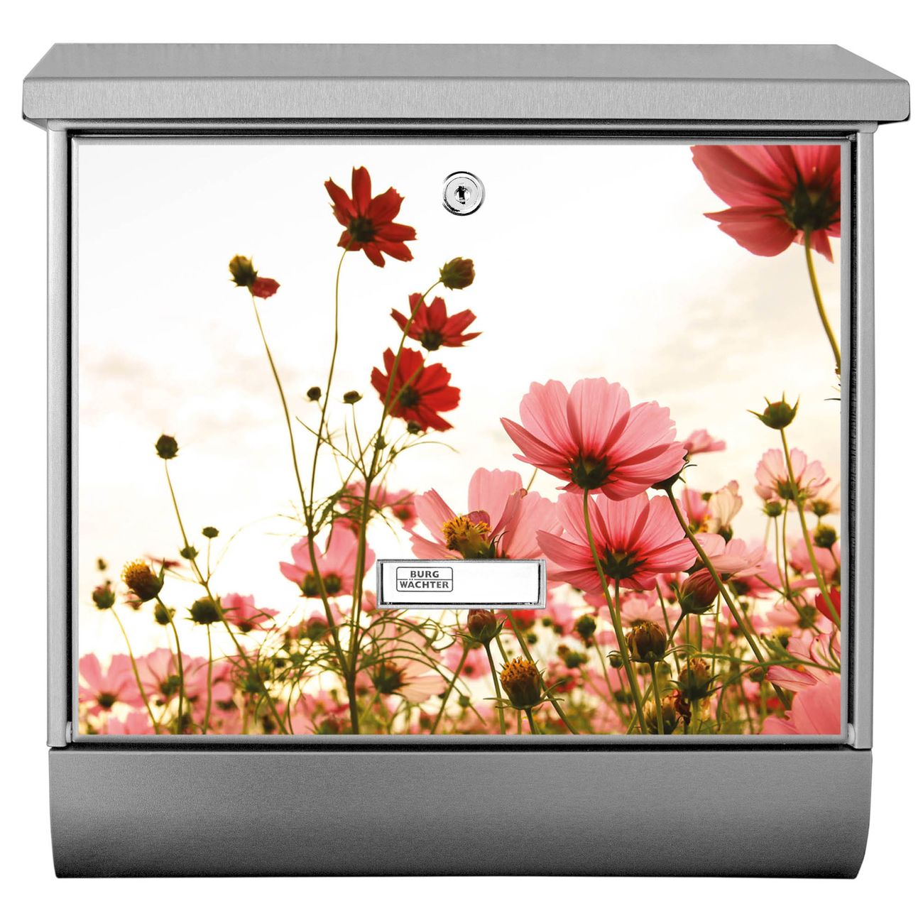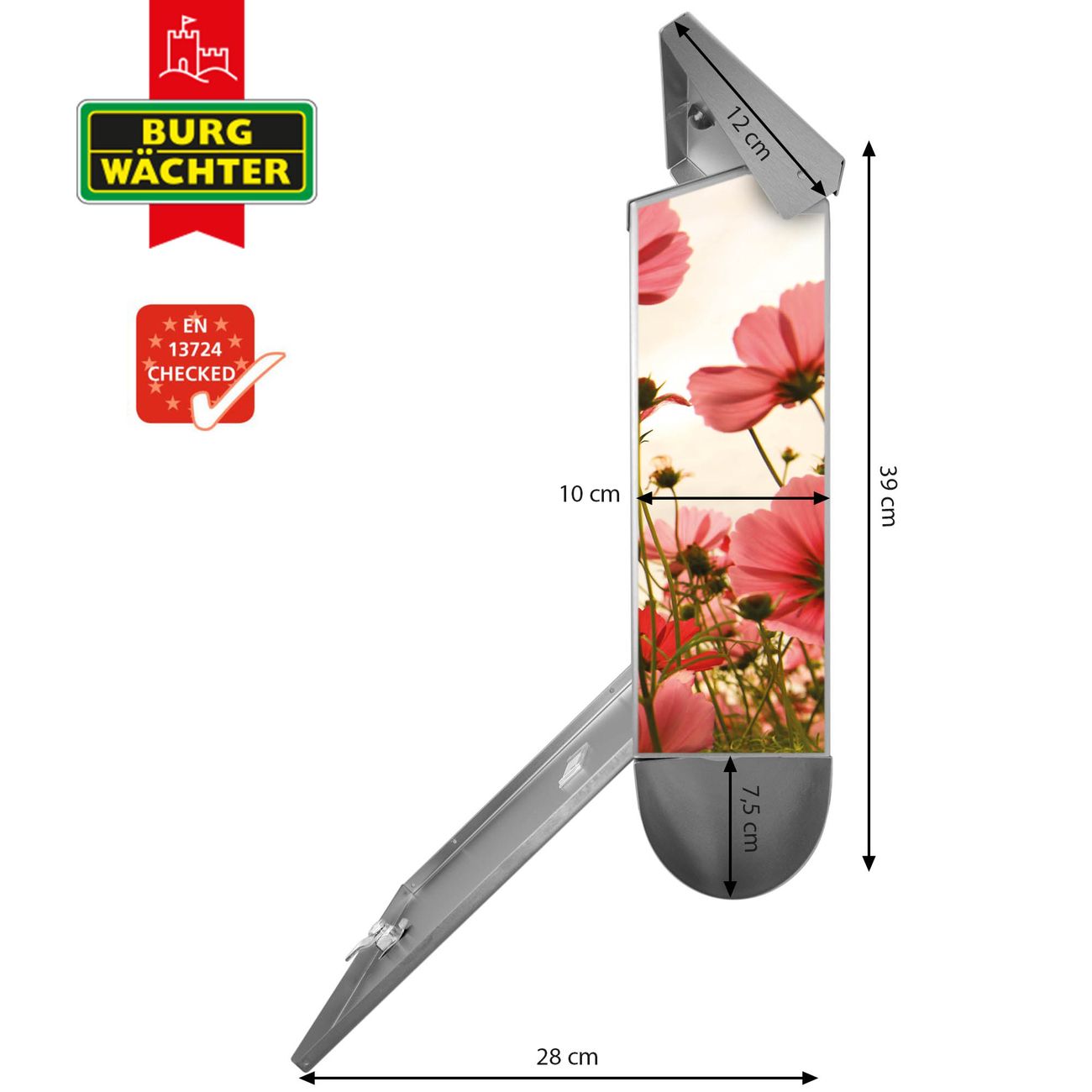 Der BURG-WÄCHTER Edelstahl Briefkasten mit Motiv Schmuckkörbchen und Zeitungsrolle bietet Ihnen mit seinem Fassungsvermögen genügend Platz auch für große A4 Sendungen und Zeitschriften. Das integrierte Regendach schützt Ihre Post vor dem Eindringen von Regen.