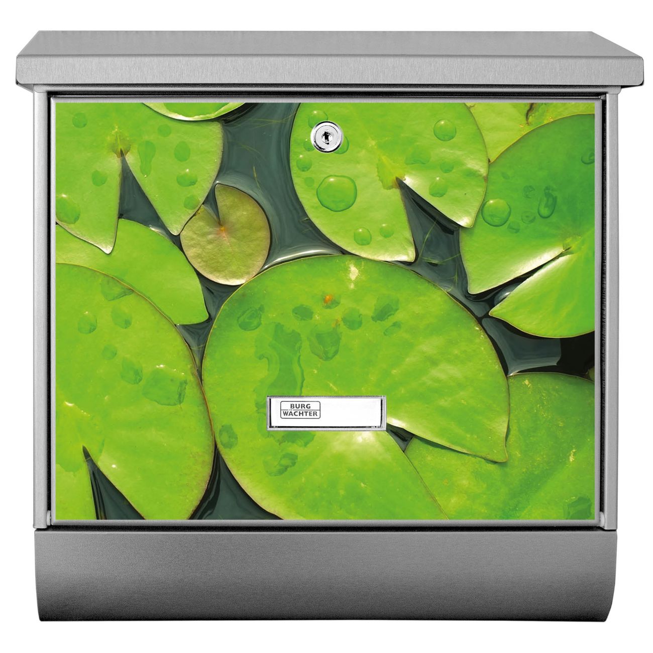 Der BURG-WÄCHTER Edelstahl Briefkasten mit Motiv Seerosenblätter und Zeitungsrolle bietet Ihnen mit seinem Fassungsvermögen genügend Platz auch für große A4 Sendungen und Zeitschriften. Das integrierte Regendach schützt Ihre Post vor dem Eindringen von Regen.