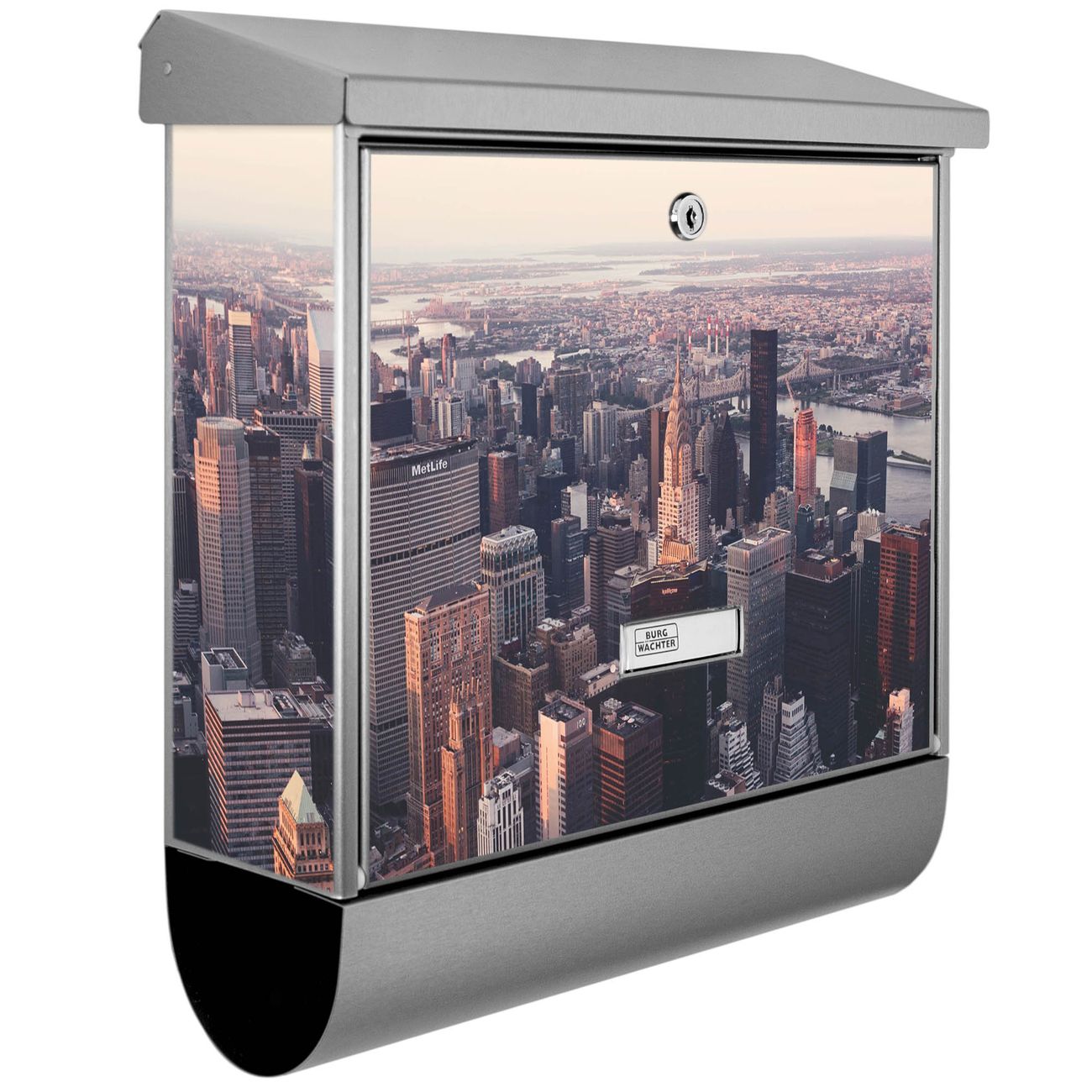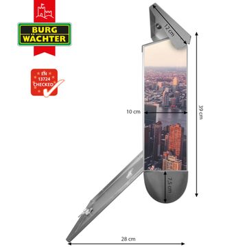Der BURG-WÄCHTER Edelstahl Briefkasten mit Motiv Skyline und Zeitungsrolle bietet Ihnen mit seinem Fassungsvermögen genügend Platz auch für große A4 Sendungen und Zeitschriften. Das integrierte Regendach schützt Ihre Post vor dem Eindringen von Regen.
