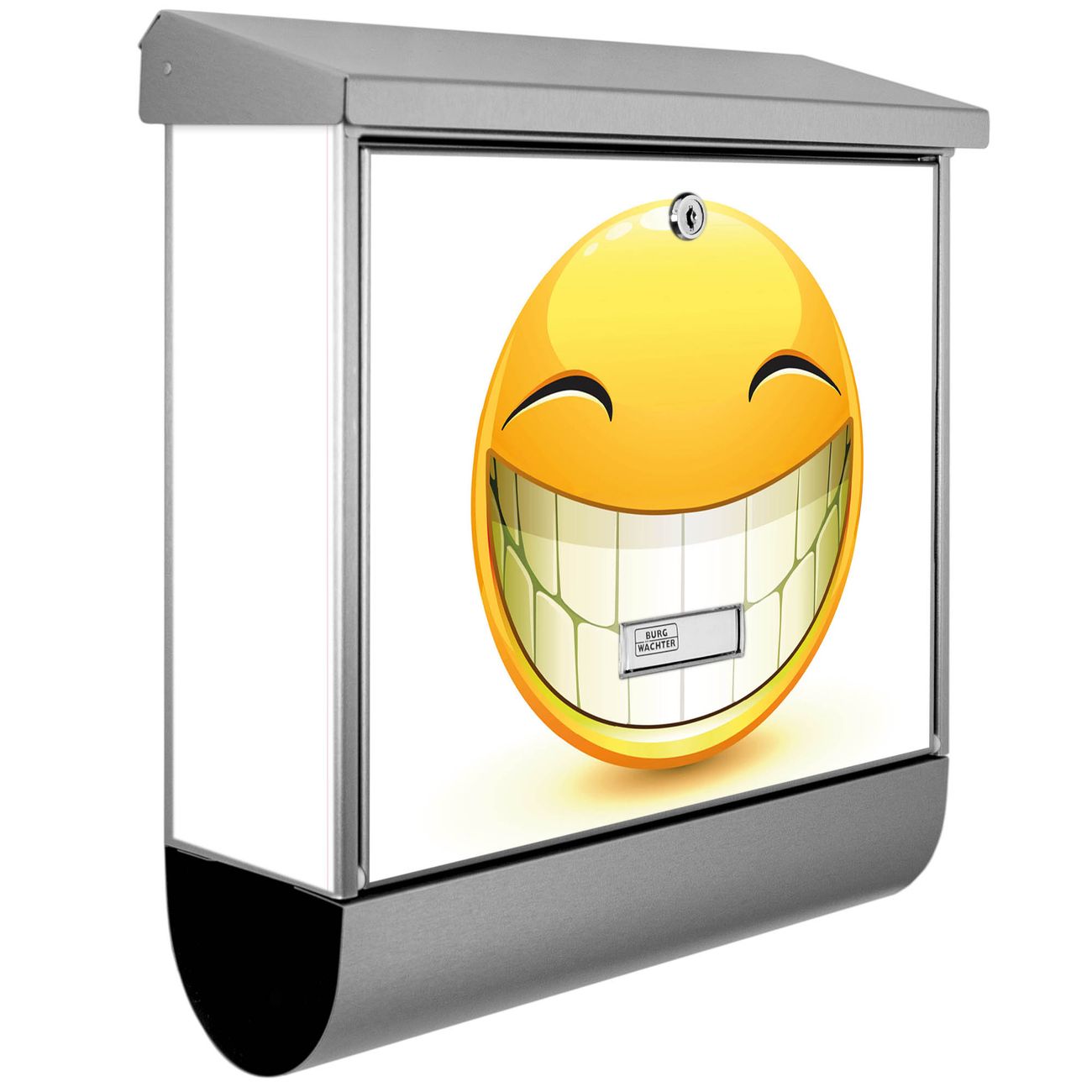 Der BURG-WÄCHTER Edelstahl Briefkasten mit Motiv Smile und Zeitungsrolle bietet Ihnen mit seinem Fassungsvermögen genügend Platz auch für große A4 Sendungen und Zeitschriften. Das integrierte Regendach schützt Ihre Post vor dem Eindringen von Regen.