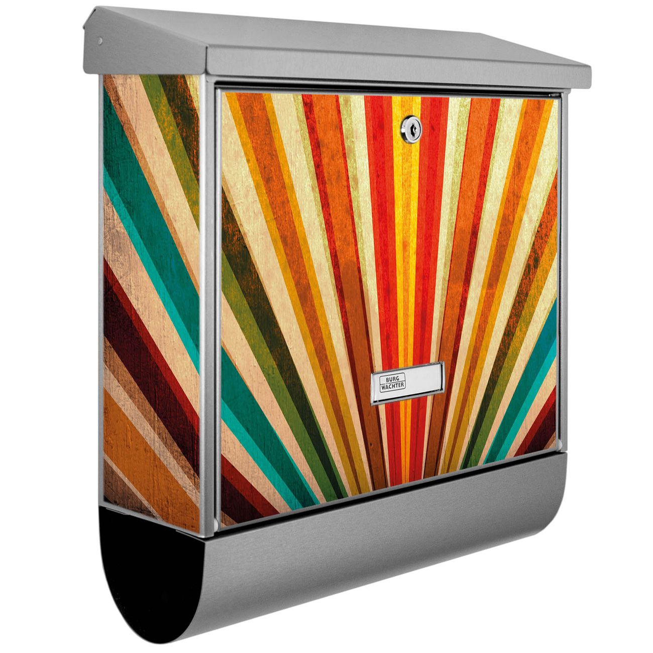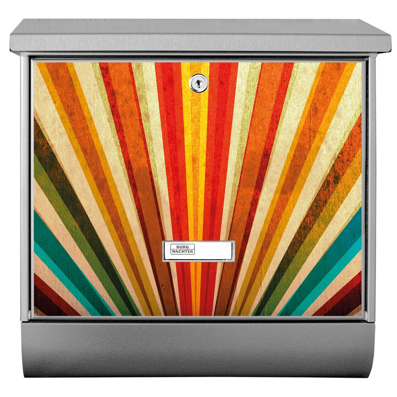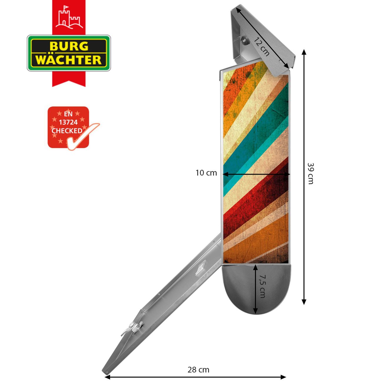 Der BURG-WÄCHTER Edelstahl Briefkasten mit Motiv Sonnenuntergang Abstrakt und Zeitungsrolle bietet Ihnen mit seinem Fassungsvermögen genügend Platz auch für große A4 Sendungen und Zeitschriften. Das integrierte Regendach schützt Ihre Post vor dem Eindringen von Regen.