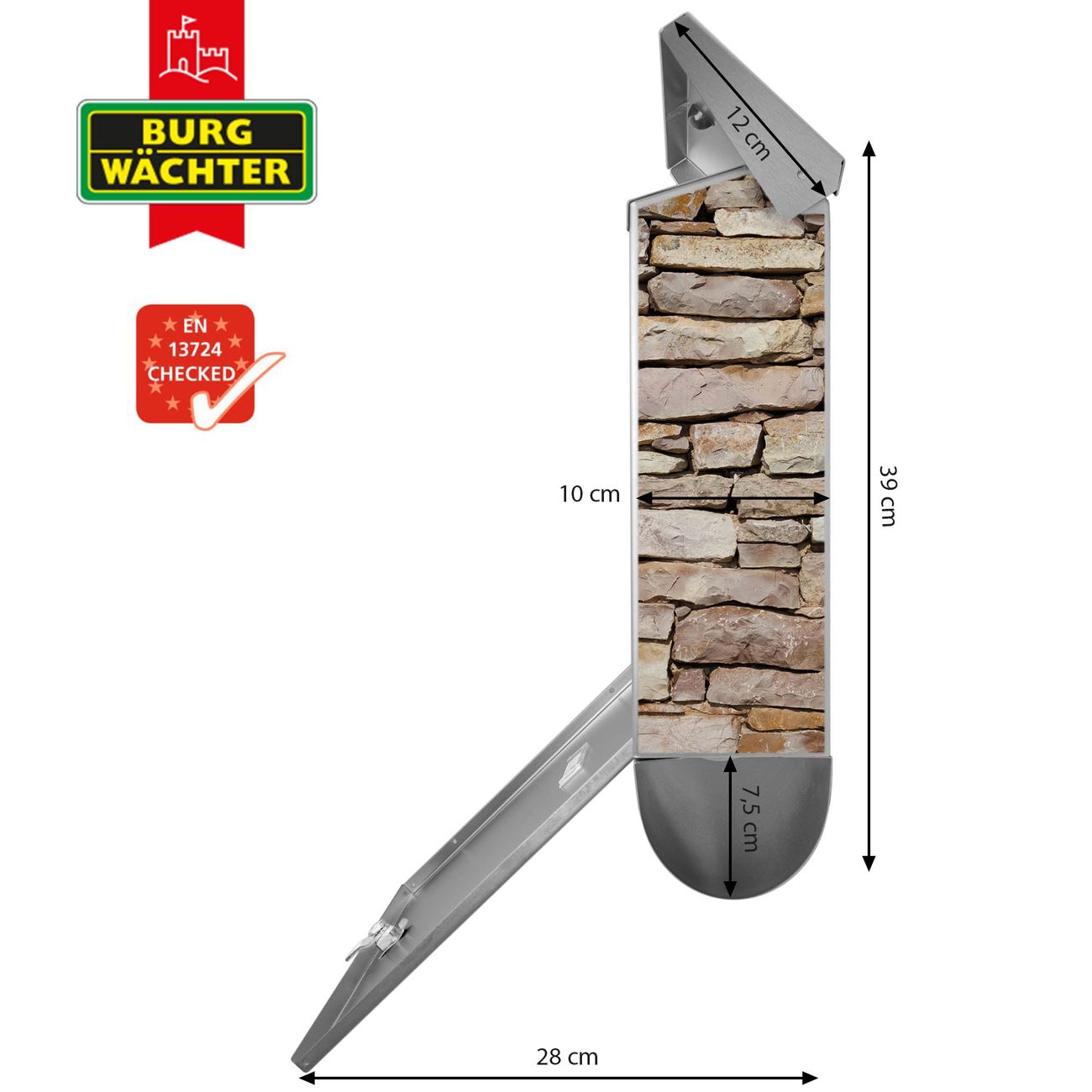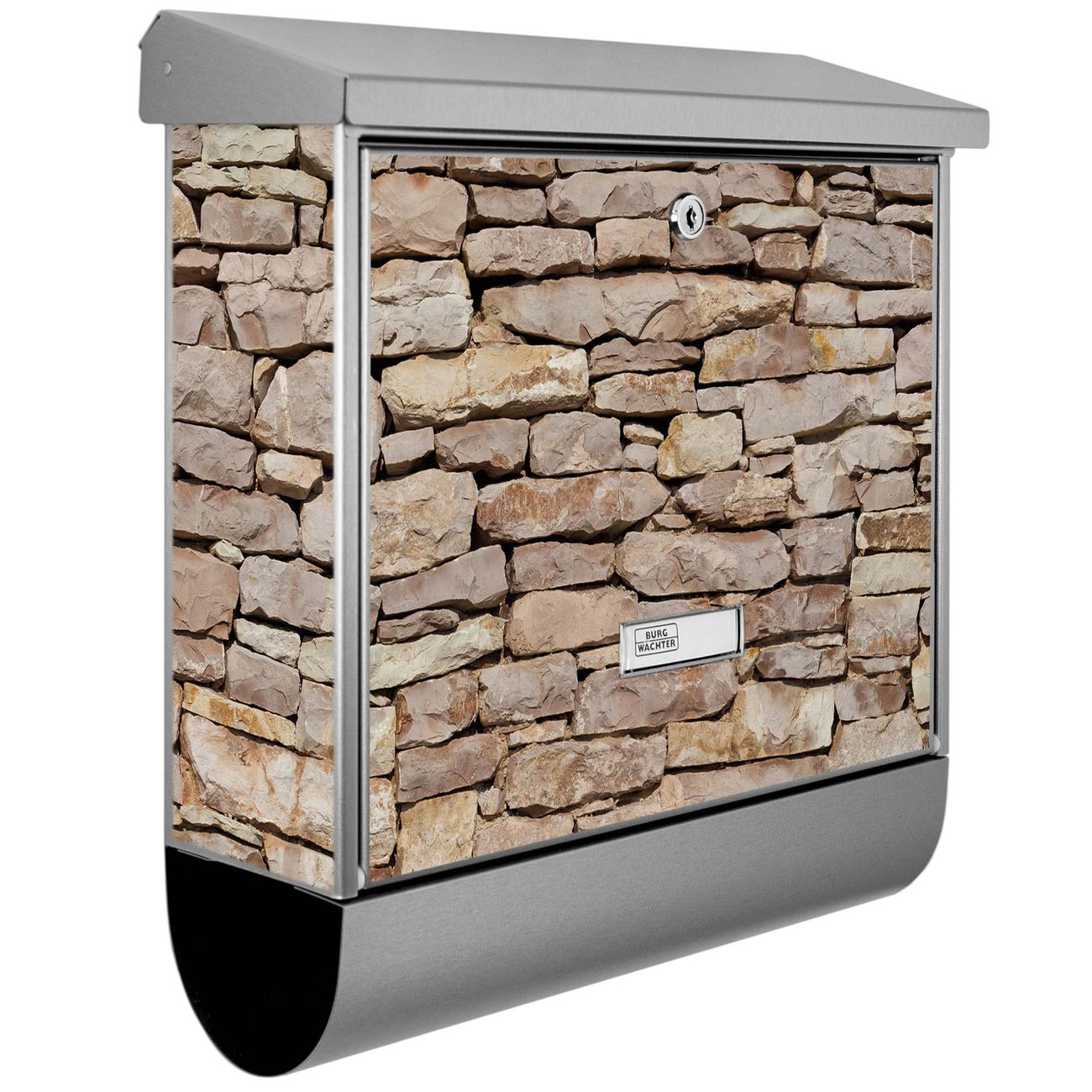 Der BURG-WÄCHTER Edelstahl Briefkasten mit Motiv Stadtmauer und Zeitungsrolle bietet Ihnen mit seinem Fassungsvermögen genügend Platz auch für große A4 Sendungen und Zeitschriften. Das integrierte Regendach schützt Ihre Post vor dem Eindringen von Regen.