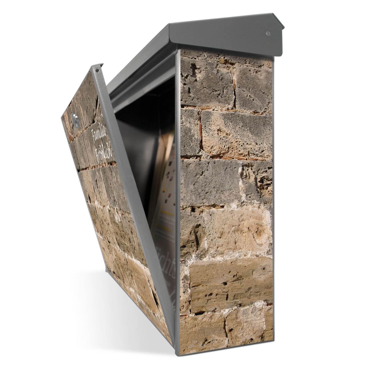 Der Postkasten mit Steinwand Antik Motiv hat ein sehr ansprechendes und zeitloses Design. Unsere Motivpalette hält jede Menge Varianten bereit, ob klassisch, modern, verspielt oder witzig - für jeden haben wir das passende Motiv parat. Der Briefkasten ist das Aushängeschild Ihres Hauses.