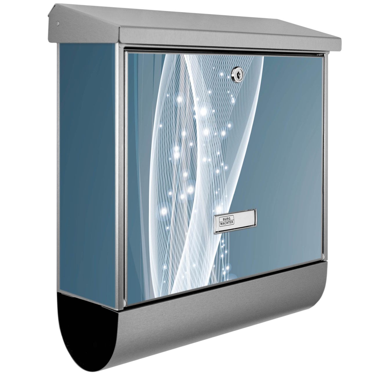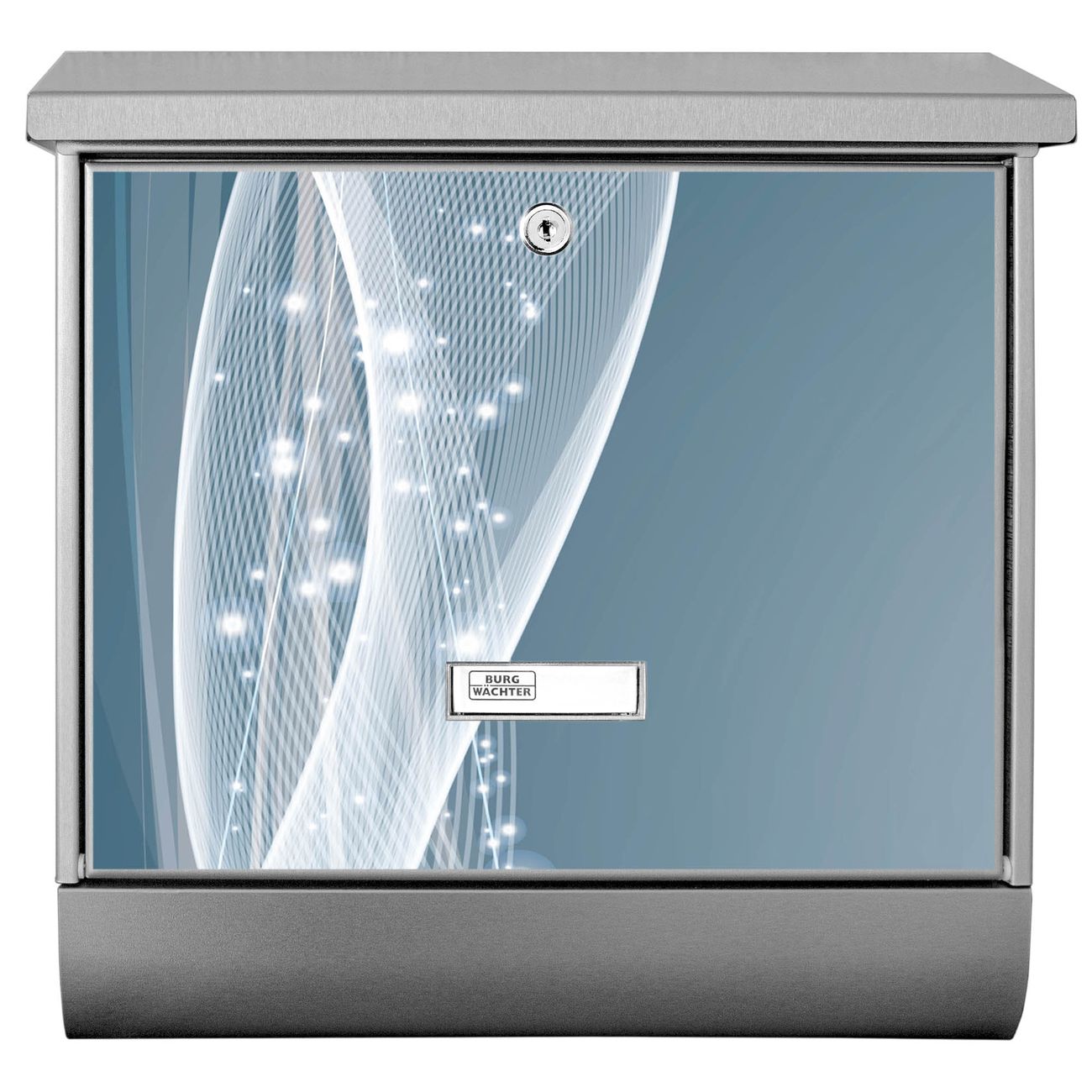 Der BURG-WÄCHTER Edelstahl Briefkasten mit Motiv Sternenstaub und Zeitungsrolle bietet Ihnen mit seinem Fassungsvermögen genügend Platz auch für große A4 Sendungen und Zeitschriften. Das integrierte Regendach schützt Ihre Post vor dem Eindringen von Regen.