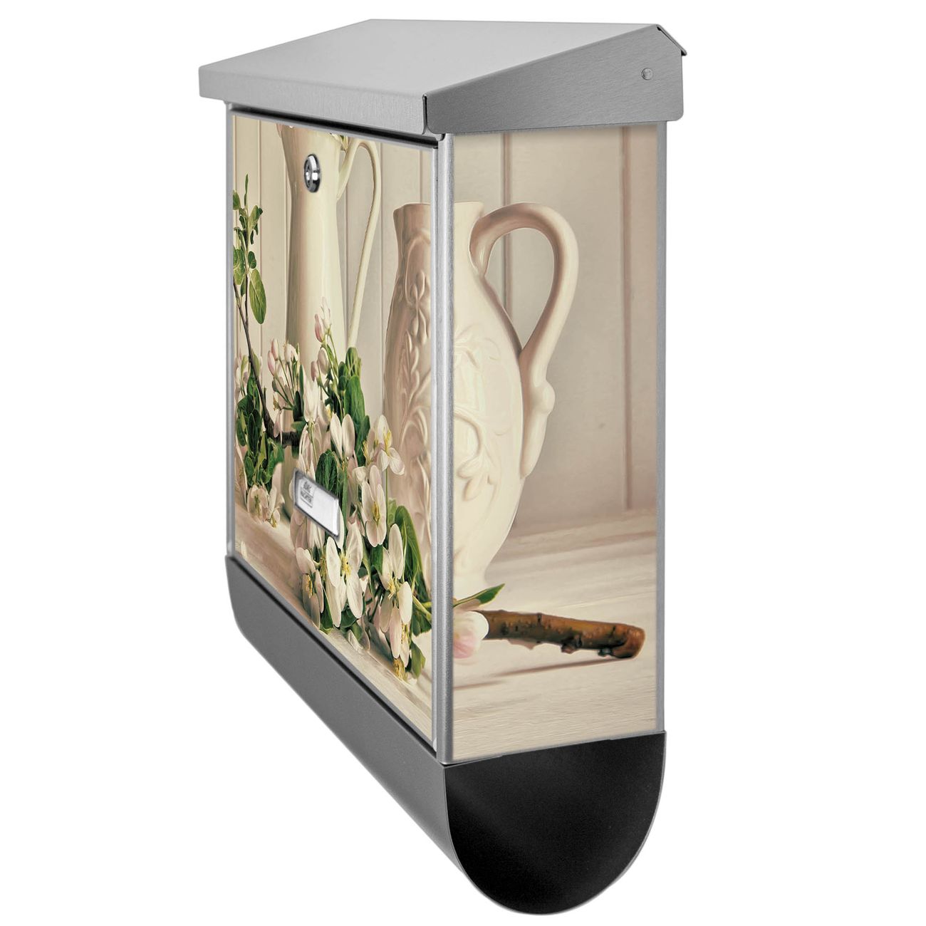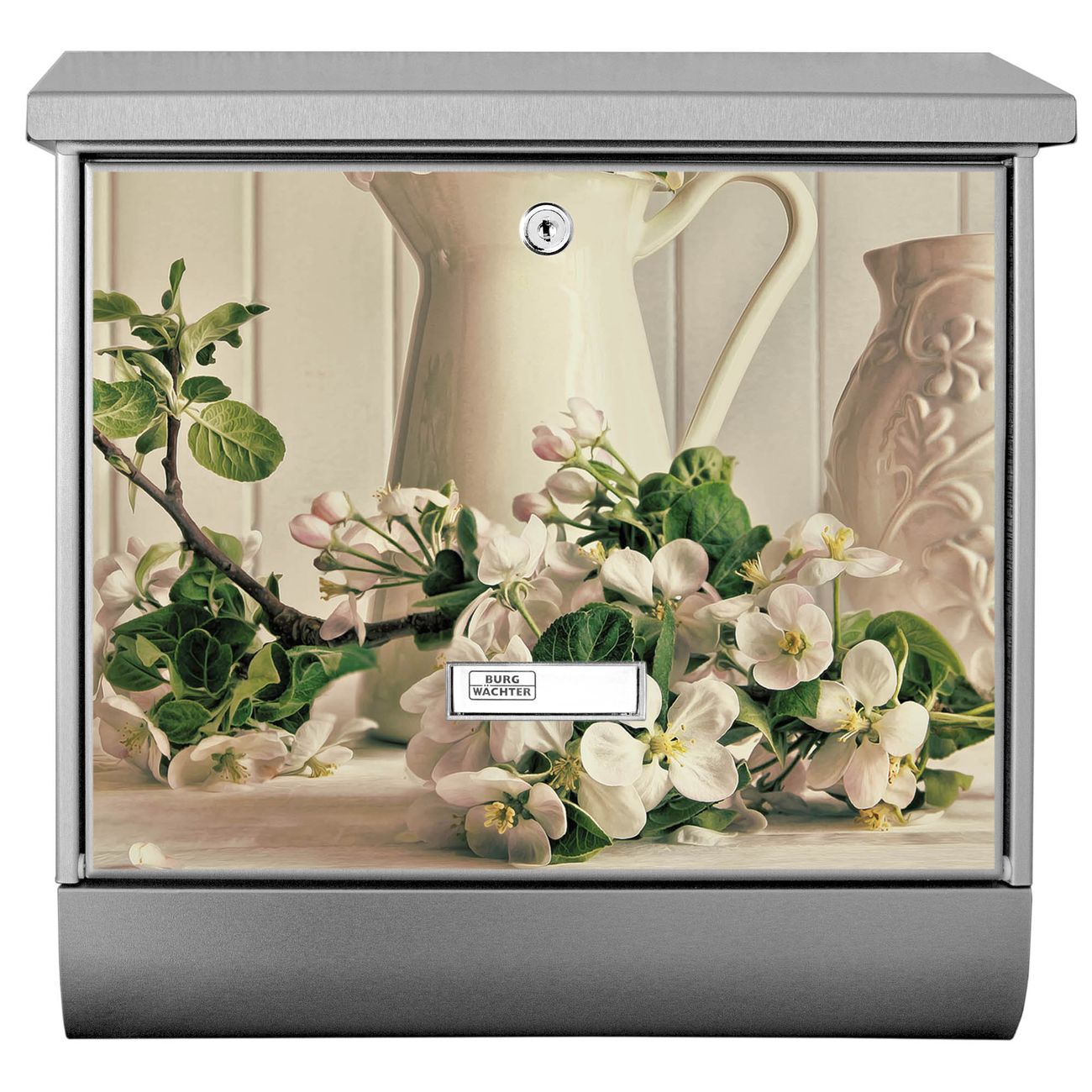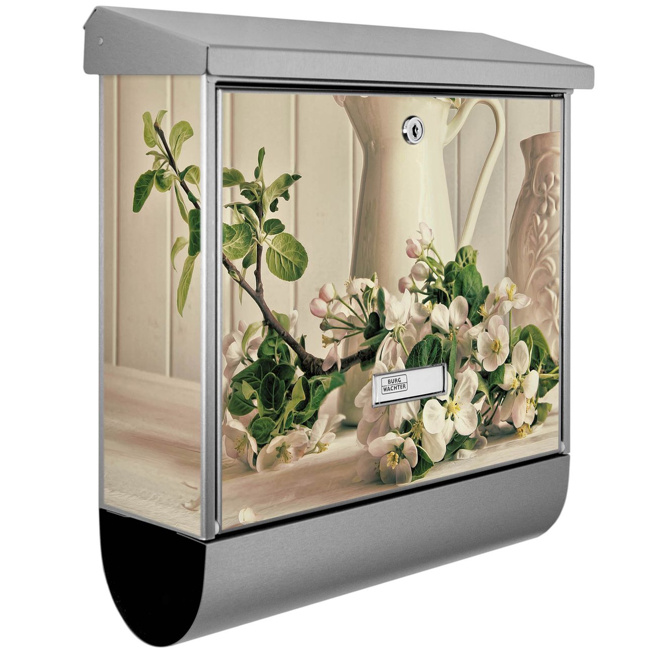 Der BURG-WÄCHTER Edelstahl Briefkasten mit Motiv Stillleben Kirschblüten und Zeitungsrolle bietet Ihnen mit seinem Fassungsvermögen genügend Platz auch für große A4 Sendungen und Zeitschriften. Das integrierte Regendach schützt Ihre Post vor dem Eindringen von Regen.
