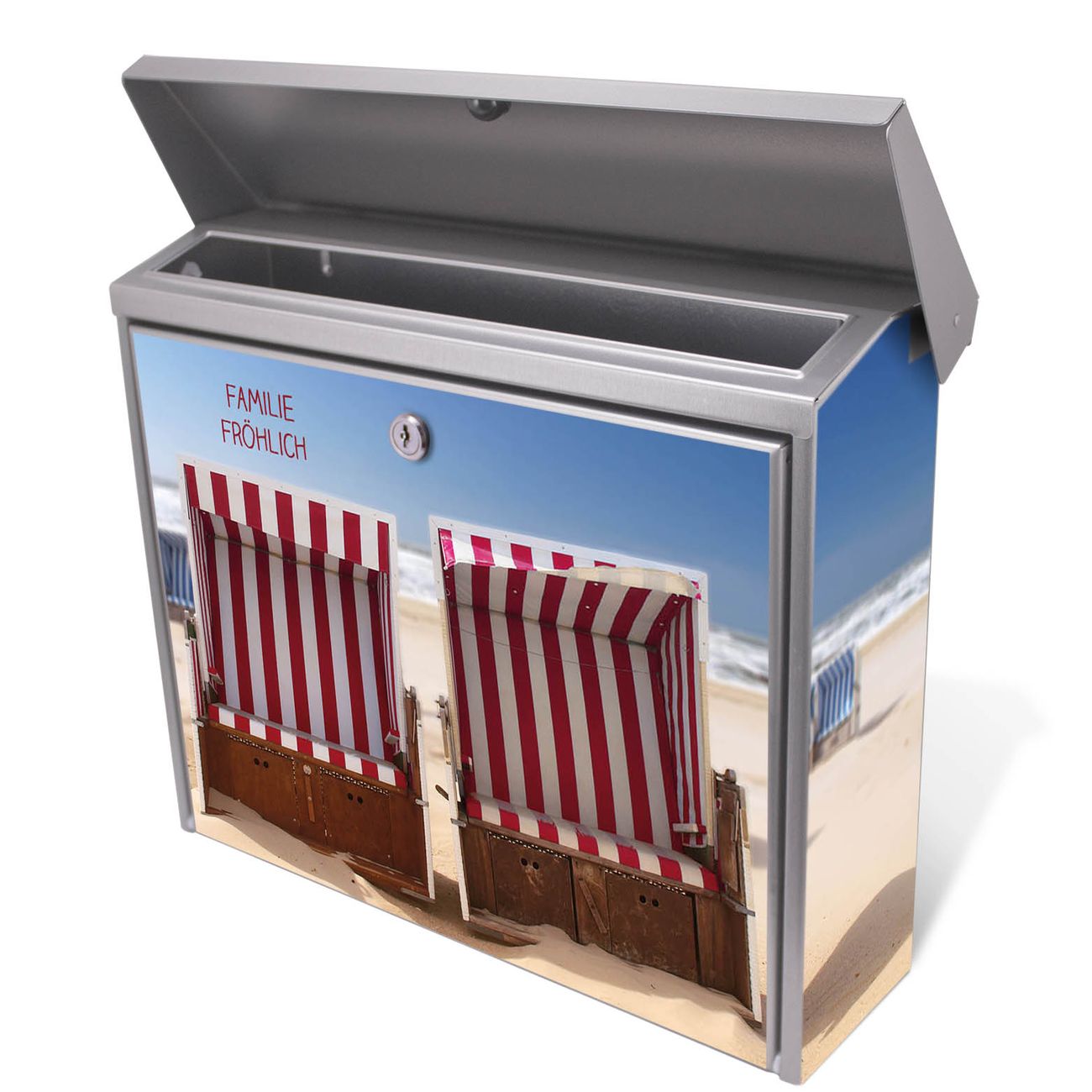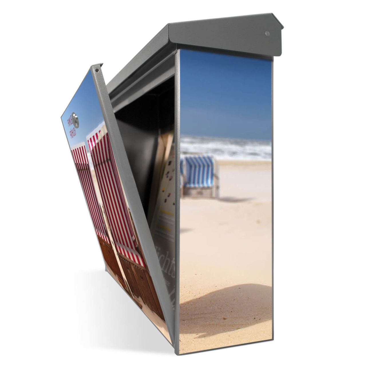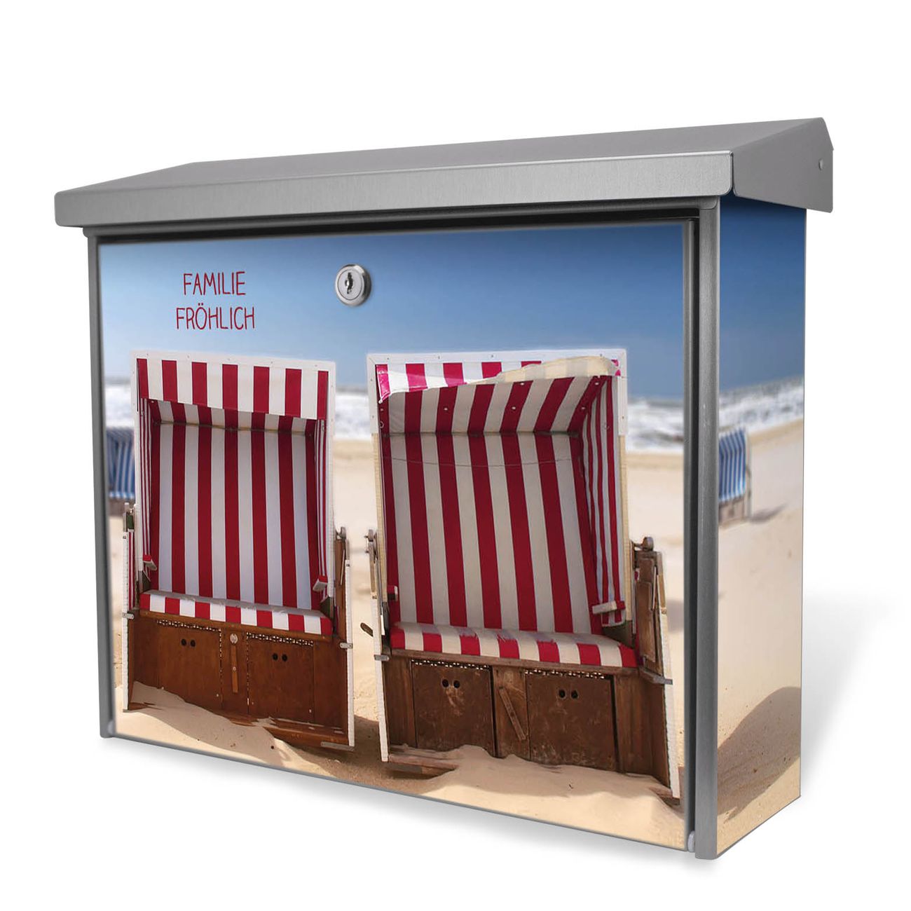 Der Postkasten mit Strandkörbe Motiv hat ein sehr ansprechendes und zeitloses Design. Unsere Motivpalette hält jede Menge Varianten bereit, ob klassisch, modern, verspielt oder witzig - für jeden haben wir das passende Motiv parat. Der Briefkasten ist das Aushängeschild Ihres Hauses.