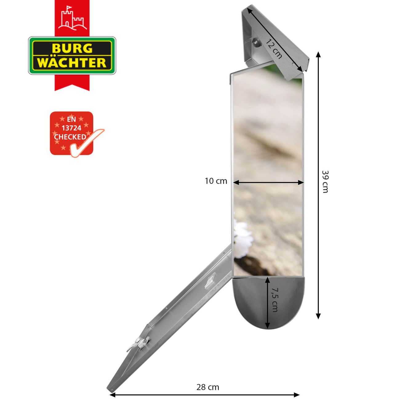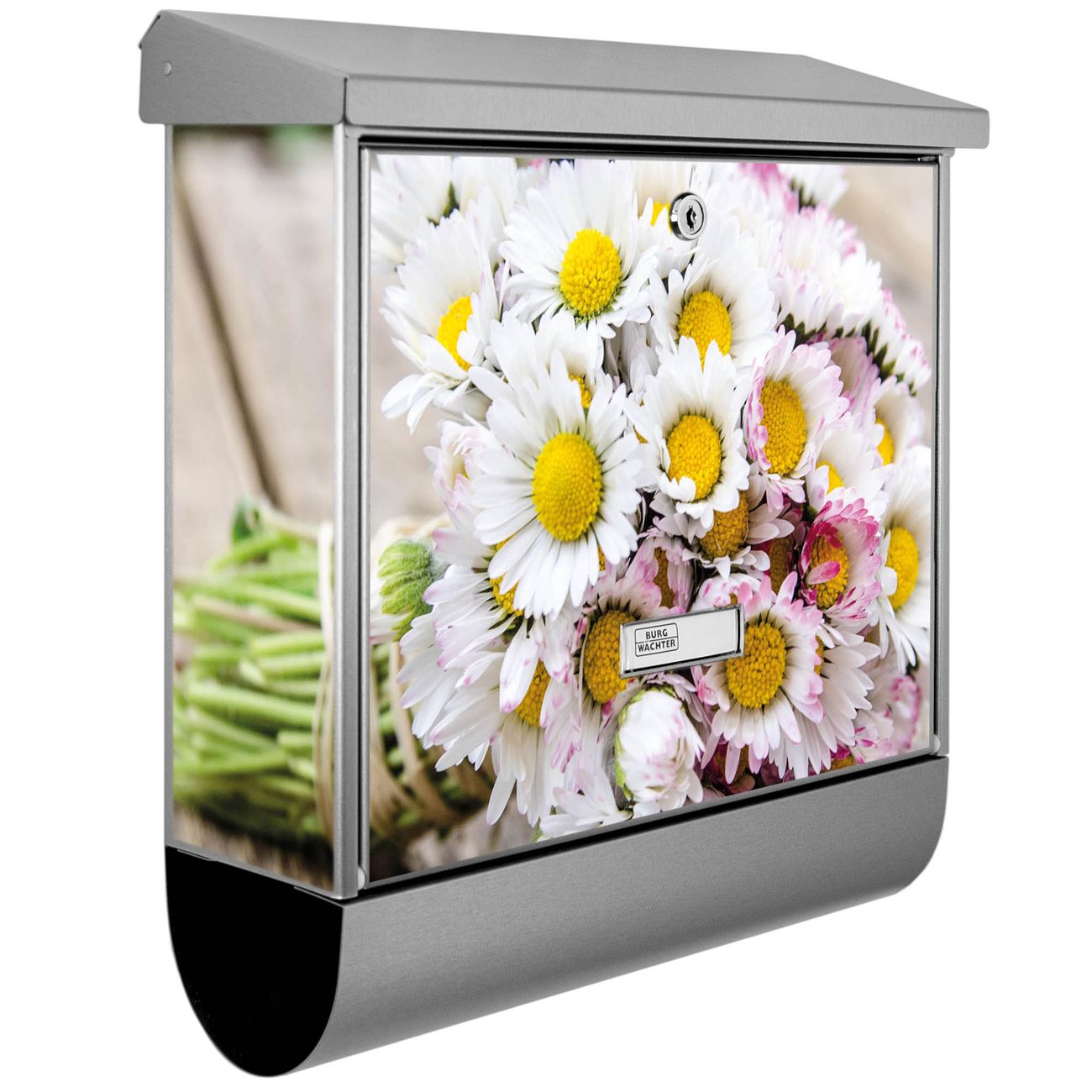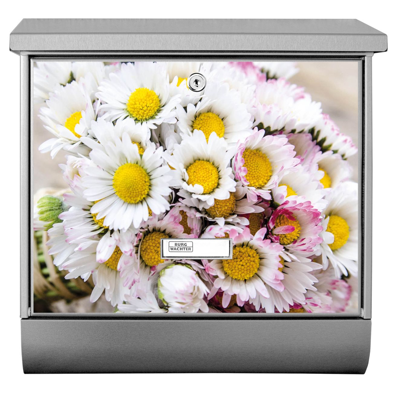 Der BURG-WÄCHTER Edelstahl Briefkasten mit Motiv Strauß Gänseblümchen und Zeitungsrolle bietet Ihnen mit seinem Fassungsvermögen genügend Platz auch für große A4 Sendungen und Zeitschriften. Das integrierte Regendach schützt Ihre Post vor dem Eindringen von Regen.