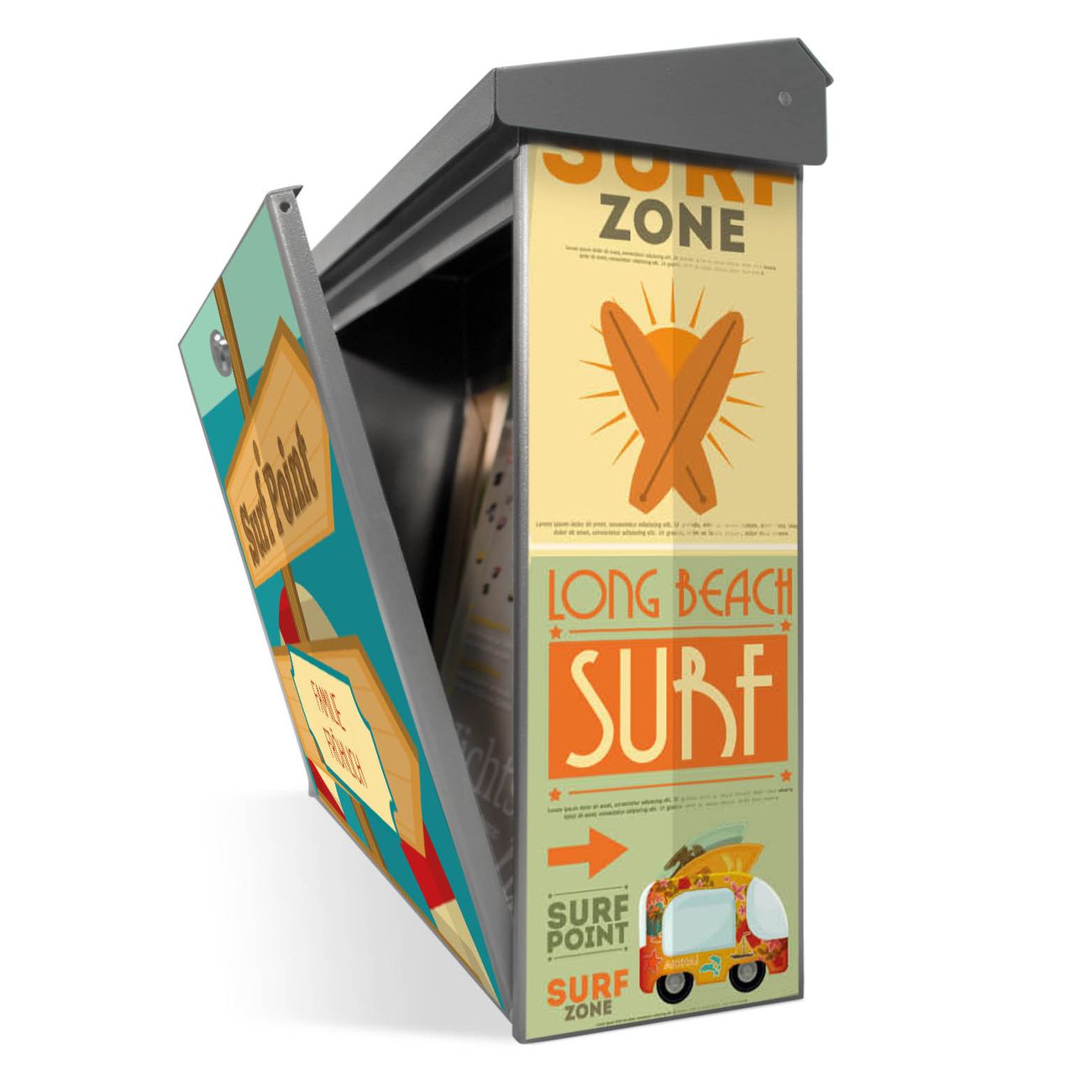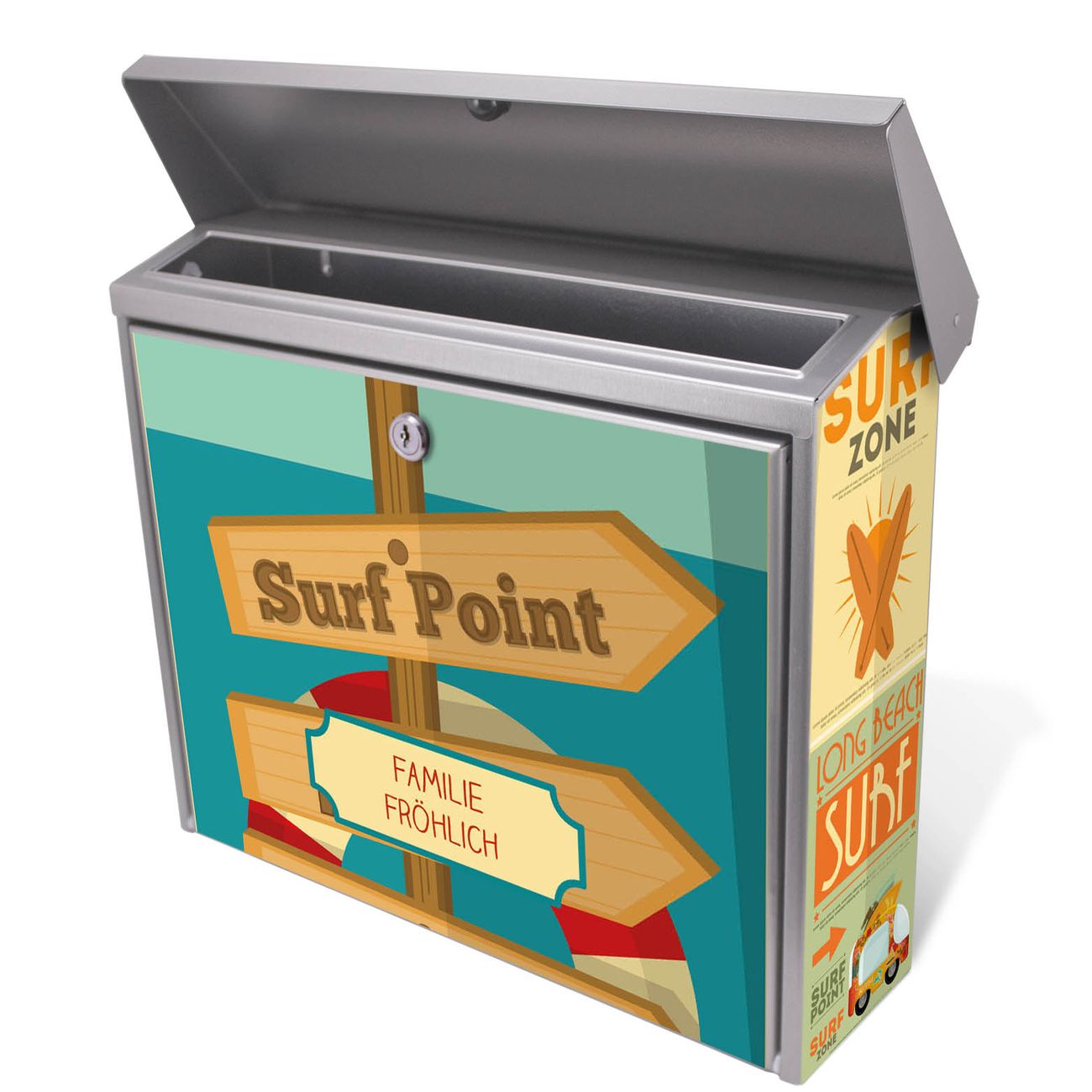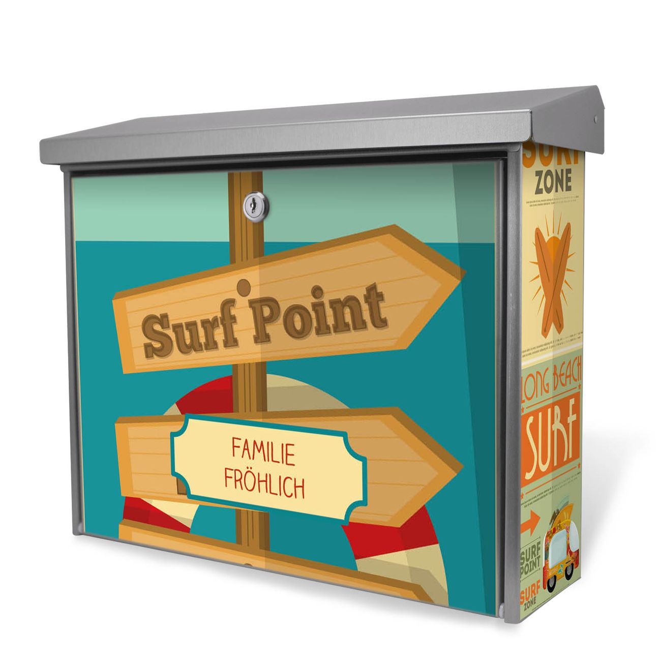 Der Postkasten mit Surf Point Motiv hat ein sehr ansprechendes und zeitloses Design. Unsere Motivpalette hält jede Menge Varianten bereit, ob klassisch, modern, verspielt oder witzig - für jeden haben wir das passende Motiv parat. Der Briefkasten ist das Aushängeschild Ihres Hauses.
