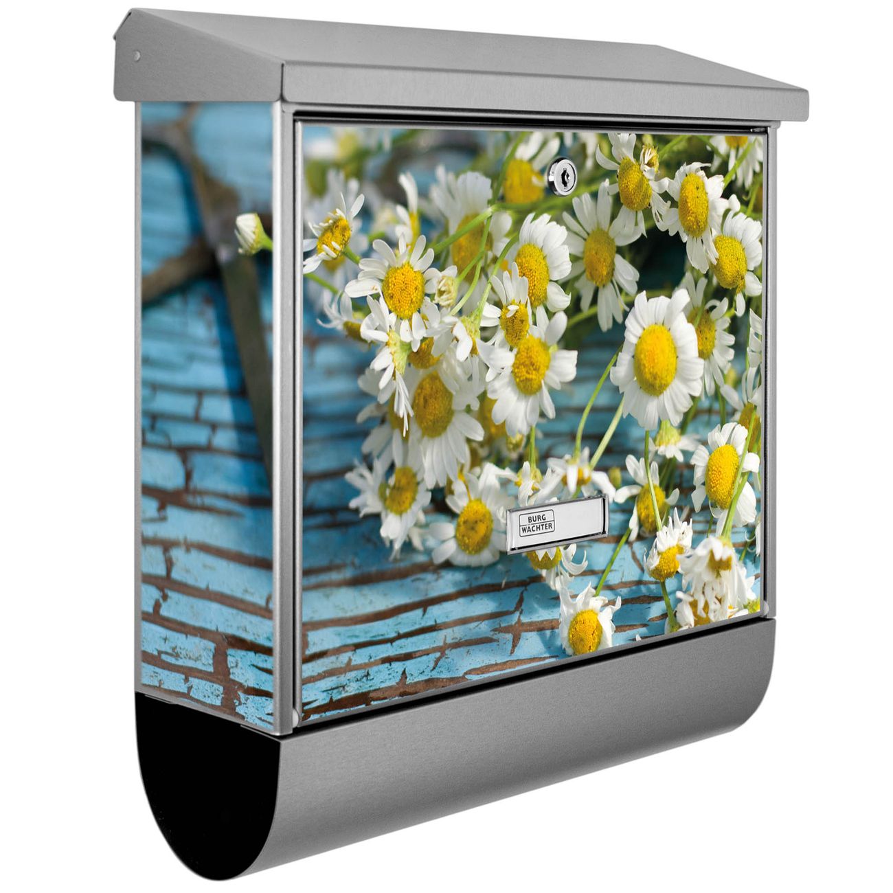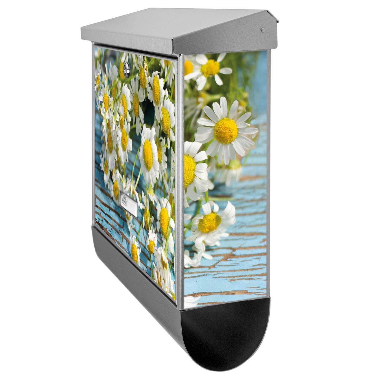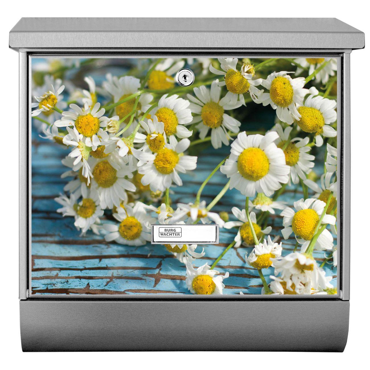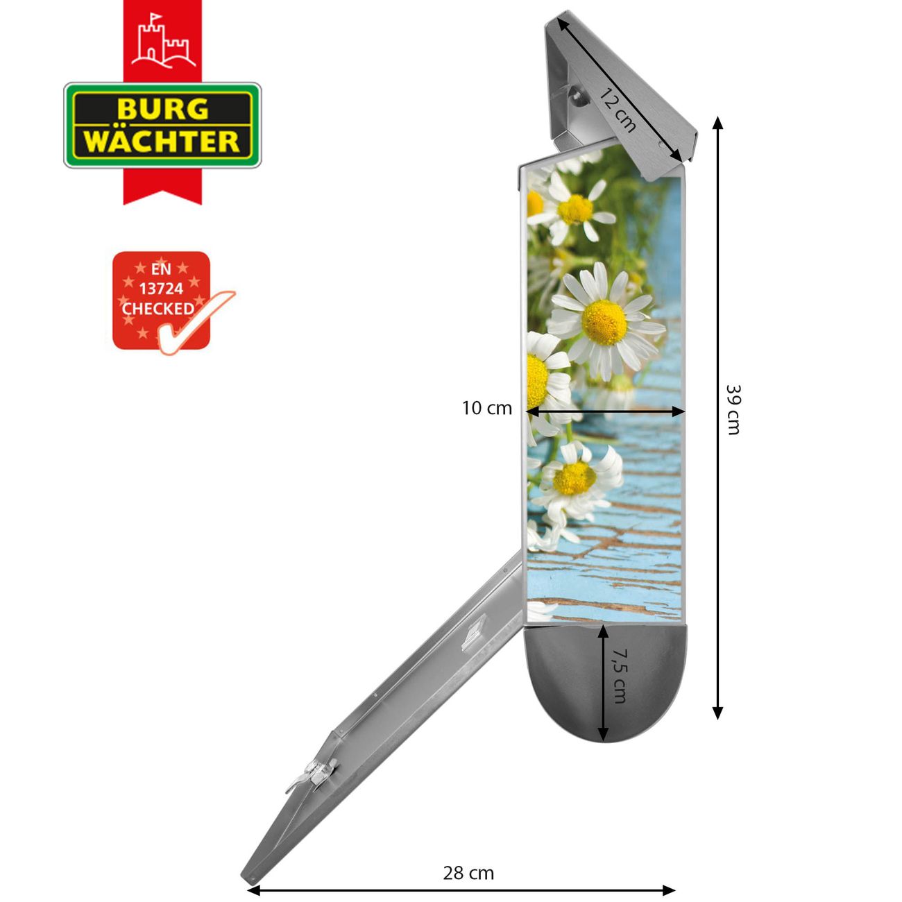 Der BURG-WÄCHTER Edelstahl Briefkasten mit Motiv Tausendschön und Zeitungsrolle bietet Ihnen mit seinem Fassungsvermögen genügend Platz auch für große A4 Sendungen und Zeitschriften. Das integrierte Regendach schützt Ihre Post vor dem Eindringen von Regen.