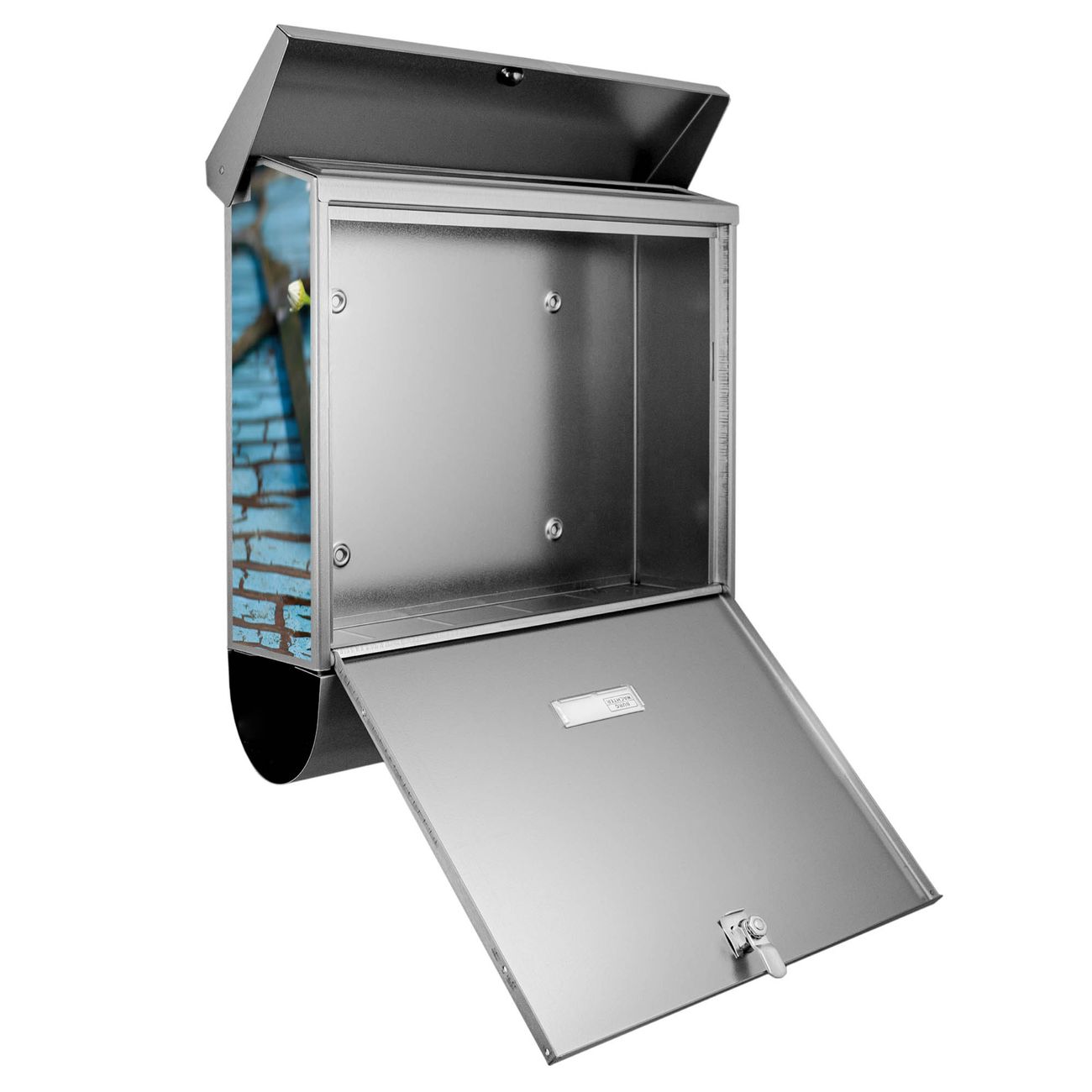 Der Briefkasten besteht aus Edelstahl, einem hochwertigen Material das rostfrei und äußerst unempfindlich gegenüber Witterungseinflüssen ist. Das Motiv besteht aus einer wetter- und UV-festen Folie, die Ihren Briefkasten zusätzlich vor Kratzern schützt. Der Postkasten ist je nach Auswahl 38 x 39 x 12 CM oder 38 x 31,5 x 12 cm (BxHxT) groß. Der Briefeinwurf ist 33,2cm x 3,1cm, Format DIN C4. Der Briefkasten wird mit Montagematerial und zwei Schlüsseln geliefert.