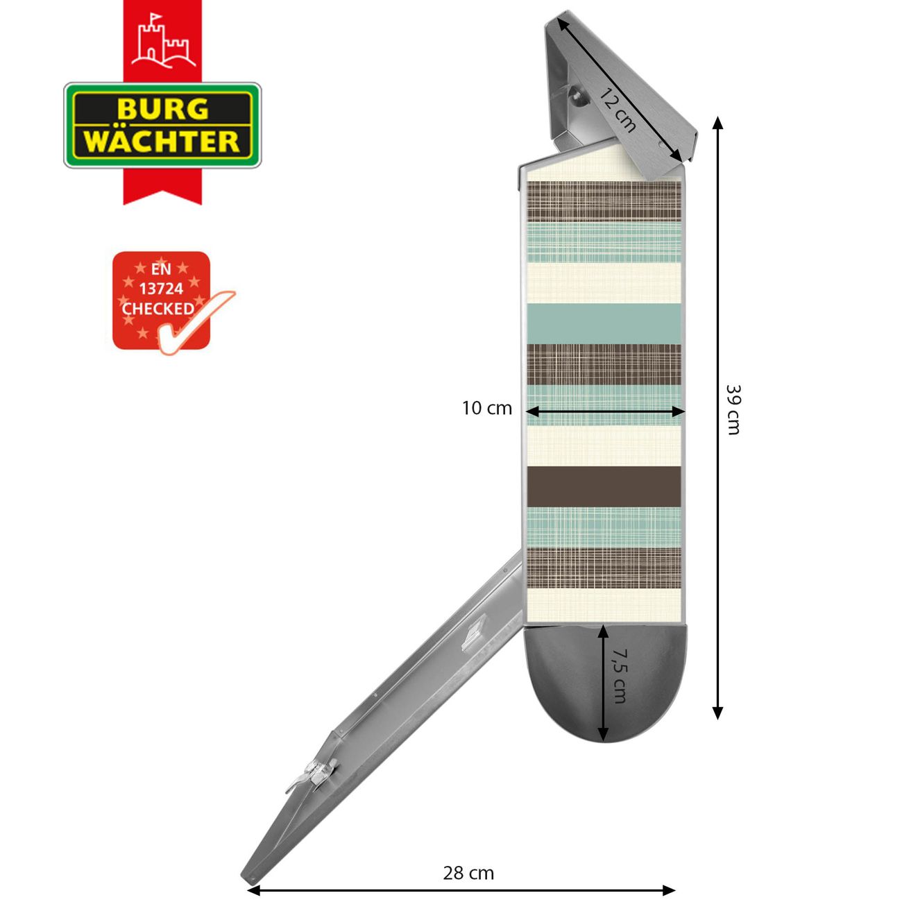 Der BURG-WÄCHTER Edelstahl Briefkasten mit Motiv Textile Streifen und Zeitungsrolle bietet Ihnen mit seinem Fassungsvermögen genügend Platz auch für große A4 Sendungen und Zeitschriften. Das integrierte Regendach schützt Ihre Post vor dem Eindringen von Regen.