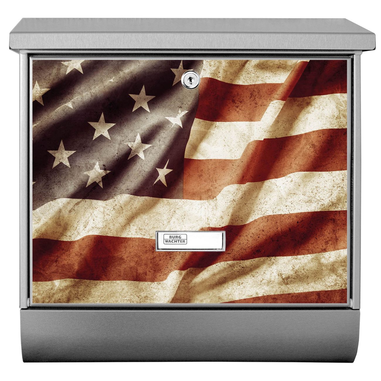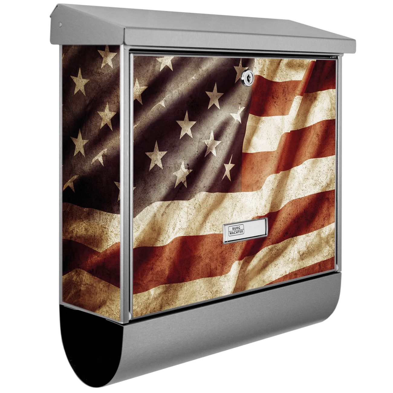 Der BURG-WÄCHTER Edelstahl Briefkasten mit Motiv United States und Zeitungsrolle bietet Ihnen mit seinem Fassungsvermögen genügend Platz auch für große A4 Sendungen und Zeitschriften. Das integrierte Regendach schützt Ihre Post vor dem Eindringen von Regen.