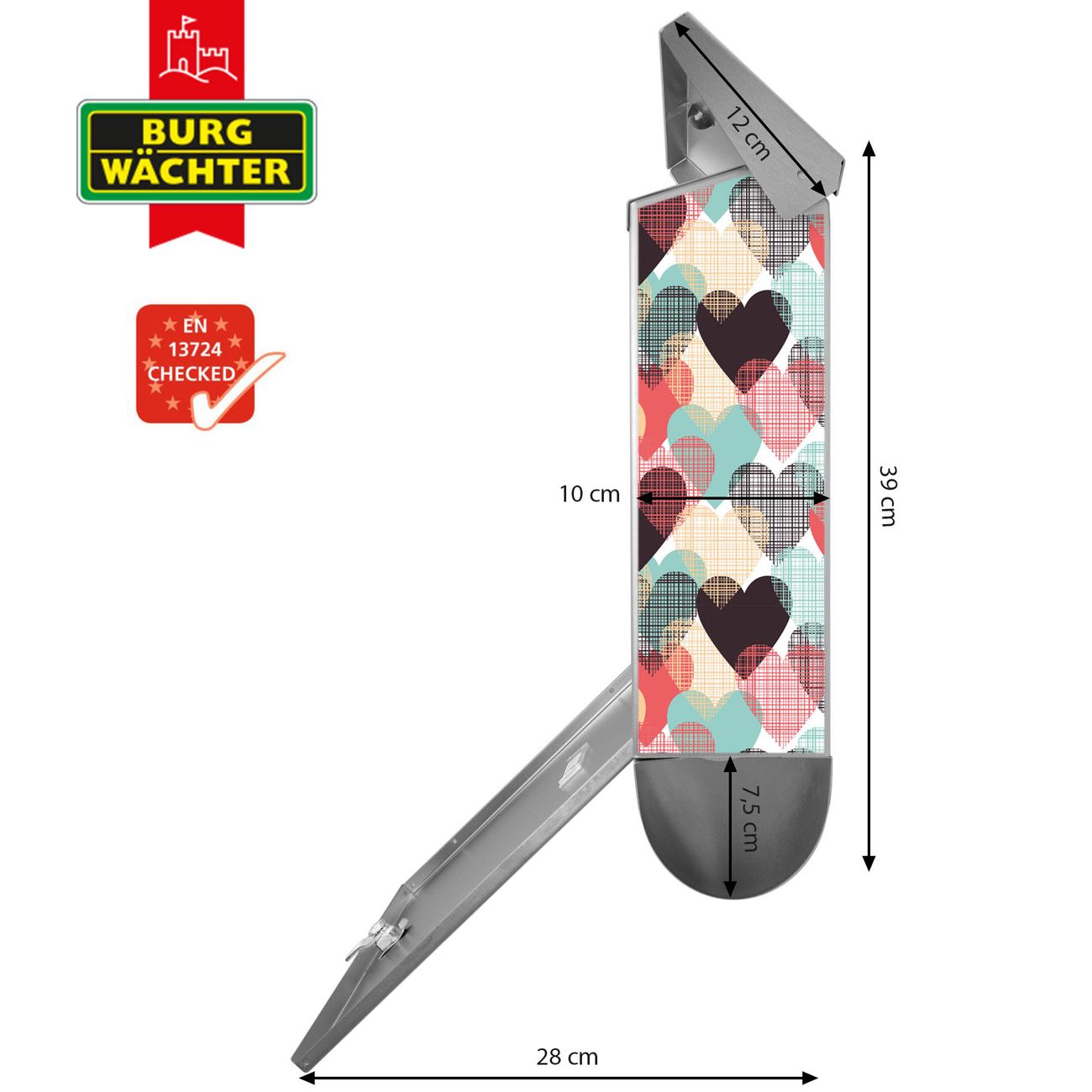 Der BURG-WÄCHTER Edelstahl Briefkasten mit Motiv Unter Herzen und Zeitungsrolle bietet Ihnen mit seinem Fassungsvermögen genügend Platz auch für große A4 Sendungen und Zeitschriften. Das integrierte Regendach schützt Ihre Post vor dem Eindringen von Regen.