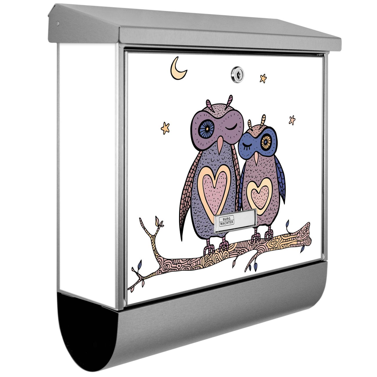 Der BURG-WÄCHTER Edelstahl Briefkasten mit Motiv Verliebte Eulen und Zeitungsrolle bietet Ihnen mit seinem Fassungsvermögen genügend Platz auch für große A4 Sendungen und Zeitschriften. Das integrierte Regendach schützt Ihre Post vor dem Eindringen von Regen.