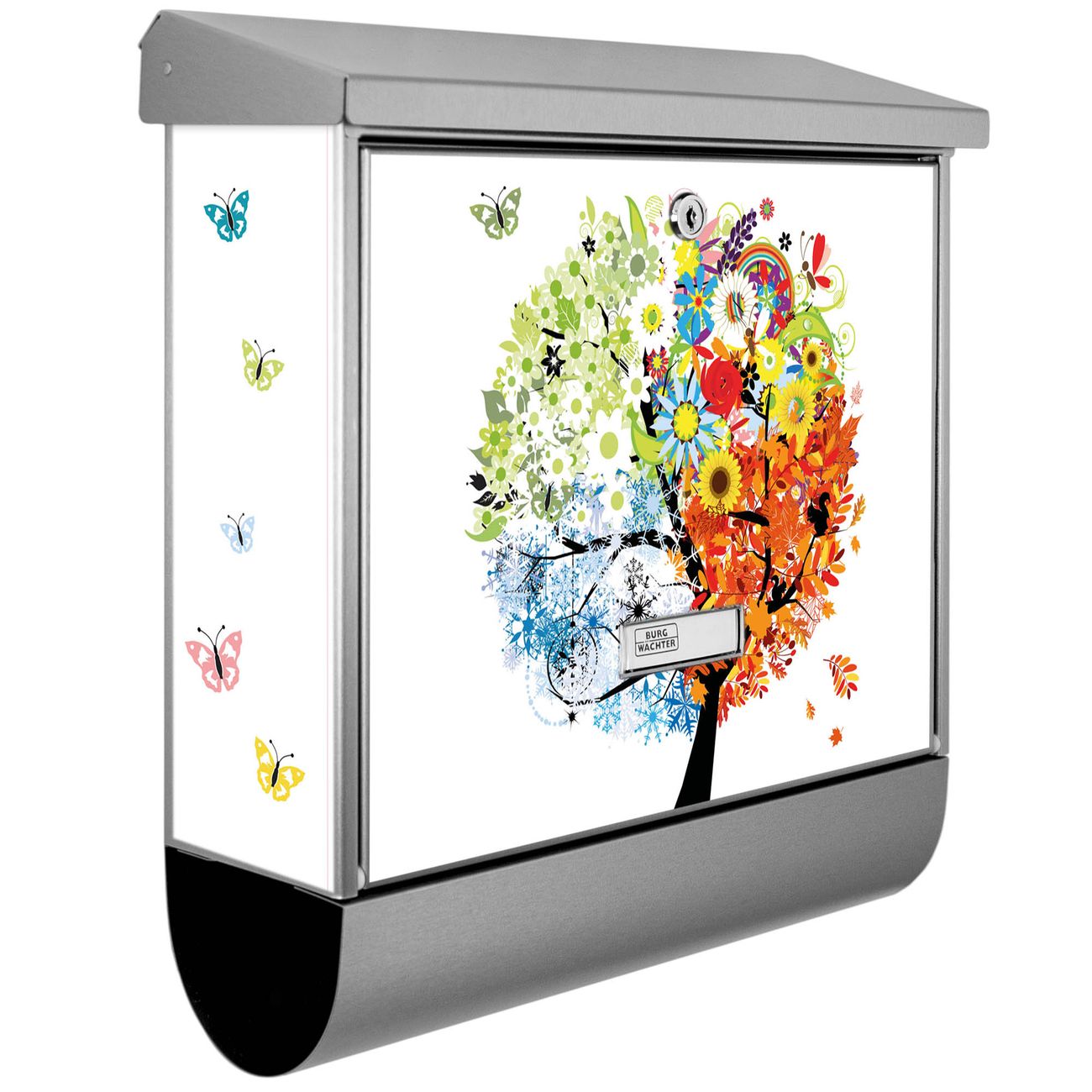 Der BURG-WÄCHTER Edelstahl Briefkasten mit Motiv Vier Jahreszeiten und Zeitungsrolle bietet Ihnen mit seinem Fassungsvermögen genügend Platz auch für große A4 Sendungen und Zeitschriften. Das integrierte Regendach schützt Ihre Post vor dem Eindringen von Regen.