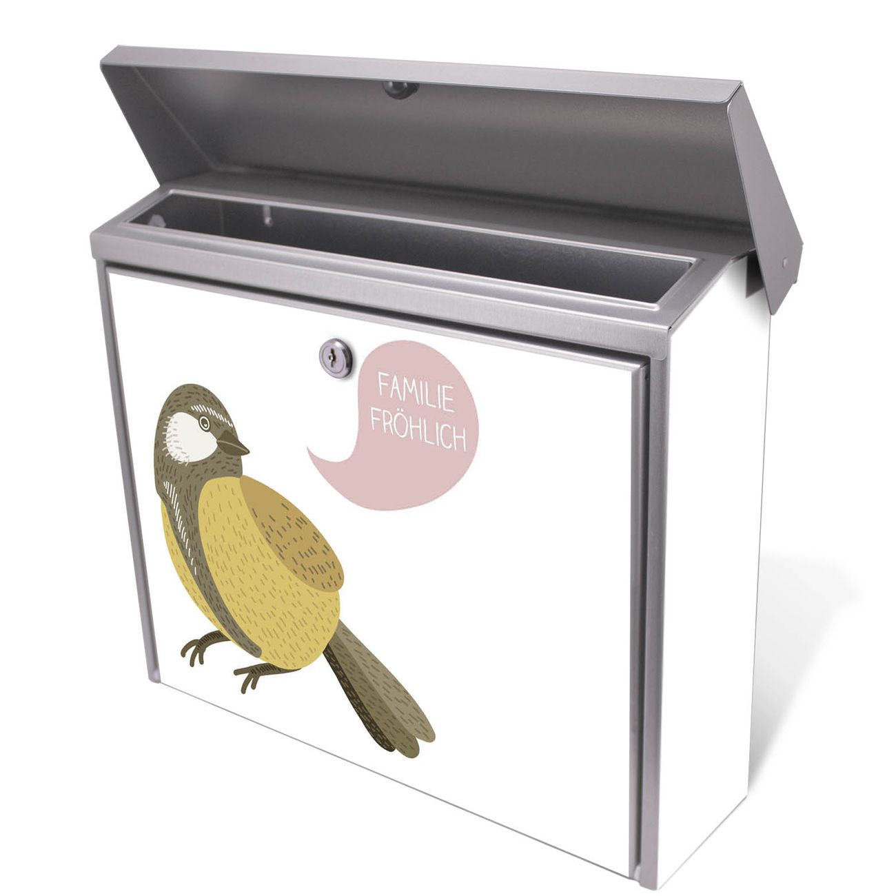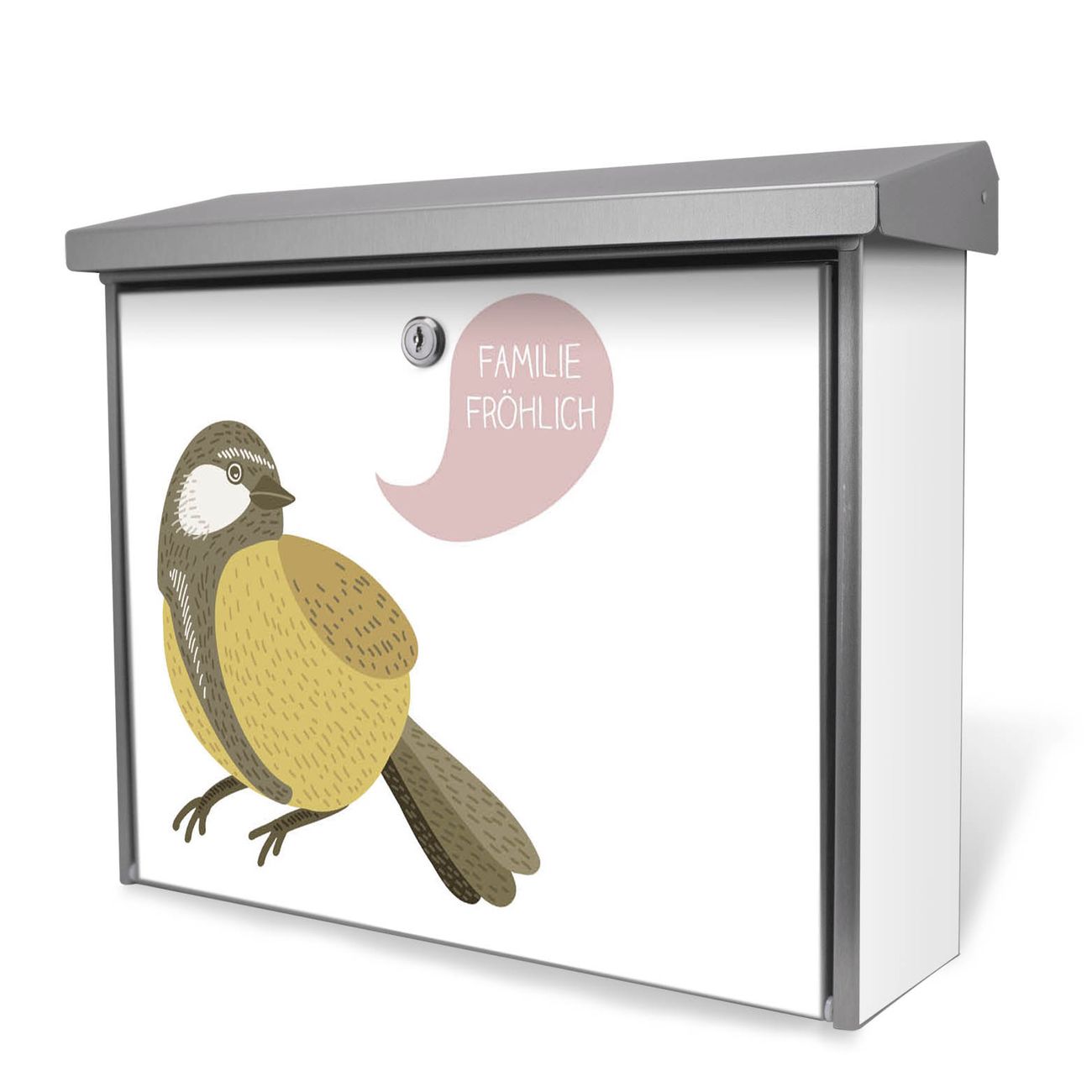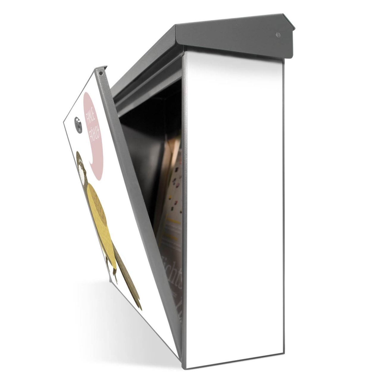 Der Postkasten mit Vogel mit Sprechblase Motiv hat ein sehr ansprechendes und zeitloses Design. Unsere Motivpalette hält jede Menge Varianten bereit, ob klassisch, modern, verspielt oder witzig - für jeden haben wir das passende Motiv parat. Der Briefkasten ist das Aushängeschild Ihres Hauses.