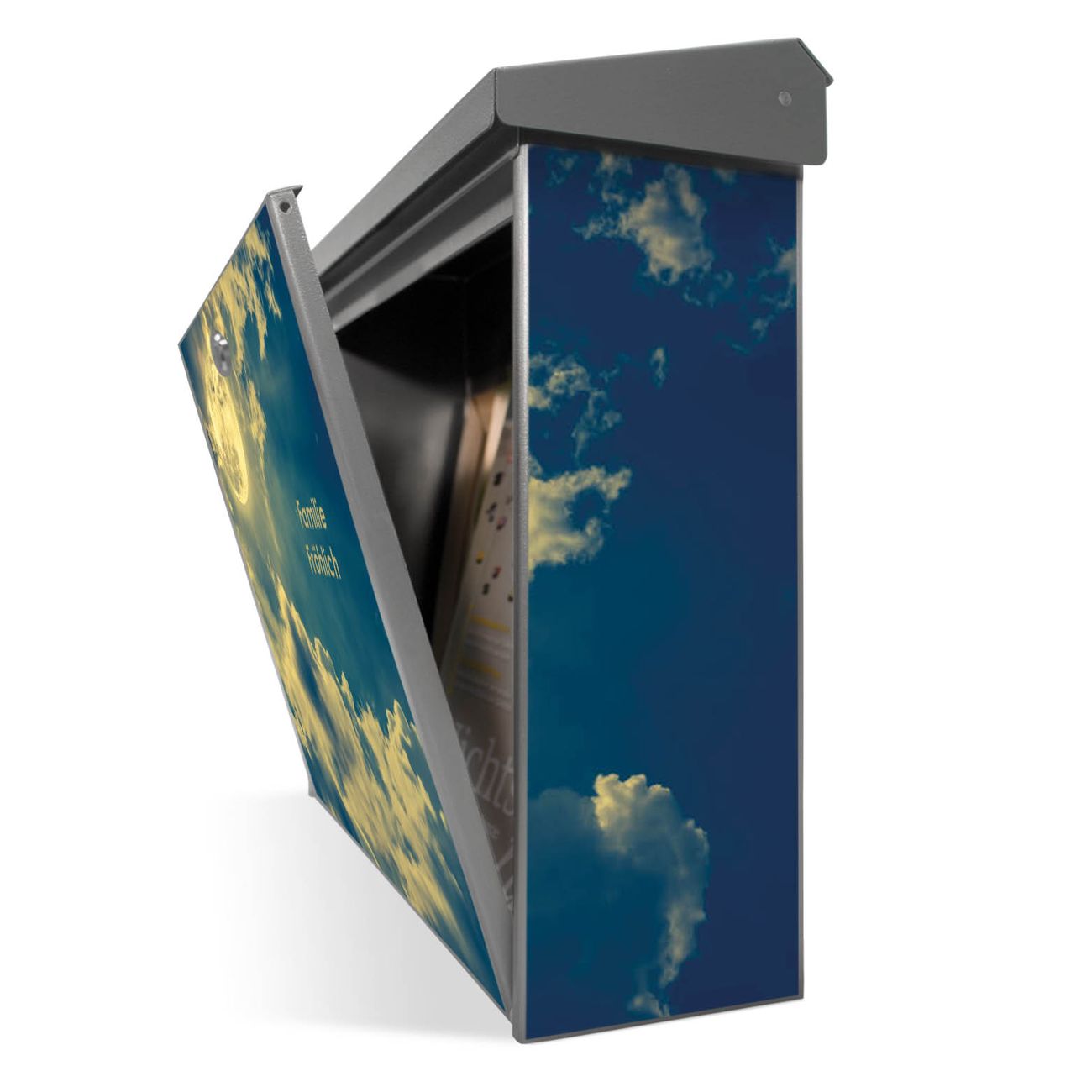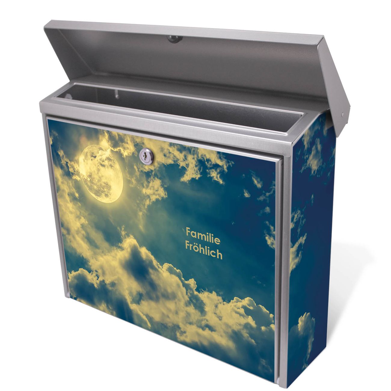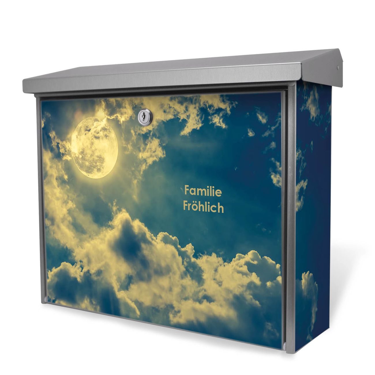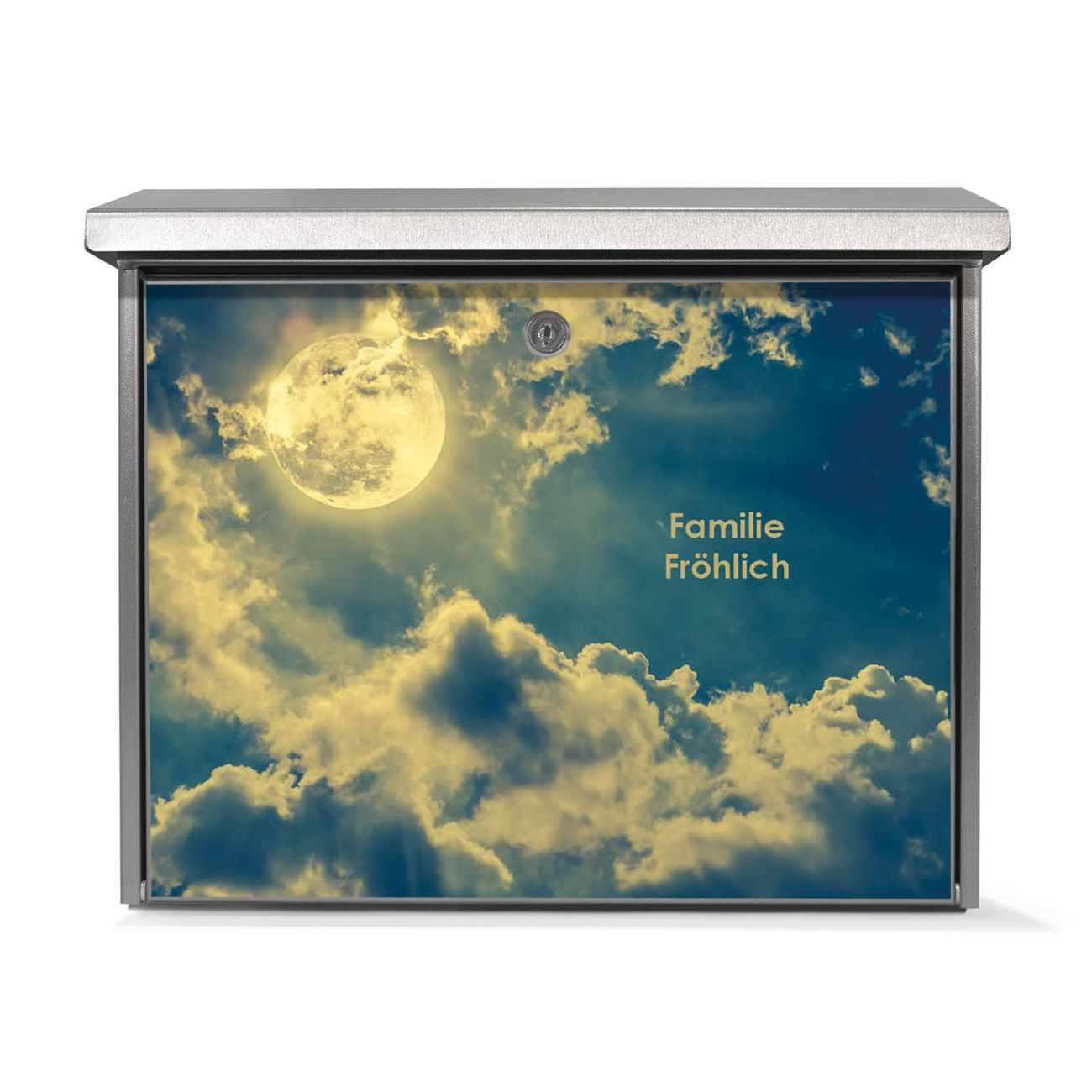 Der Postkasten mit Vollmond 2 Motiv hat ein sehr ansprechendes und zeitloses Design. Unsere Motivpalette hält jede Menge Varianten bereit, ob klassisch, modern, verspielt oder witzig - für jeden haben wir das passende Motiv parat. Der Briefkasten ist das Aushängeschild Ihres Hauses.