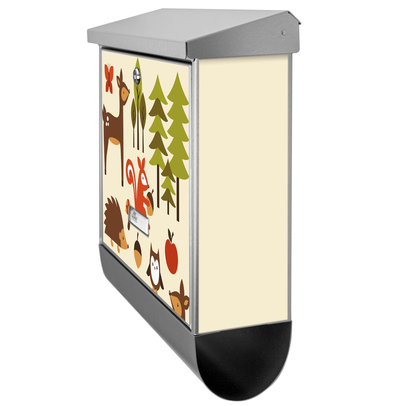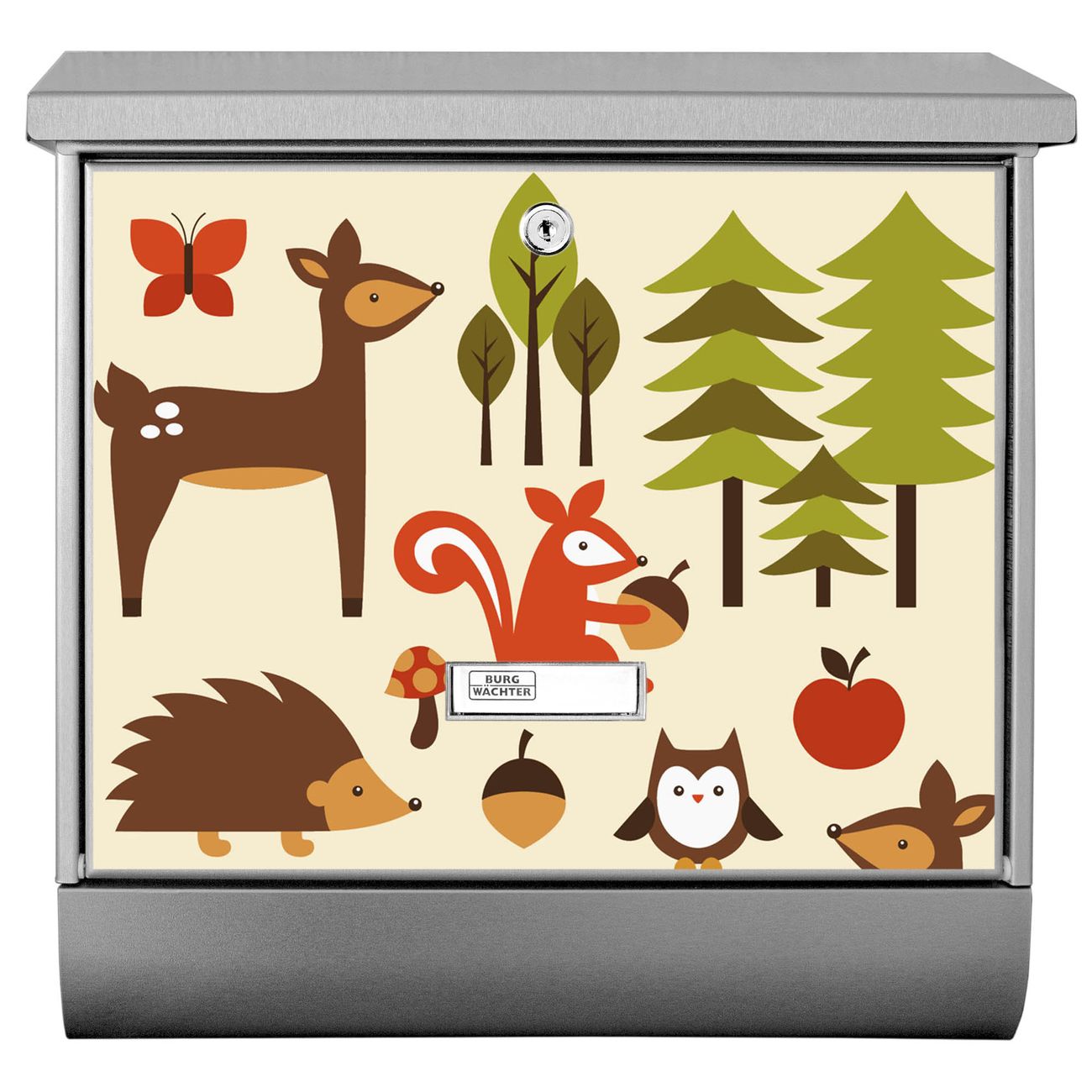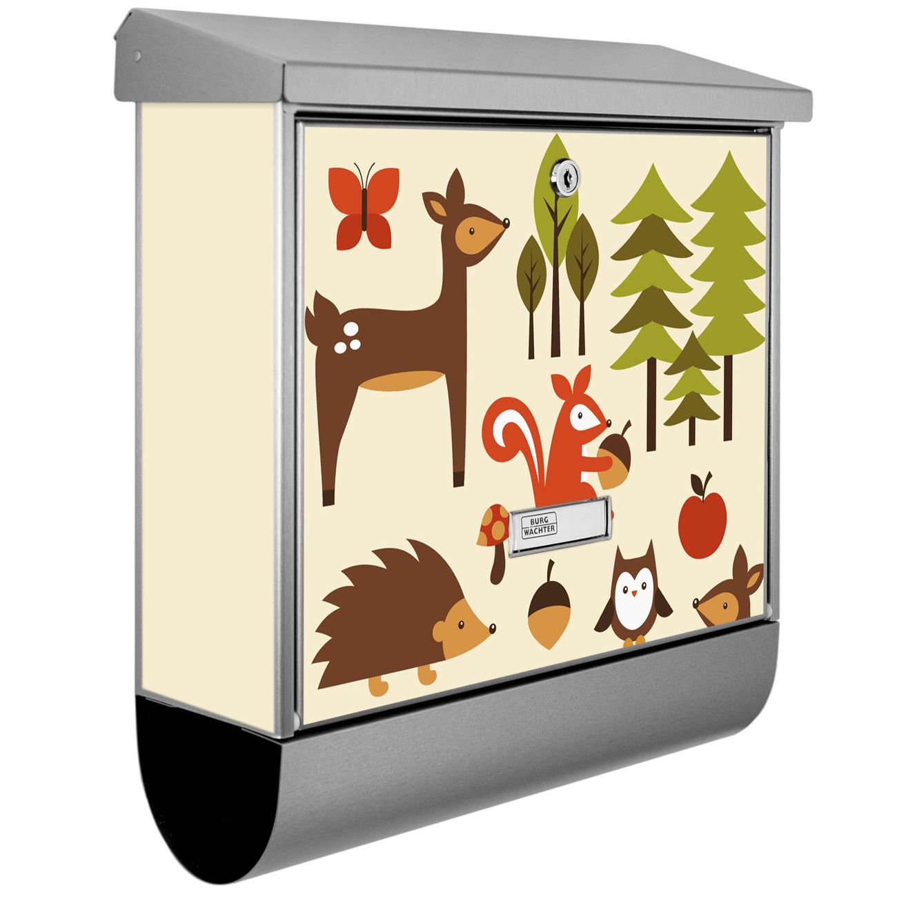 Der BURG-WÄCHTER Edelstahl Briefkasten mit Motiv Waldfreunde und Zeitungsrolle bietet Ihnen mit seinem Fassungsvermögen genügend Platz auch für große A4 Sendungen und Zeitschriften. Das integrierte Regendach schützt Ihre Post vor dem Eindringen von Regen.