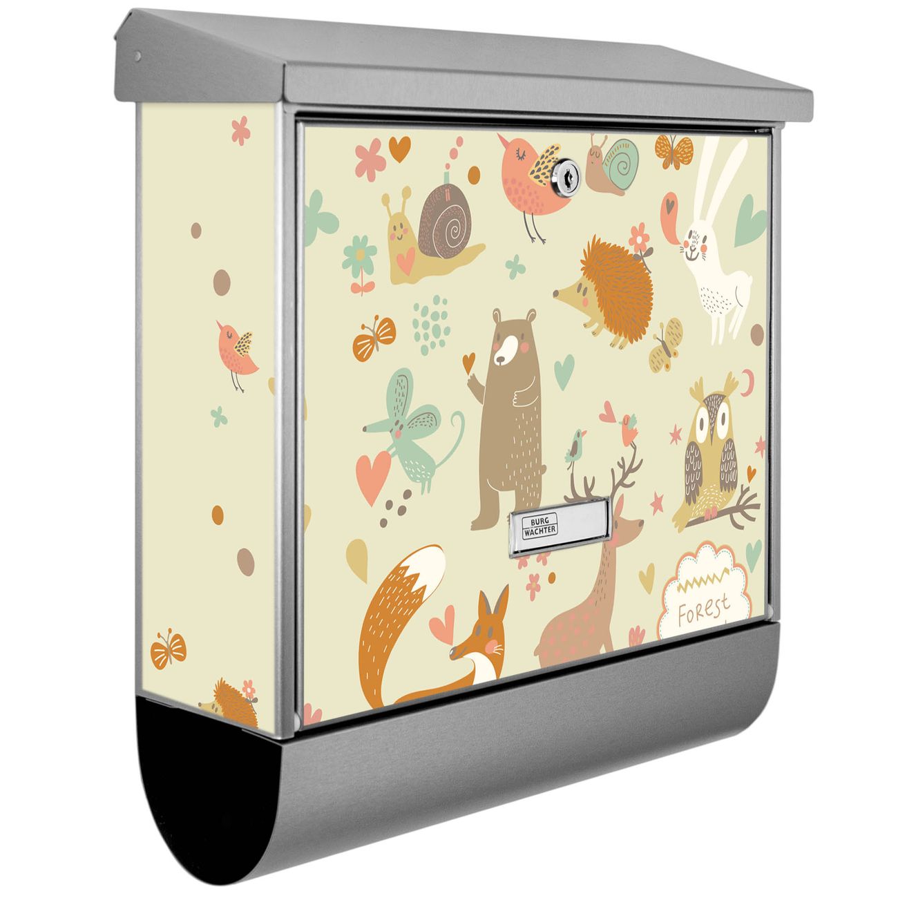 Der BURG-WÄCHTER Edelstahl Briefkasten mit Motiv Waldtiere und Zeitungsrolle bietet Ihnen mit seinem Fassungsvermögen genügend Platz auch für große A4 Sendungen und Zeitschriften. Das integrierte Regendach schützt Ihre Post vor dem Eindringen von Regen.