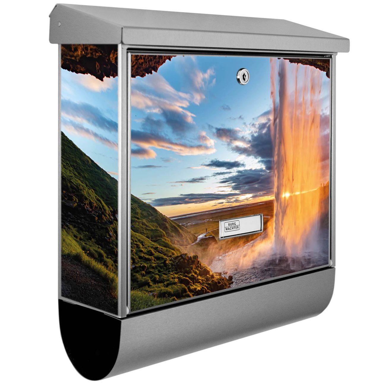 Der BURG-WÄCHTER Edelstahl Briefkasten mit Motiv Wasserfall im Sonnenlicht und Zeitungsrolle bietet Ihnen mit seinem Fassungsvermögen genügend Platz auch für große A4 Sendungen und Zeitschriften. Das integrierte Regendach schützt Ihre Post vor dem Eindringen von Regen.