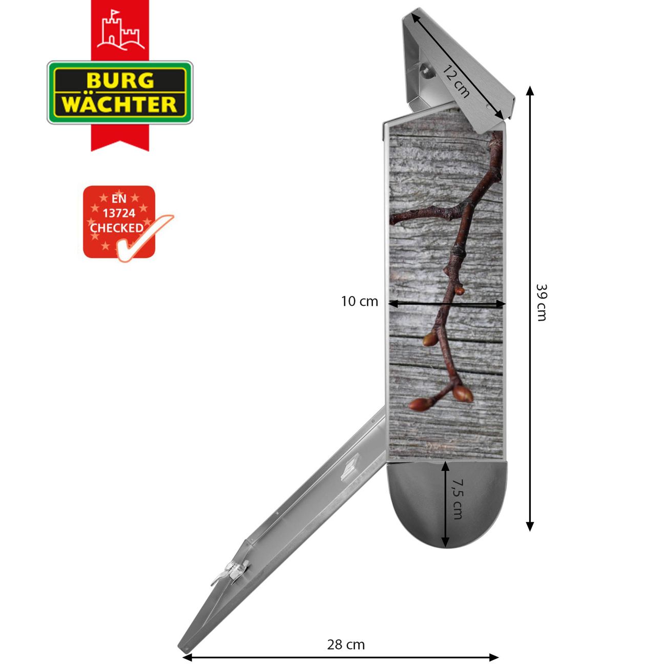 Der BURG-WÄCHTER Edelstahl Briefkasten mit Motiv Weihnachtsstern und Zeitungsrolle bietet Ihnen mit seinem Fassungsvermögen genügend Platz auch für große A4 Sendungen und Zeitschriften. Das integrierte Regendach schützt Ihre Post vor dem Eindringen von Regen.