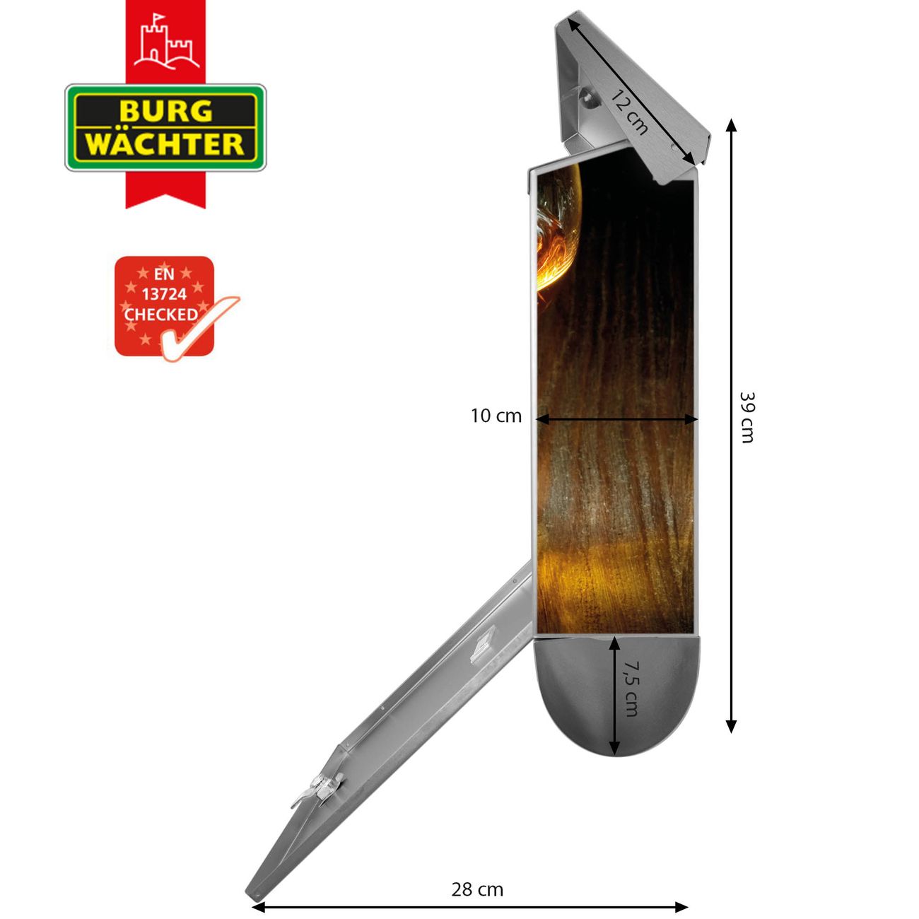 Der BURG-WÄCHTER Edelstahl Briefkasten mit Motiv Whiskey & Cigar und Zeitungsrolle bietet Ihnen mit seinem Fassungsvermögen genügend Platz auch für große A4 Sendungen und Zeitschriften. Das integrierte Regendach schützt Ihre Post vor dem Eindringen von Regen.