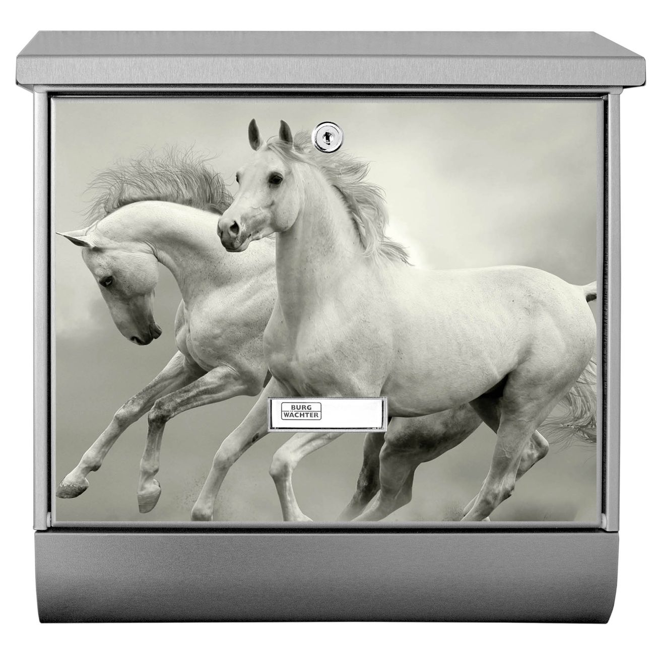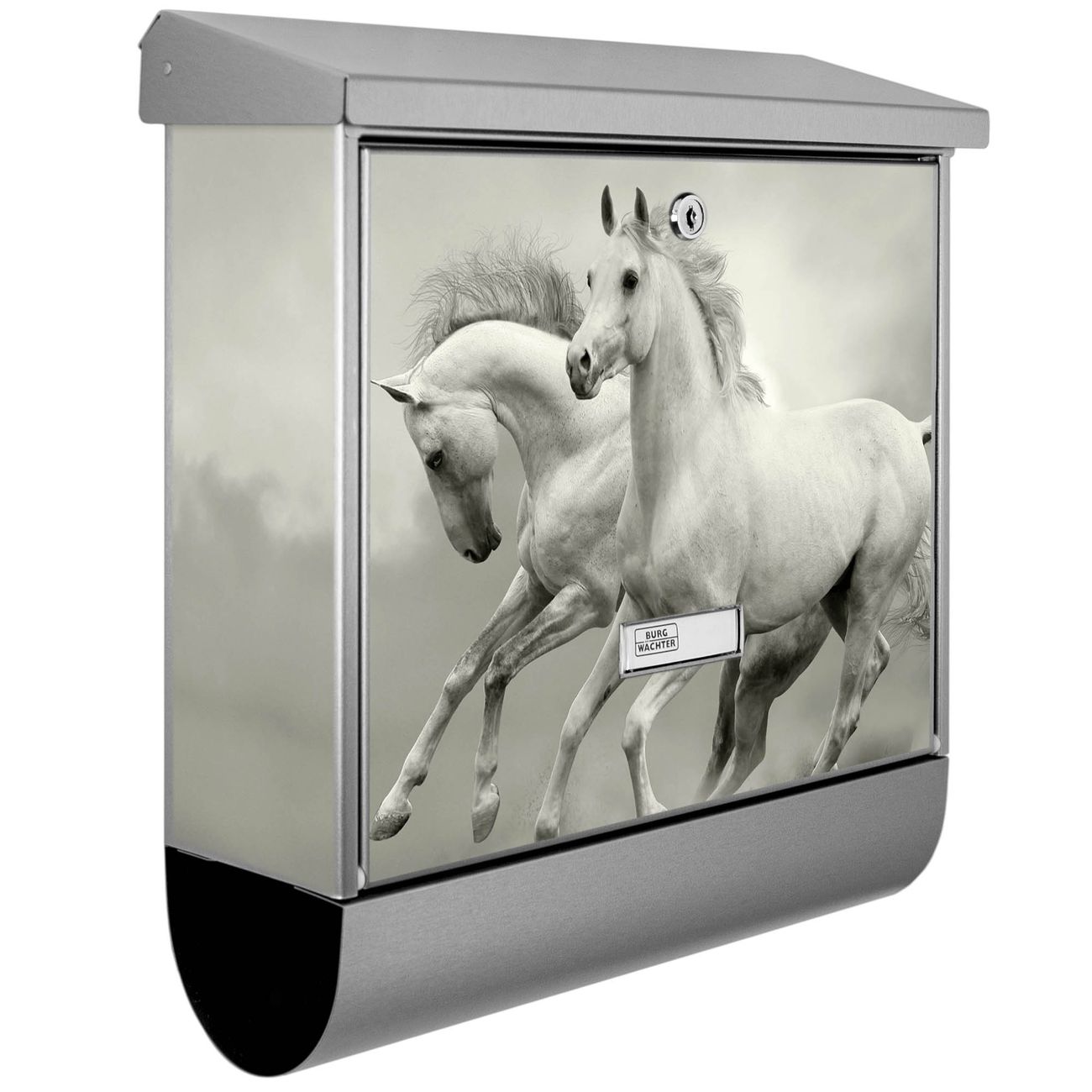Der BURG-WÄCHTER Edelstahl Briefkasten mit Motiv Wilde Pferde SW und Zeitungsrolle bietet Ihnen mit seinem Fassungsvermögen genügend Platz auch für große A4 Sendungen und Zeitschriften. Das integrierte Regendach schützt Ihre Post vor dem Eindringen von Regen.