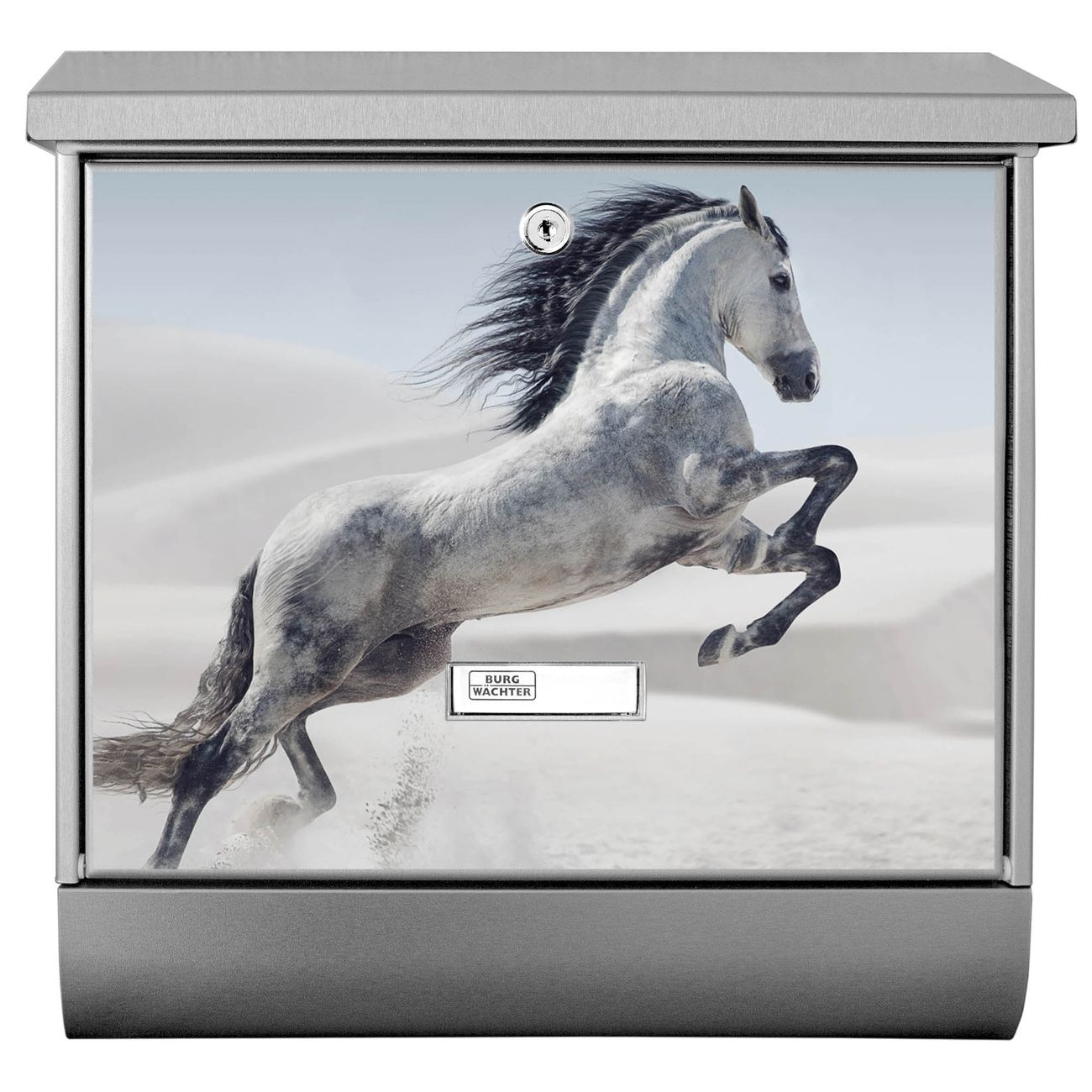 Der BURG-WÄCHTER Edelstahl Briefkasten mit Motiv Wildes Pferd und Zeitungsrolle bietet Ihnen mit seinem Fassungsvermögen genügend Platz auch für große A4 Sendungen und Zeitschriften. Das integrierte Regendach schützt Ihre Post vor dem Eindringen von Regen.