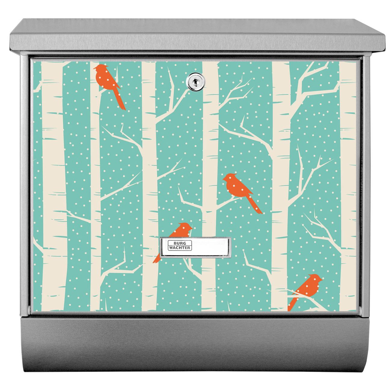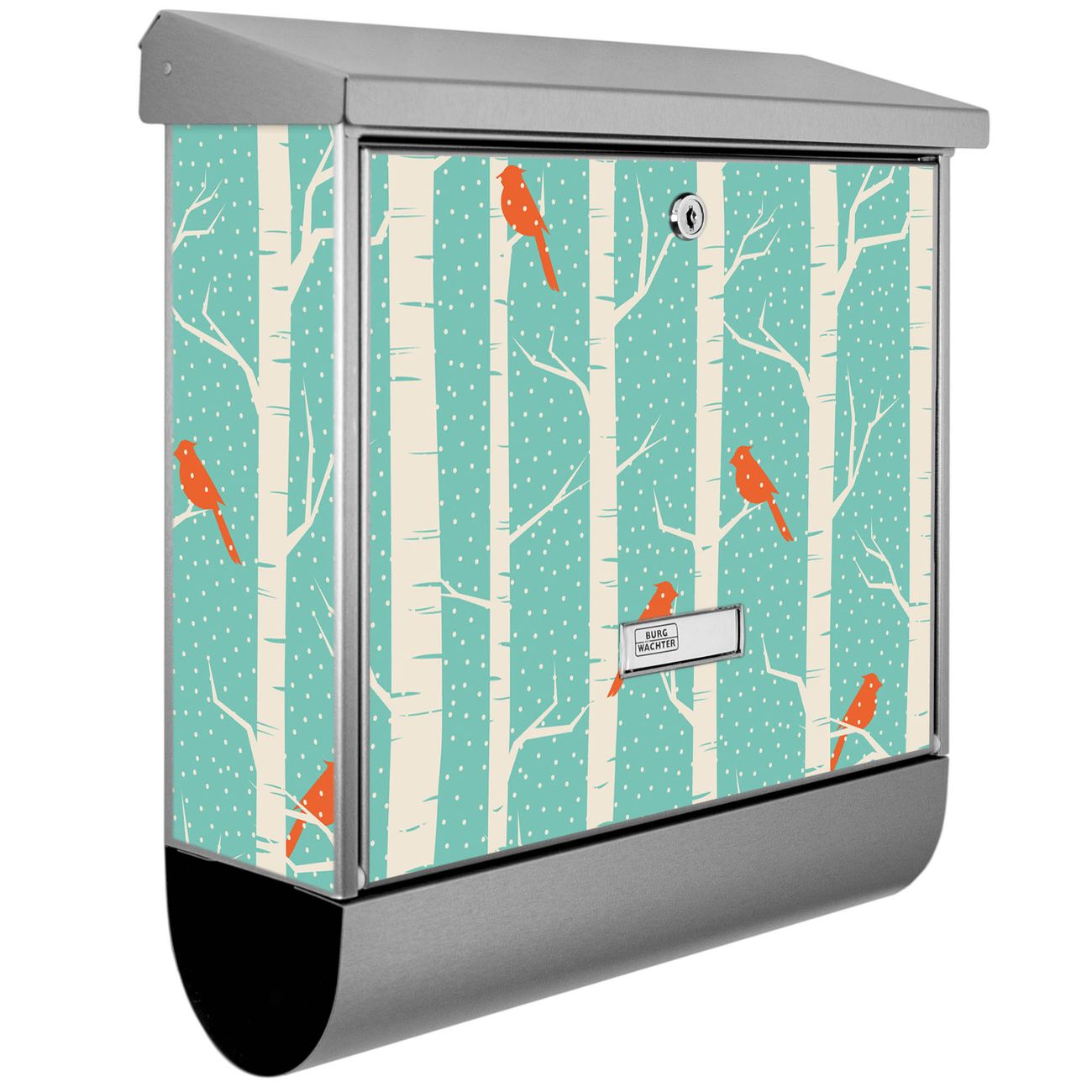 Der BURG-WÄCHTER Edelstahl Briefkasten mit Motiv Wintervögel und Zeitungsrolle bietet Ihnen mit seinem Fassungsvermögen genügend Platz auch für große A4 Sendungen und Zeitschriften. Das integrierte Regendach schützt Ihre Post vor dem Eindringen von Regen.